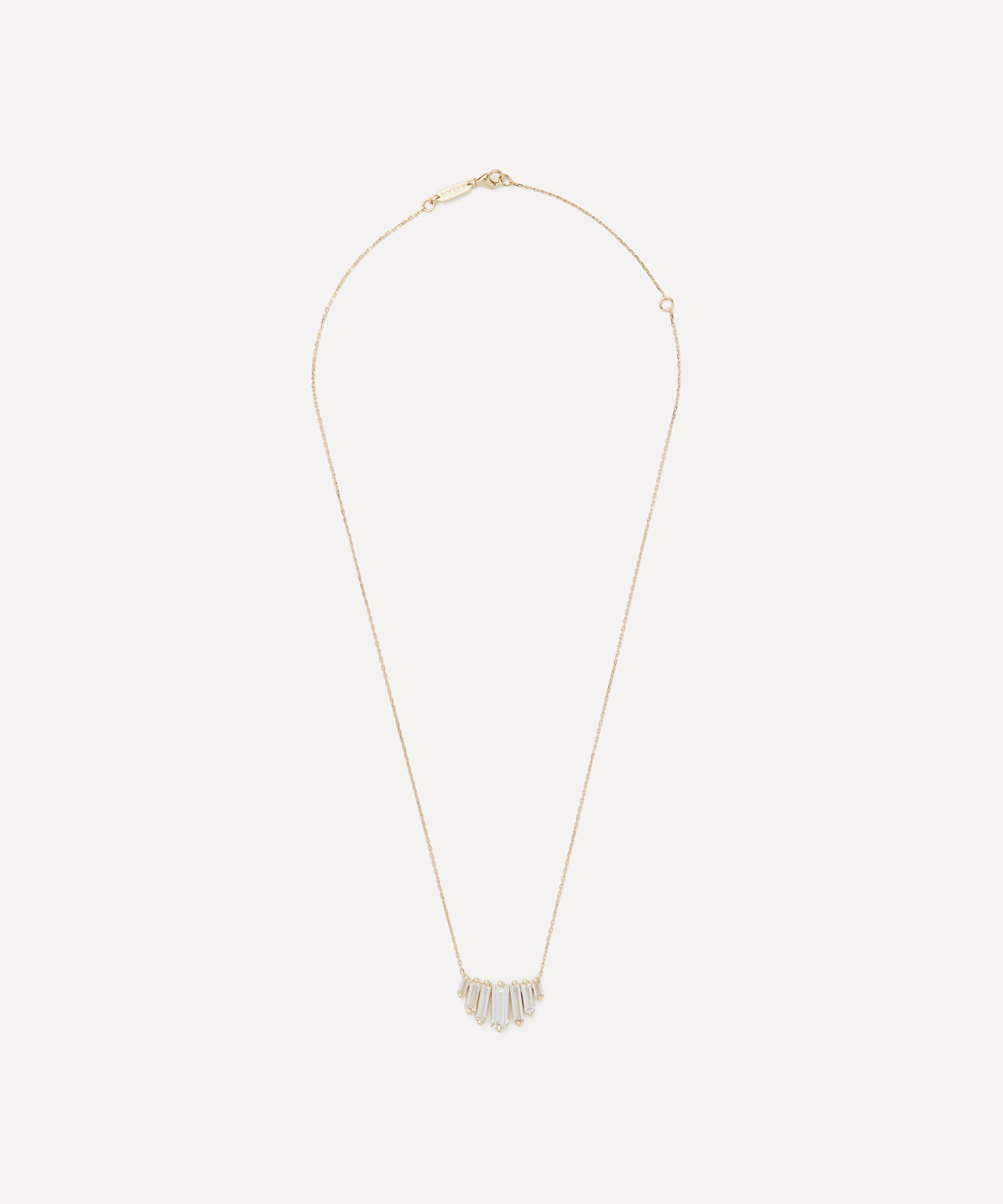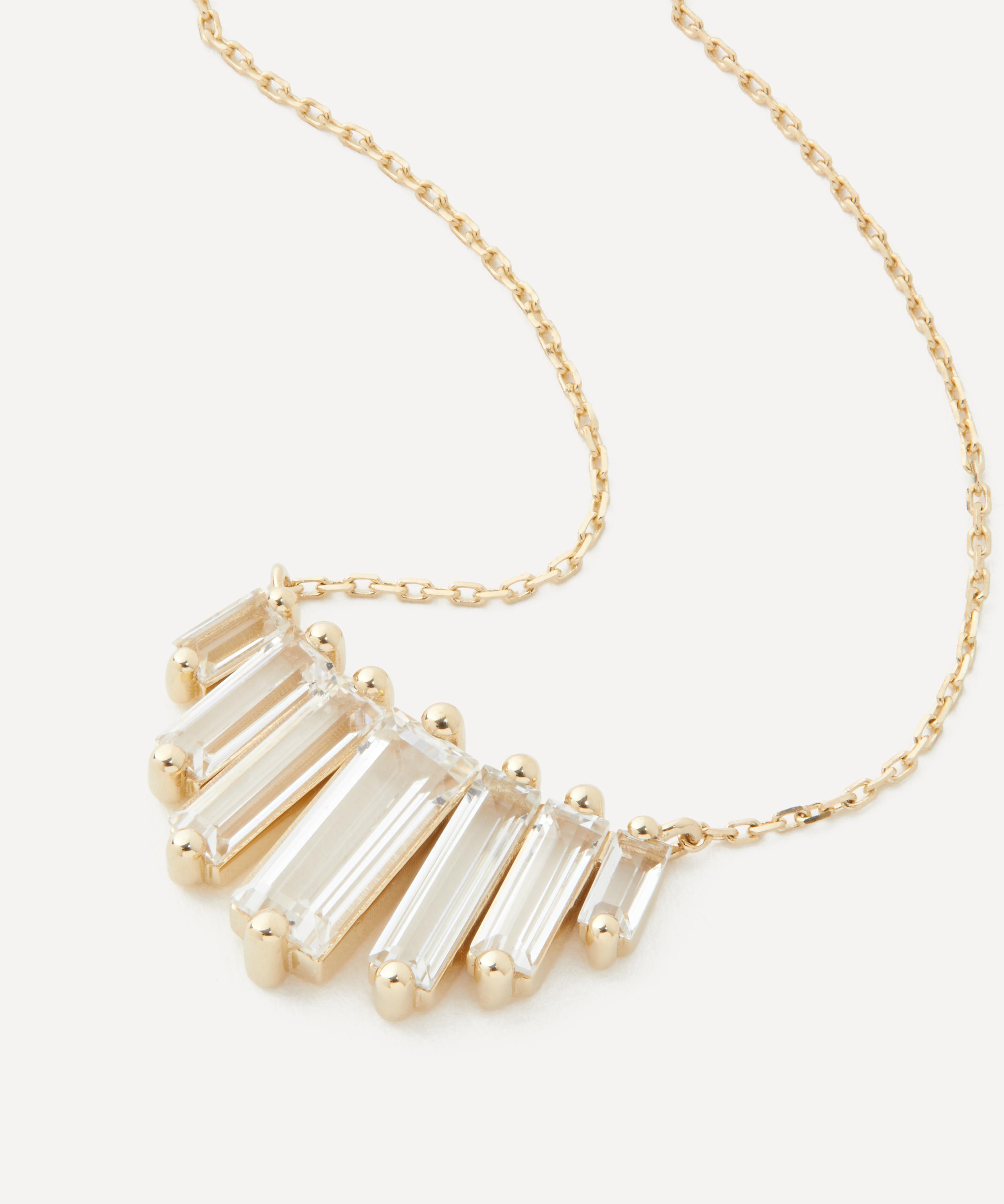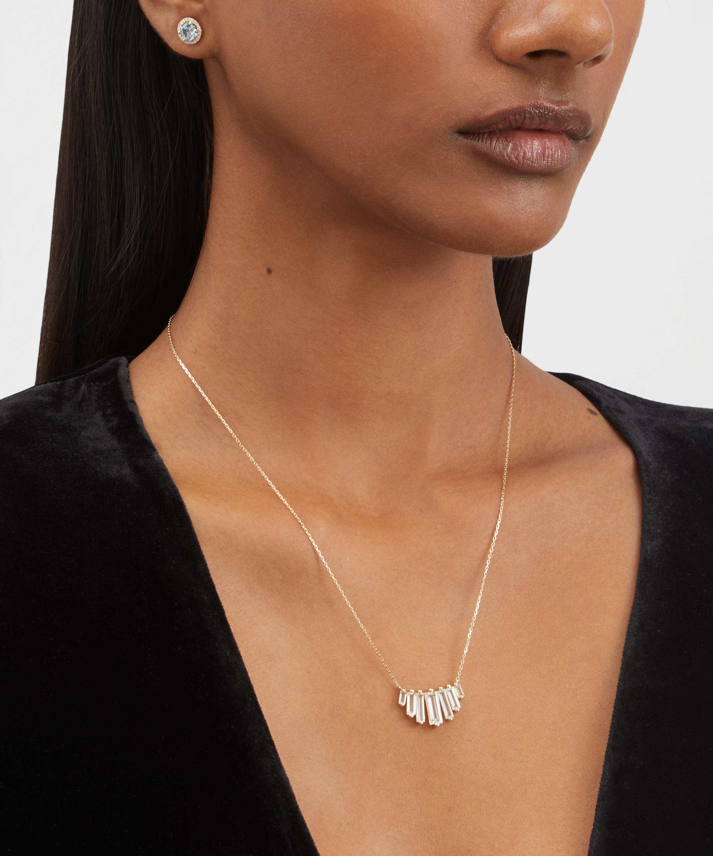 Add subtle sparkle to everyday looks with this pendant necklace from Suzanne Kalan. Exemplifying the designer's contemporary approach to traditional fine jewellery design, it features five white topaz stones in a graduating, fan-like silhouette. Complete with a fine trace chains, it can be styled solo, or mixed and matched with the designer's other gemstone encrusted pieces for an unforgettable cocktail hour curation.
