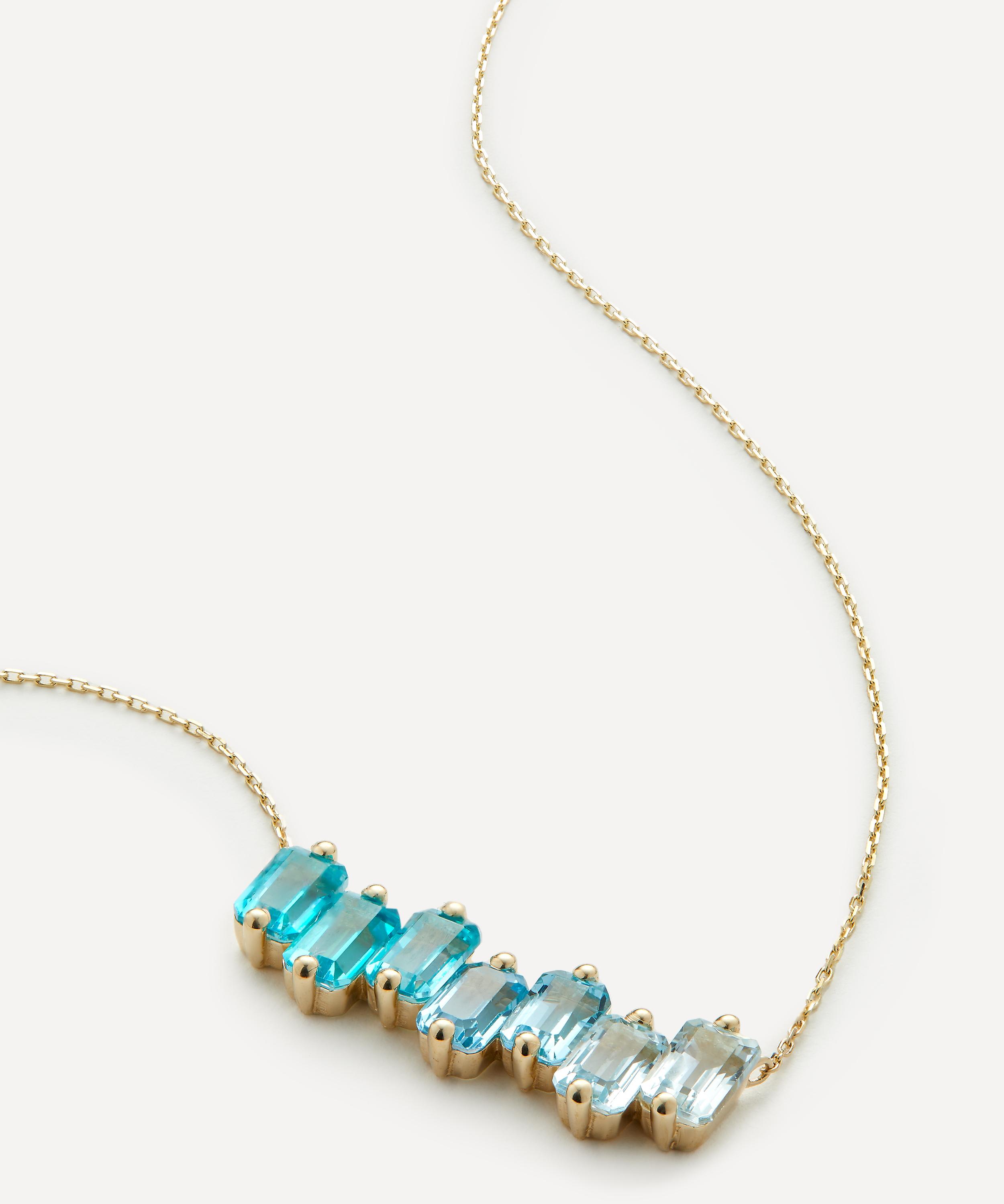 Exemplifying the designer’s contemporary approach to traditional jewellery designs, Suzanne Kalan presents this pendant necklace. Crafted from solid 14ct gold, it features a delicate link chain and zigzag bar pendant adorned with emerald cut gemstones in an ombre blue hue. Style it solo for a burst of colour day-to-day, or stack with several of the designer's other glittering pieces for an unforgettable cocktail hour curation.