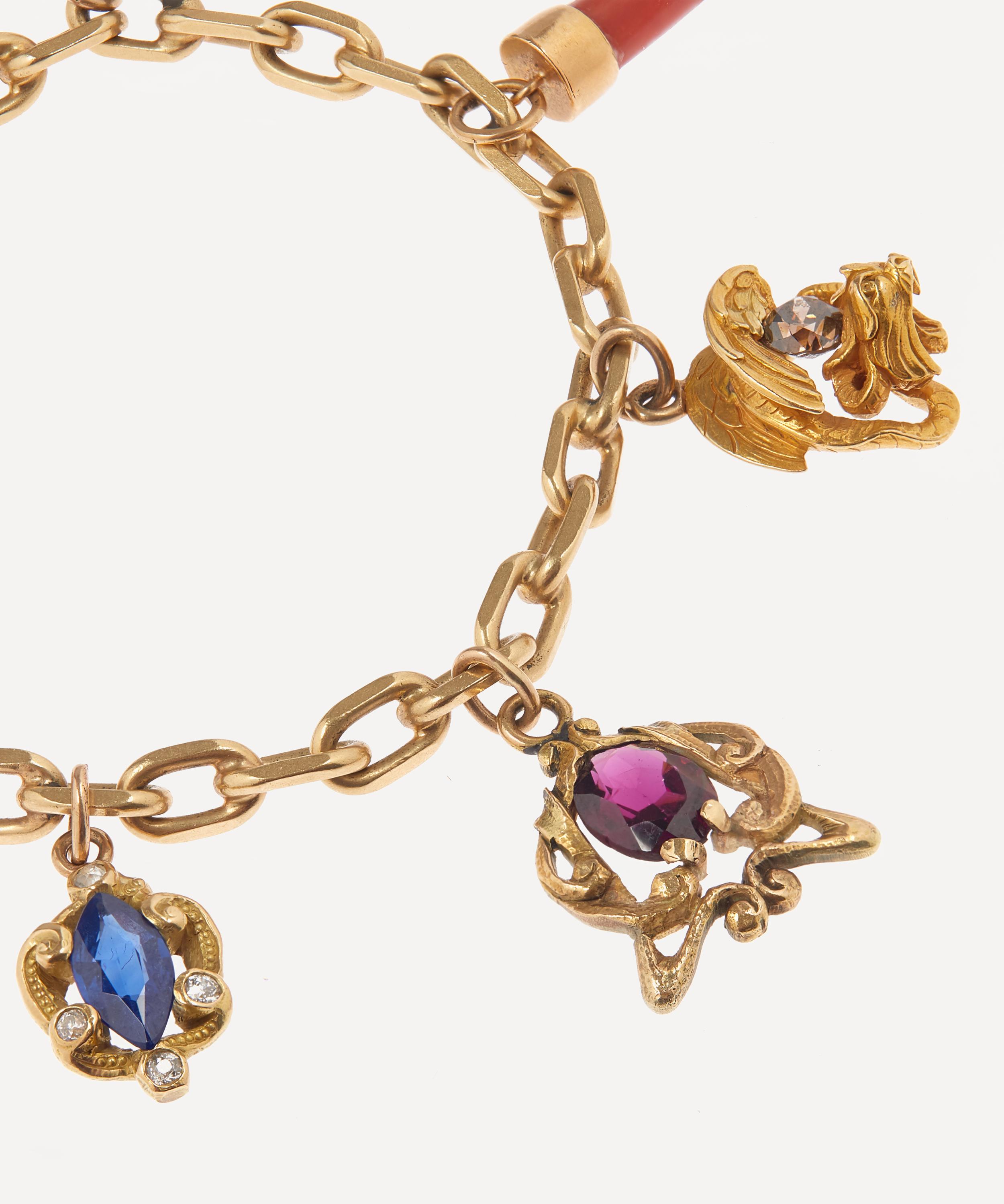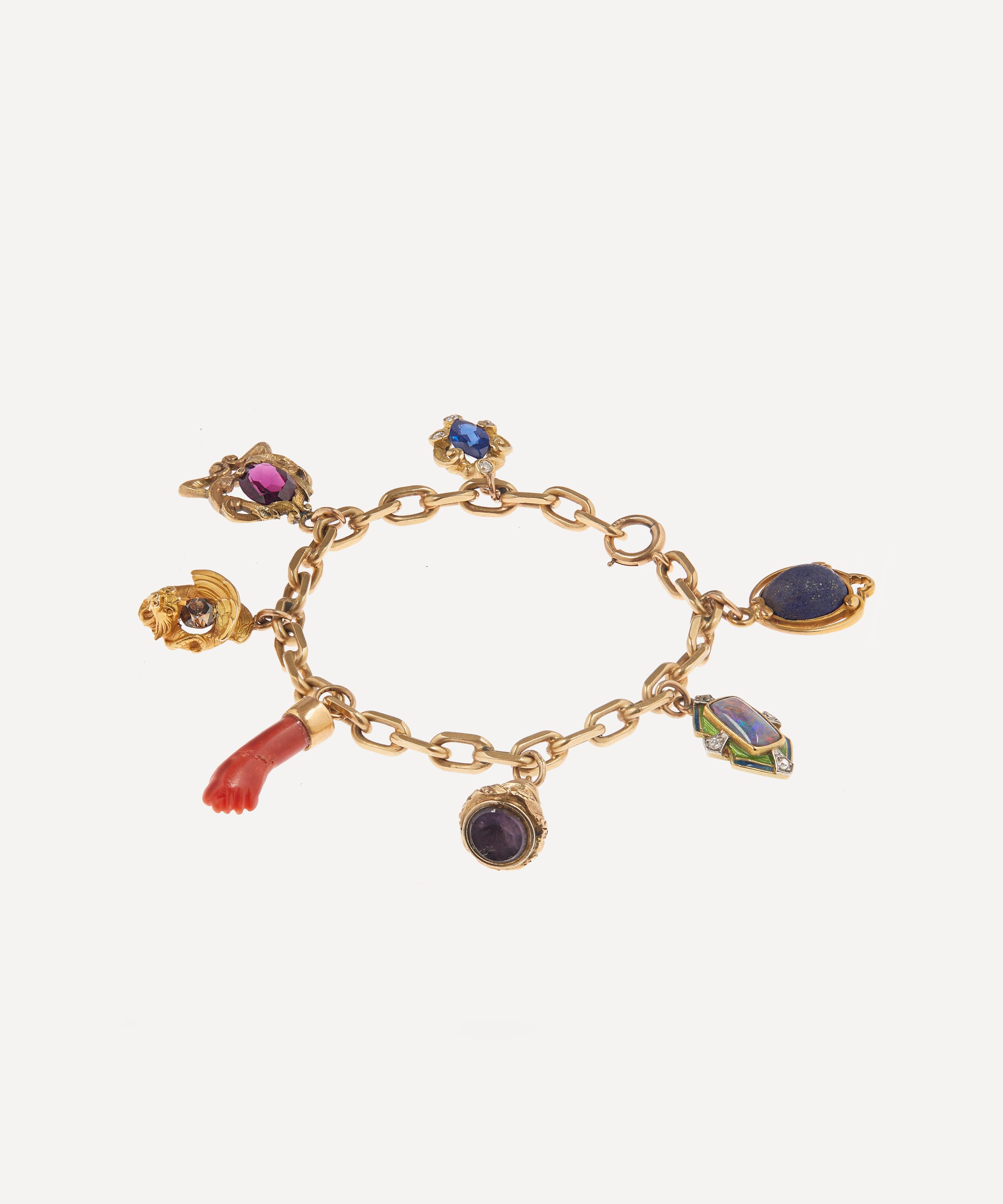 An original Art Nouveau piece dating back to the 1880s, this 14ct gold bracelet is composed of an antique chain adorned with several Victorian charms: An Art Nouveau sapphire charm, set with a navette cut sapphire in a textured, gold scroll design. Within the scroll, sit four old-cut diamonds, presented in a gold bezel setting. An oval-cut garnet charm encased in gold. An antique dragon charm, set with an old-cut brown diamond in the centre of its body. A coral Figa charm, with a yellow gold cuff – representing an ancient symbol of luck and fertility. A Victorian seal charm, set with an amethyst in a decorated scroll design. A rectangular-cabochon black opal surrounded by green and blue enamel set with four old-cut diamonds in the frame. An oval-cabochon cut lapis lazuli in the centre of a gold, stylised wire framework. The bracelet is complete with a spring clasp fastening – to easily embellish the wrist with iridescent jewels. Let this piece shine on its own, or layer it additional gemstone bangles for a showstopping curation.