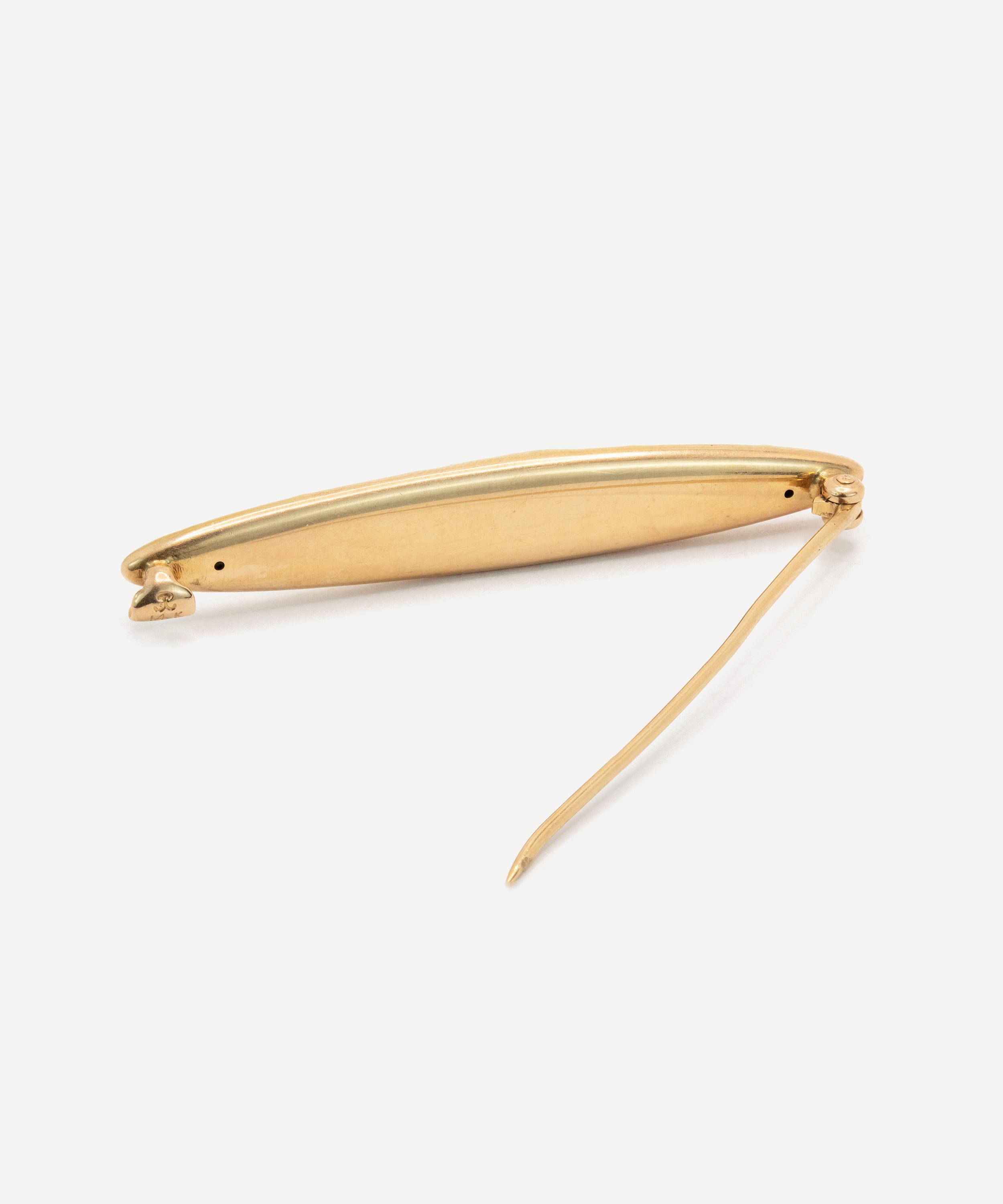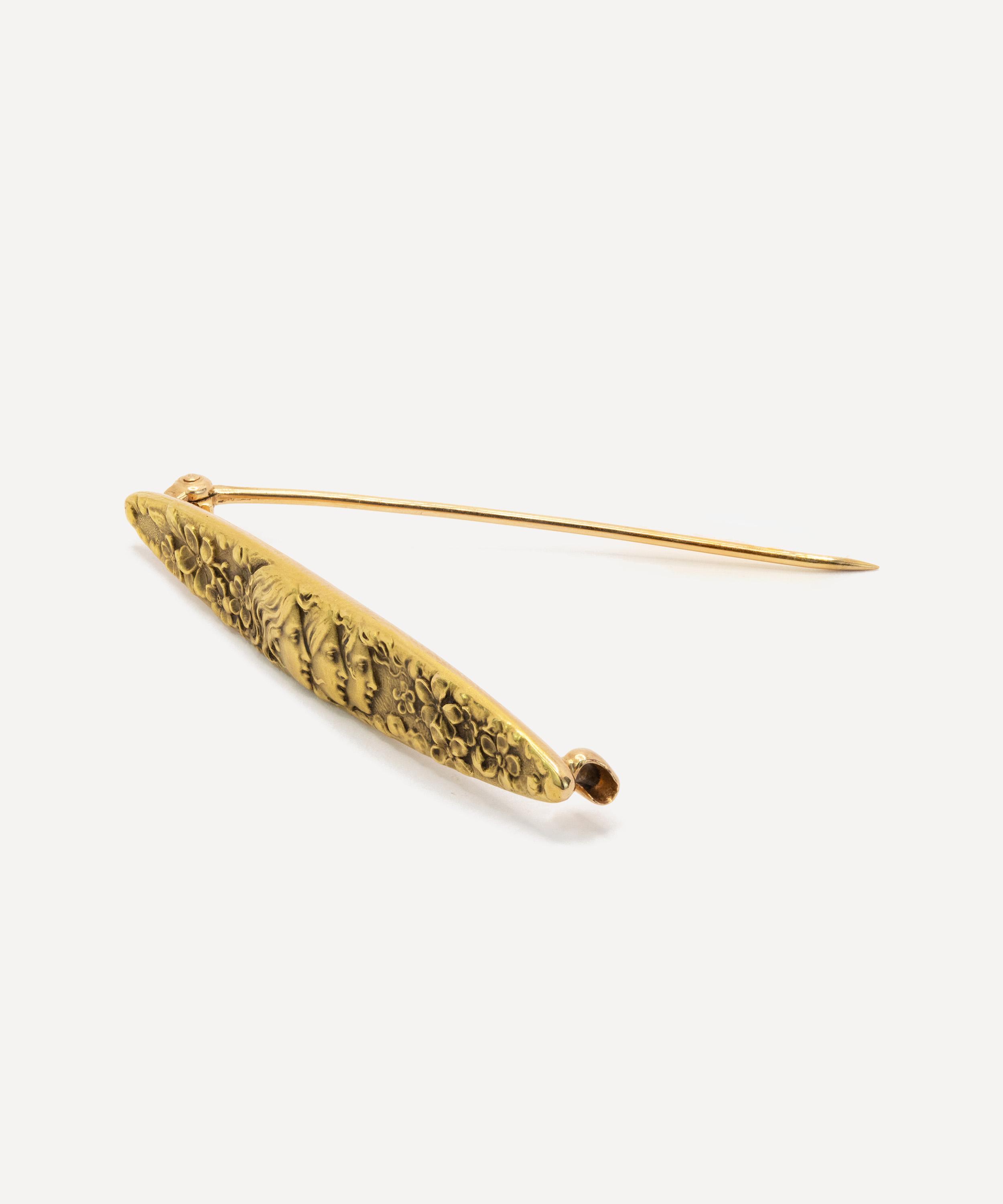 Brimming with character, this brooch boasts a standout piece from antique purveyor Kojis. Crafted from 14ct gold, it’s fashioned into a hollow, oval-shaped bar, featuring three lady faces in profile at the centre, surrounded by delicate floral motifs – reflecting flowing, organic lines characteristic of the Art Nouveau style. Wear it on the lapels of your favourite blazer or blouse and try teaming it with several other artisanal brooches and pins for a maximalist take on traditional formalwear.