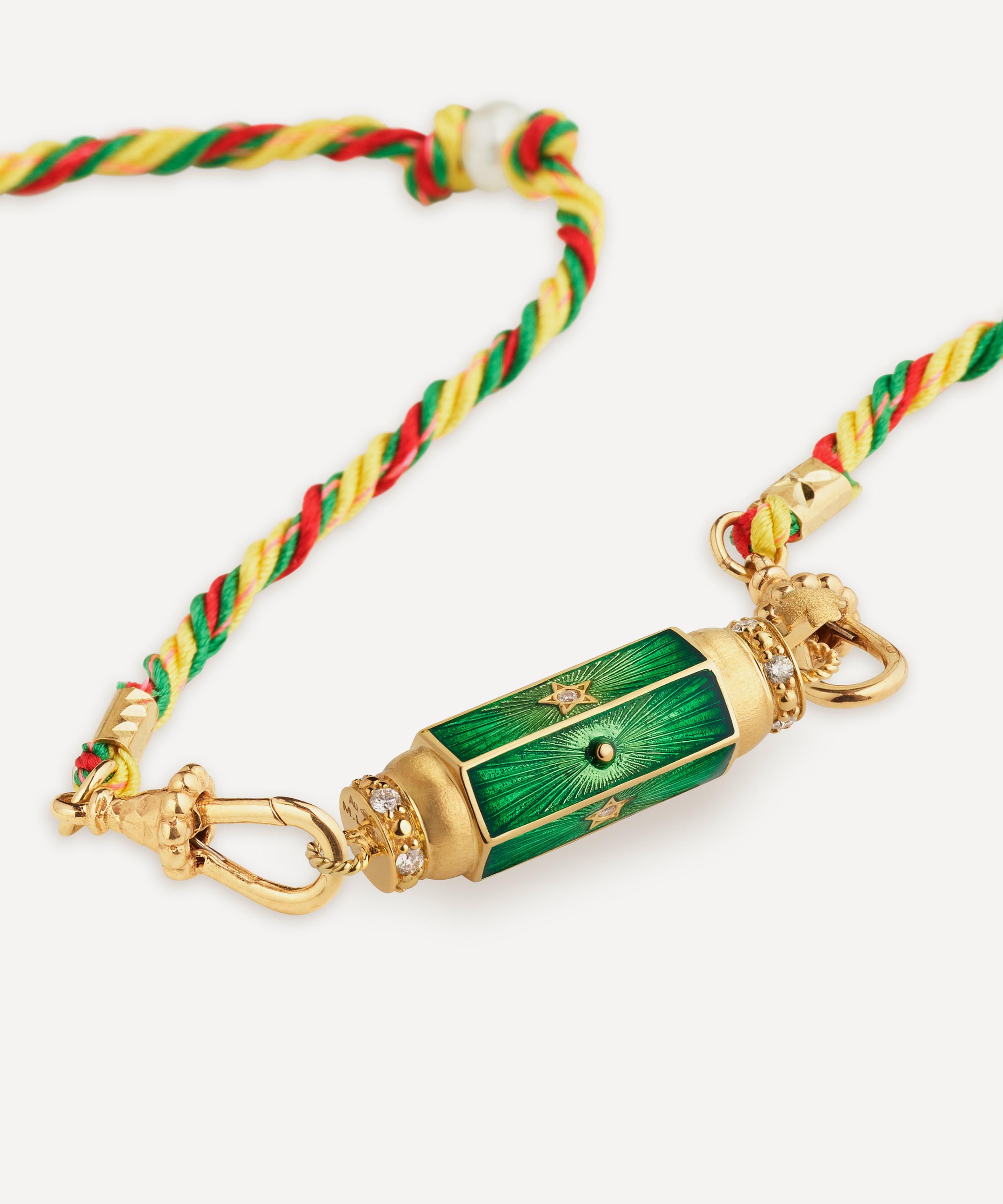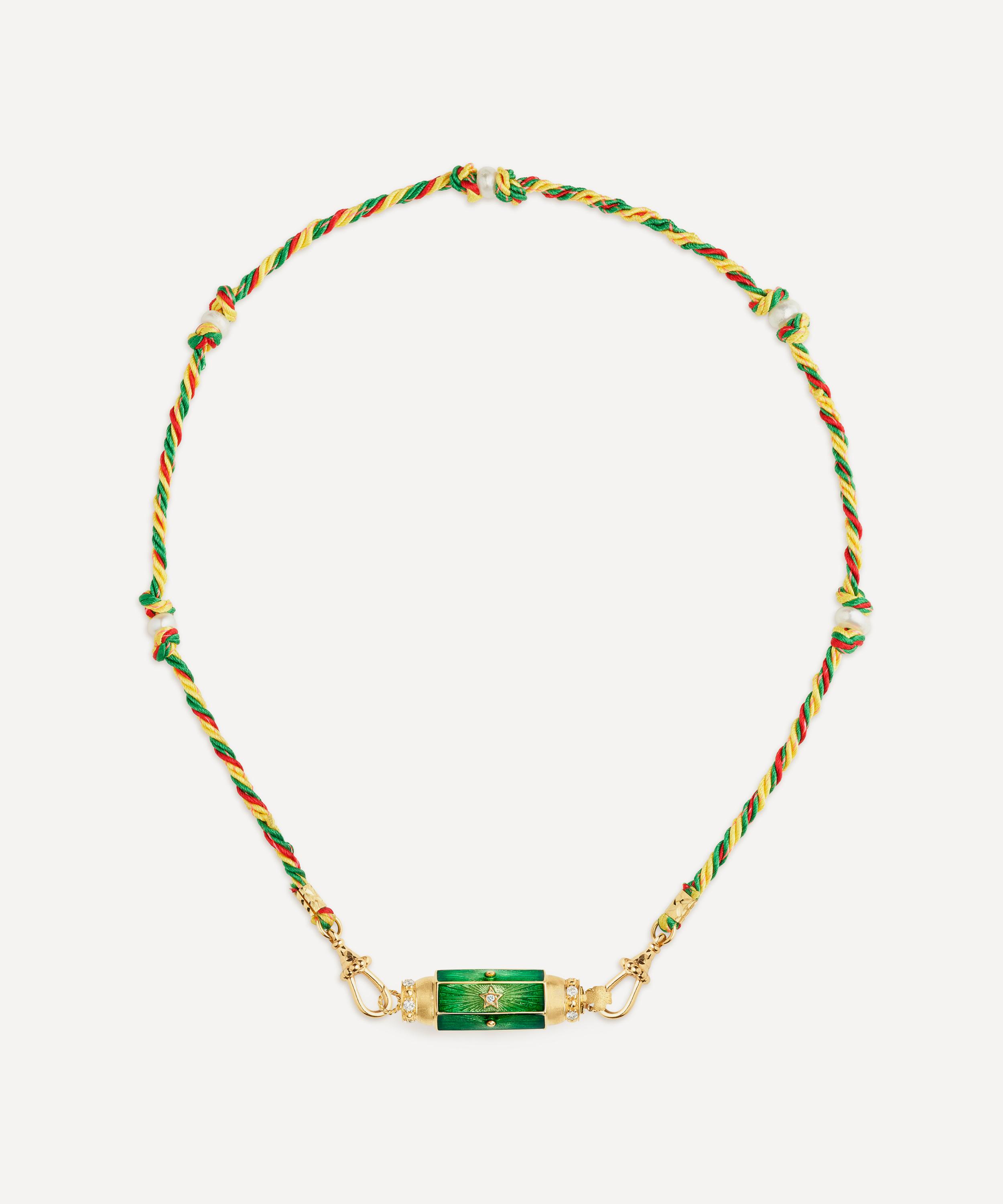 Expertly crafted from 14ct gold, this necklace features a Mauli link with freshwater pearls and a handcuff finish at each end. At the centre hangs a small barrel pendant featuring gradient orange enamel, sparkling diamonds and a diamond set star accent.
