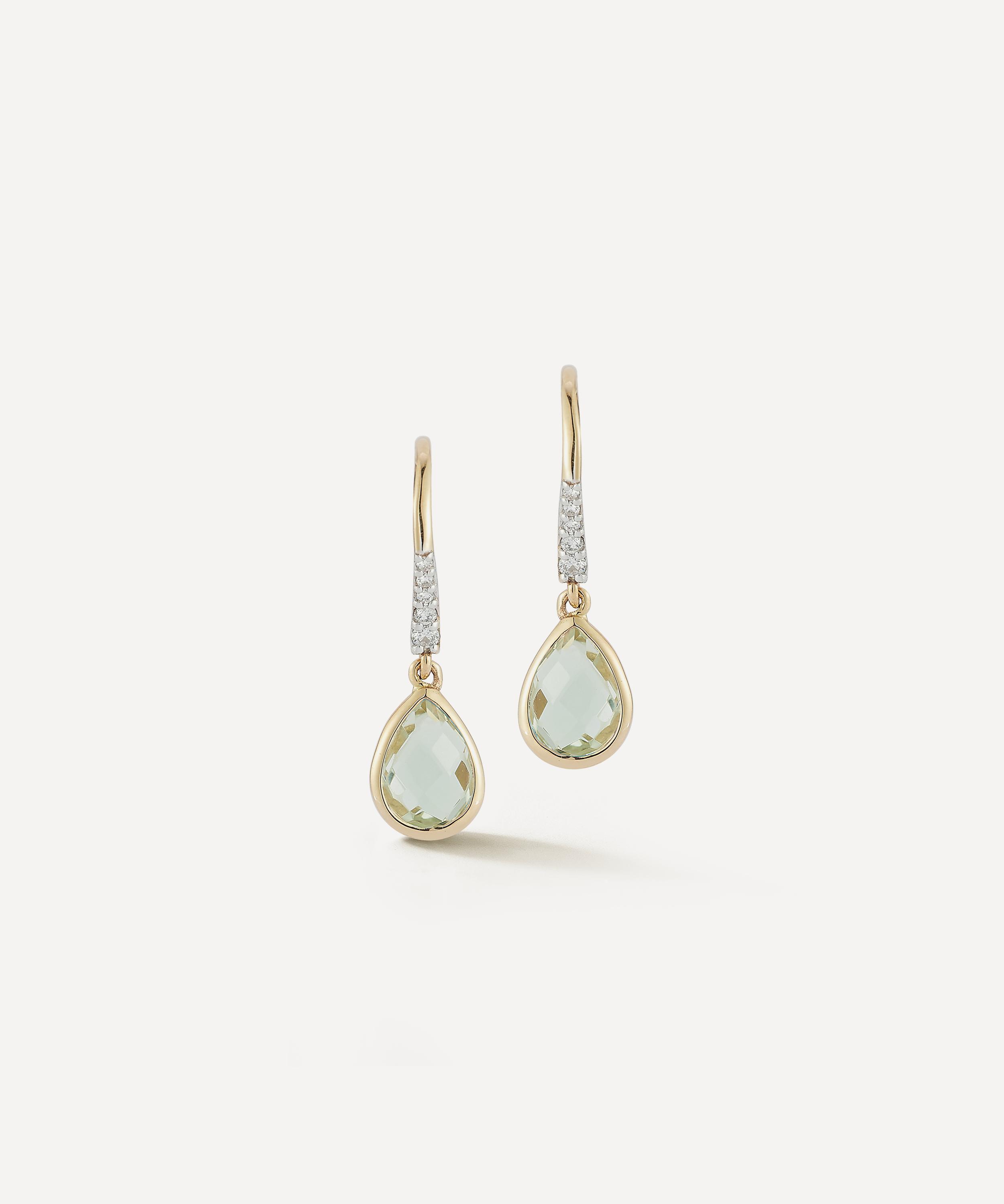 Elevate your ensemble with these sophisticated drop earrings from Mateo. Crafted from 14ct gold, each earring features a faceted pear-shaped green amethyst, gently suspended from an ear wire adorned with pavé diamonds. Adding an eye-catching element to your line-up, their minimal design makes them perfect for everyday wear, while their refined pop of colour ensures they can shine bright on any occasion. Whether stacked with other earrings or worn alone, they're a refined addition to any jewellery collection.