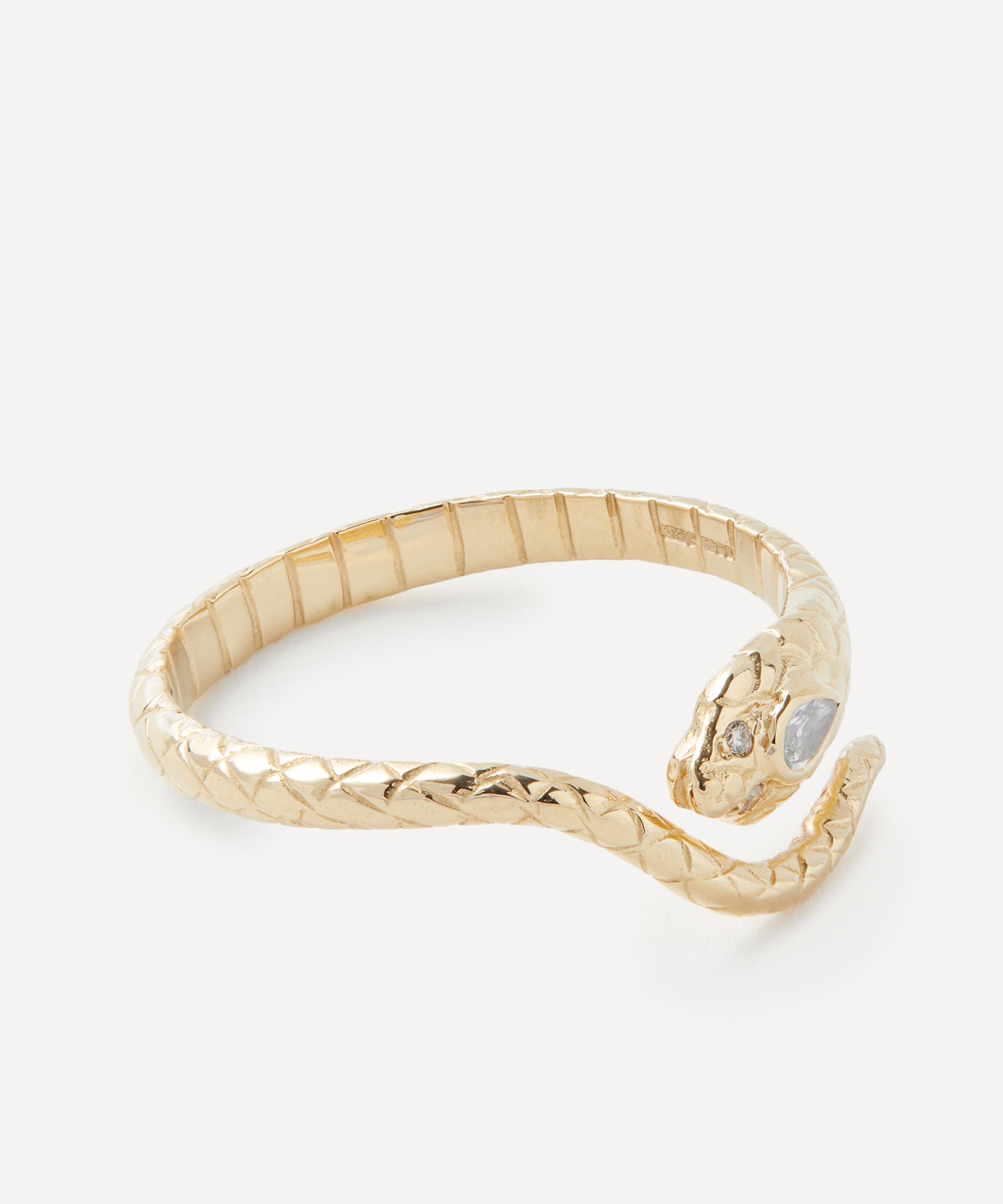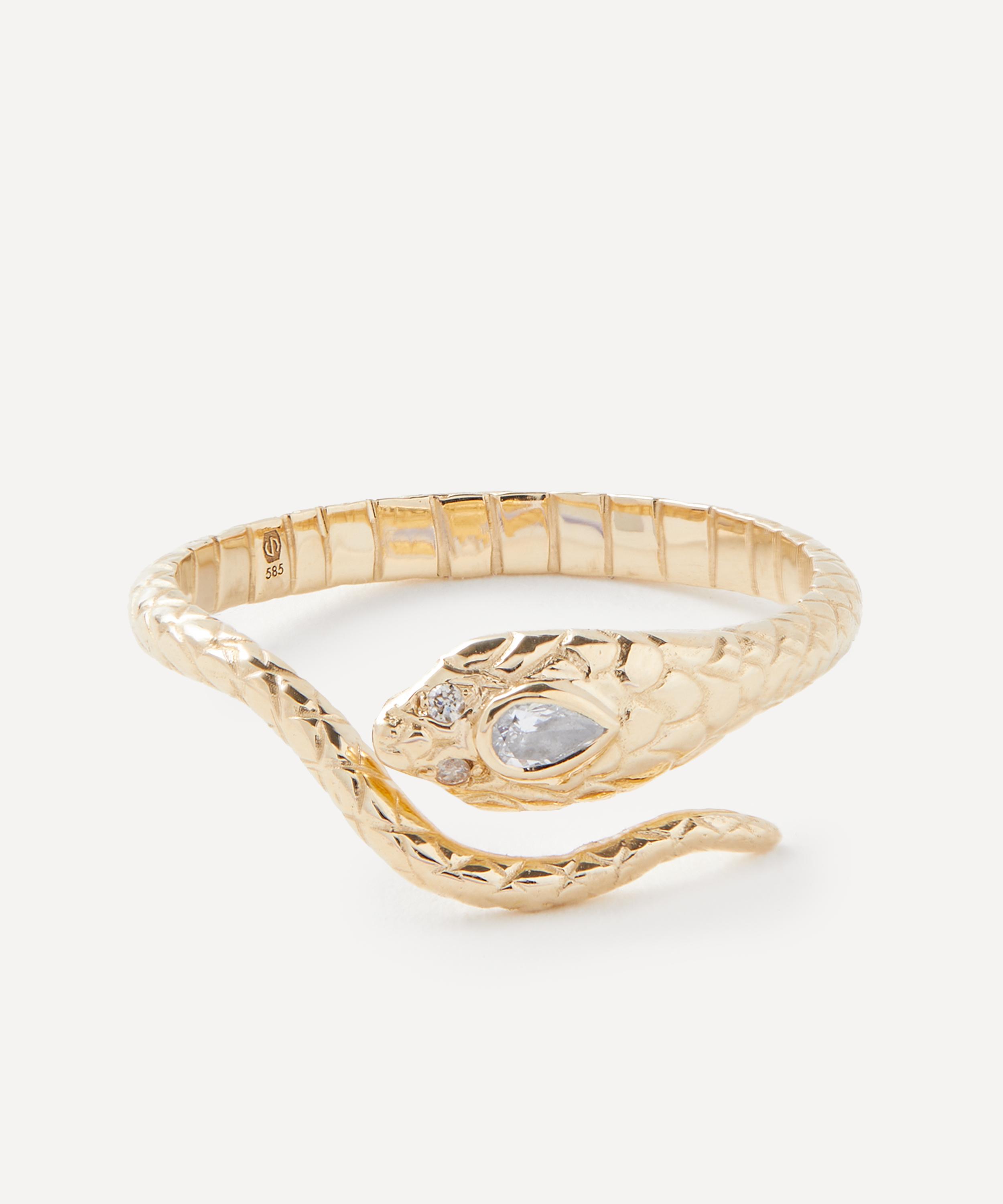 Complete styled looks and draw on the spiritual energy of gemstones through this unique and symbolic ring by Celine Daoust. Inspired by ancient Egyptian culture, it takes the shape of an intricately textured cobra in solid 14ct gold – the snake represents reincarnation, immortality and purity. Beautifully elevated by a diamond set eye and two smaller diamonds, it radiates with totemic energy. Wear this stunning piece solo or stacked.