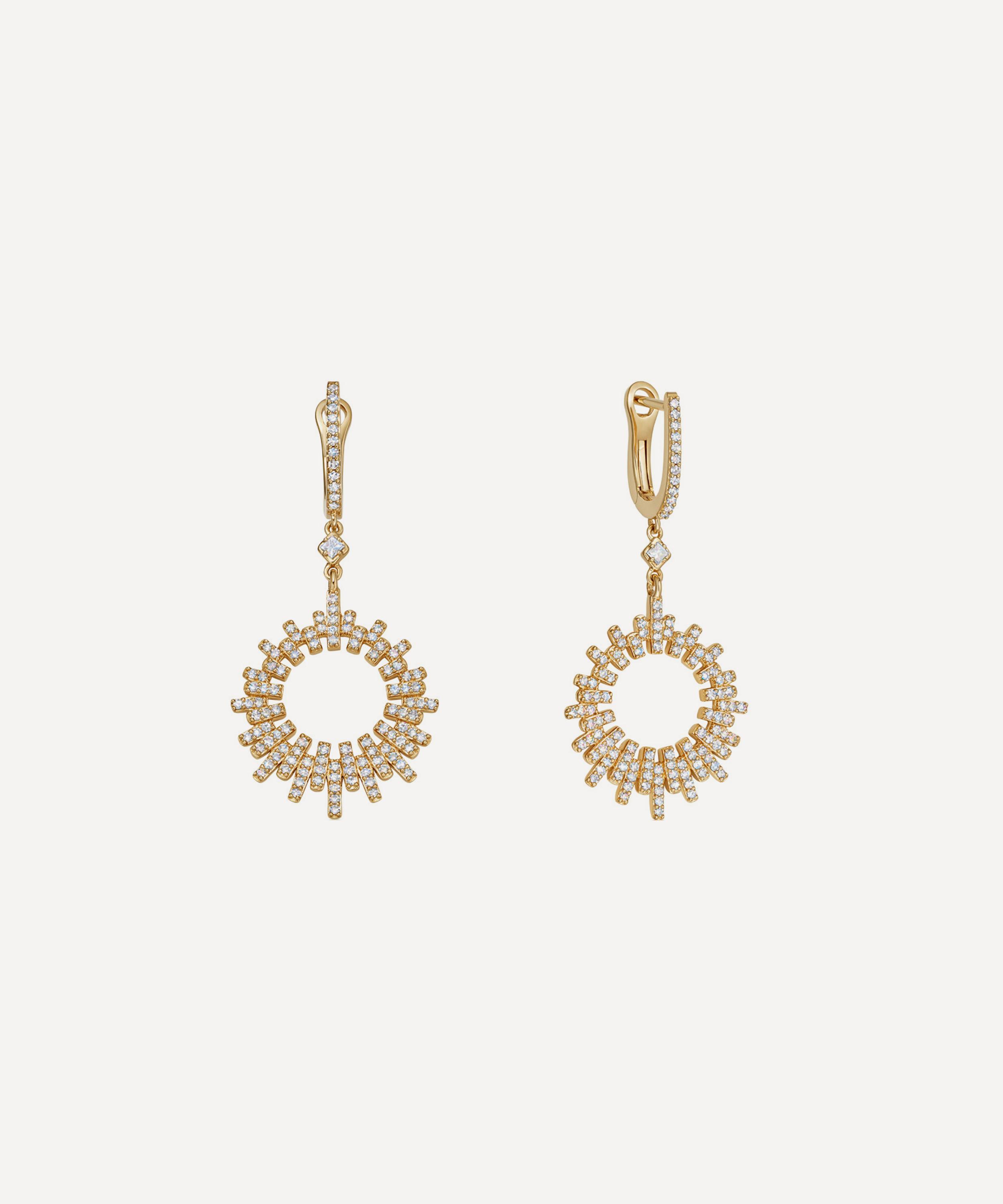 Suspended from a delicate diamond-encrusted hoop, each of these earrings features a radiant comet burst drop charm that's set with clustered rows of single cut white diamonds for a mesmerising celestial sparkle. Designed for endless mixing and matching, try teaming them with the Comet Burst pendant necklace or an array of coordinating Comet studs for a luxe take on trend-led layering that will elevate any special occasion look.