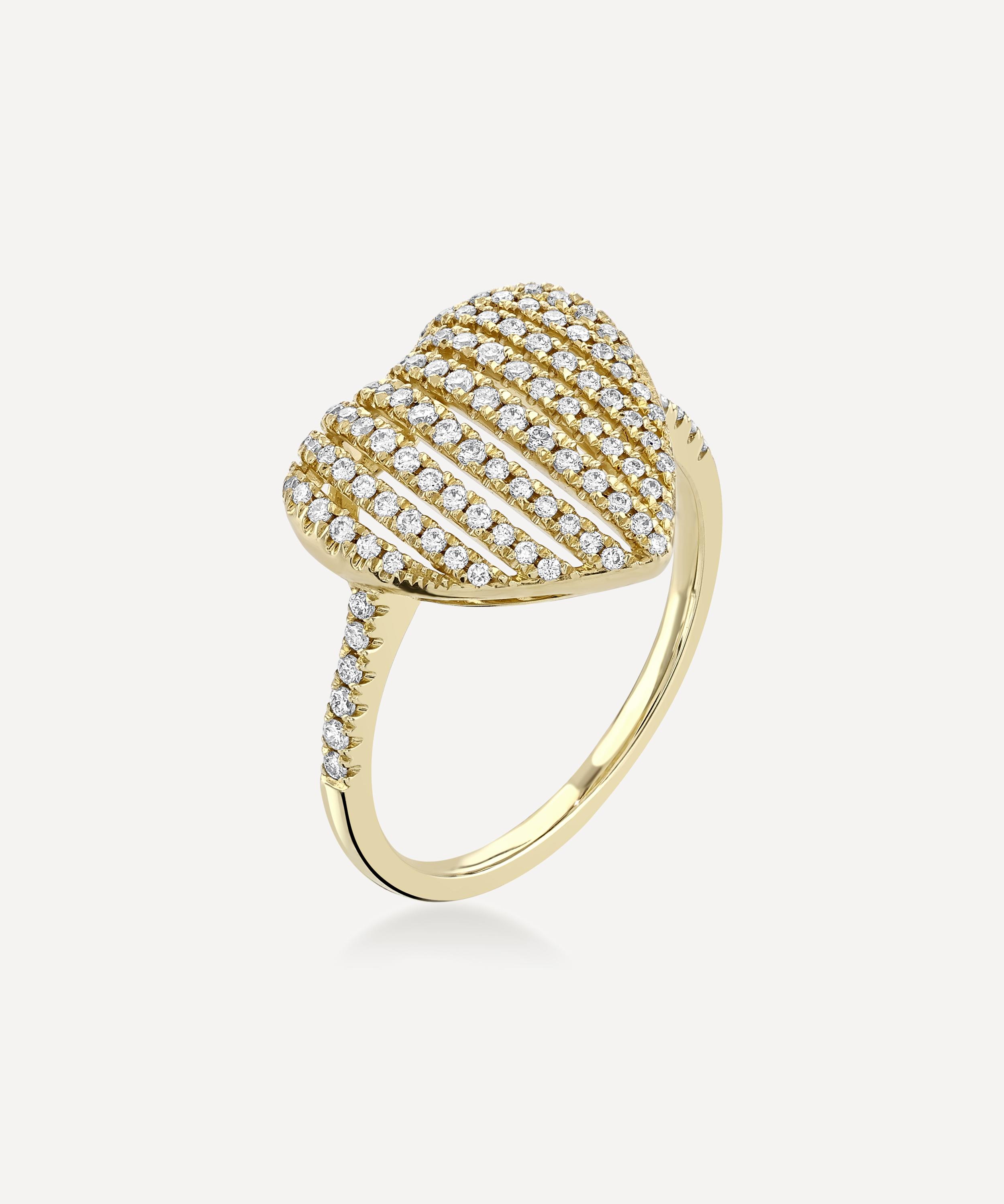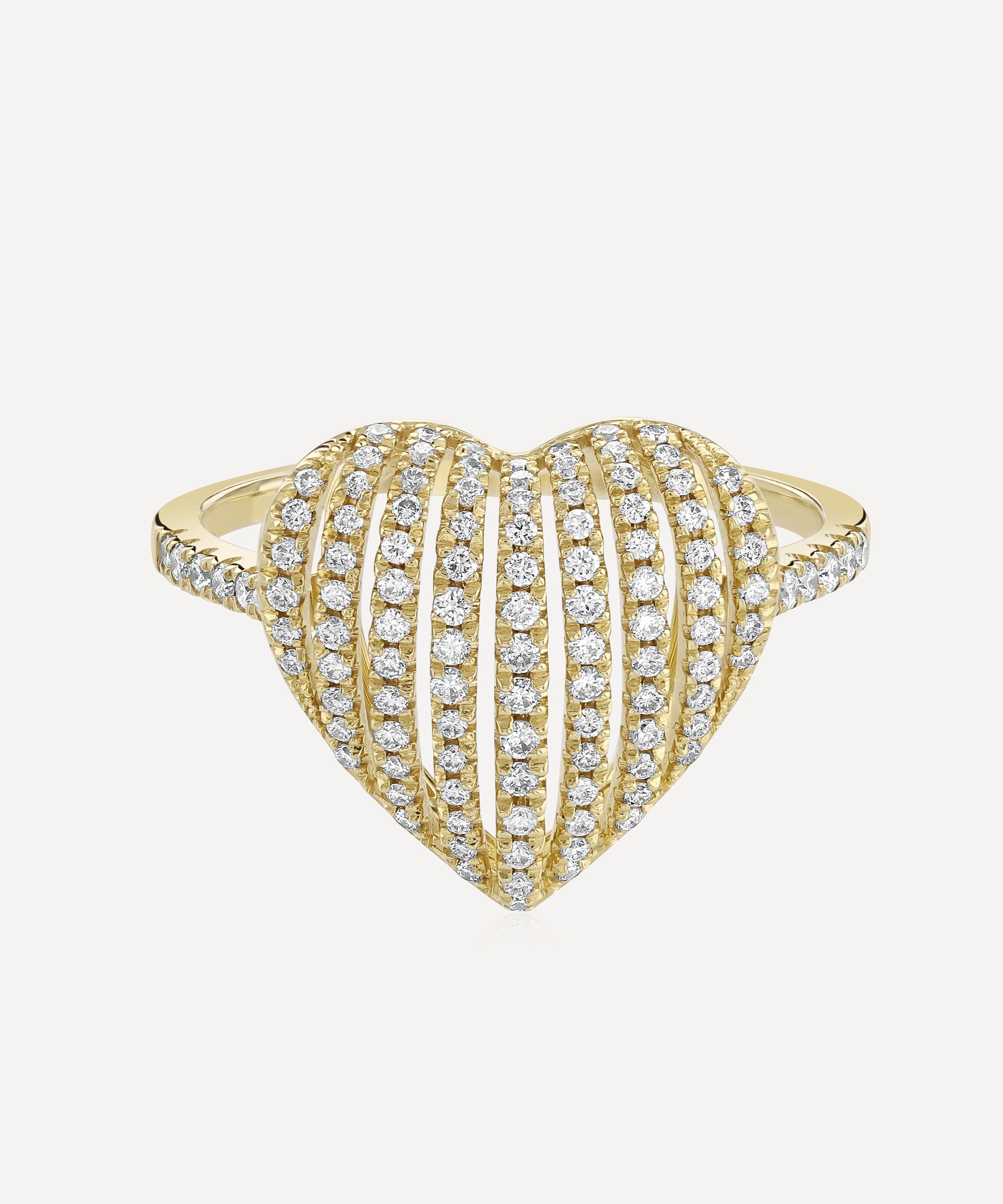 Take a playful approach to everyday dressing with this ring from Roxanne First. Crafted from 14ct gold, it features a heart-shaped cage lined with sparkling diamonds that lead to diamond set shoulders and slim, polished band. Style it solo, or stacked.