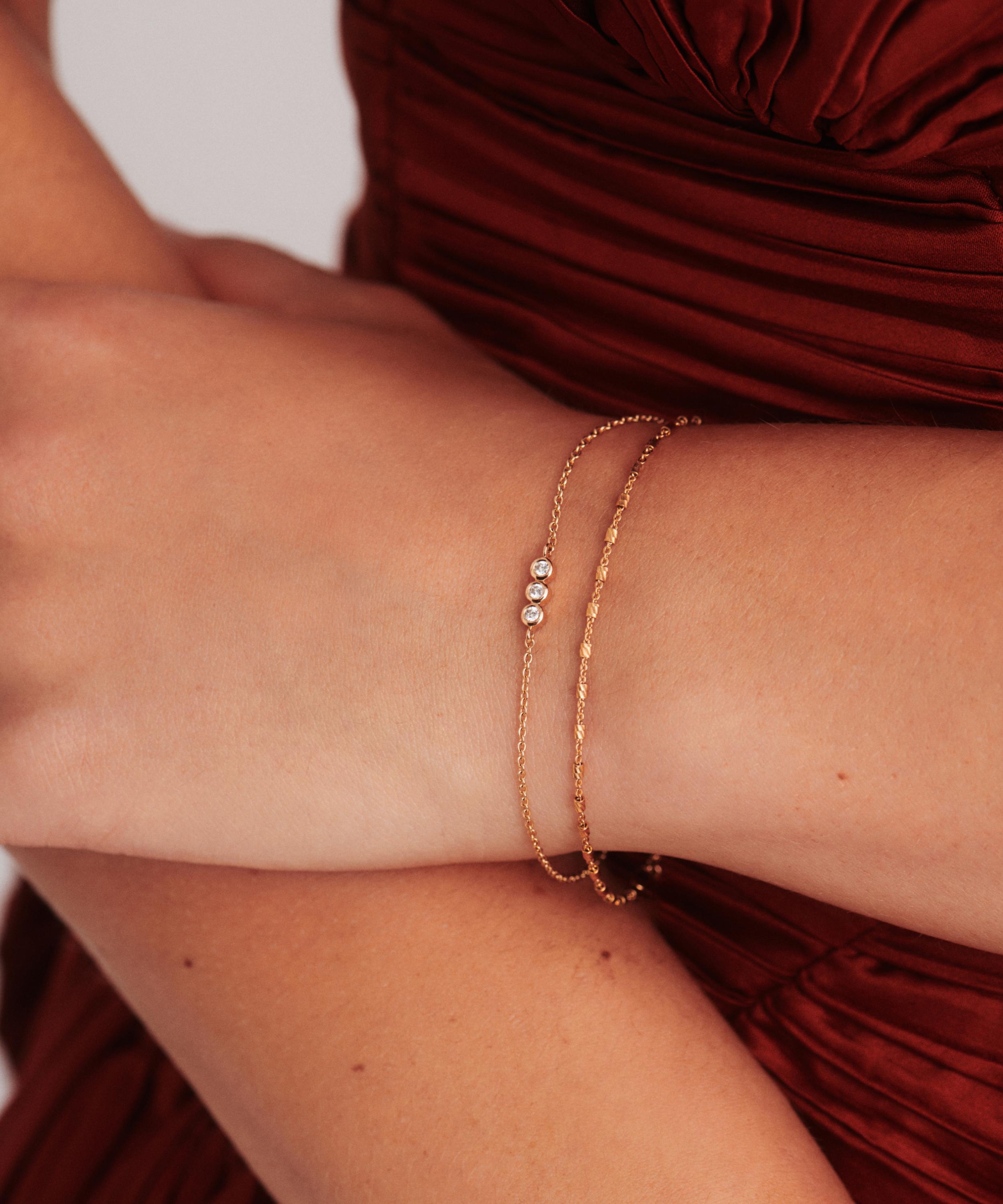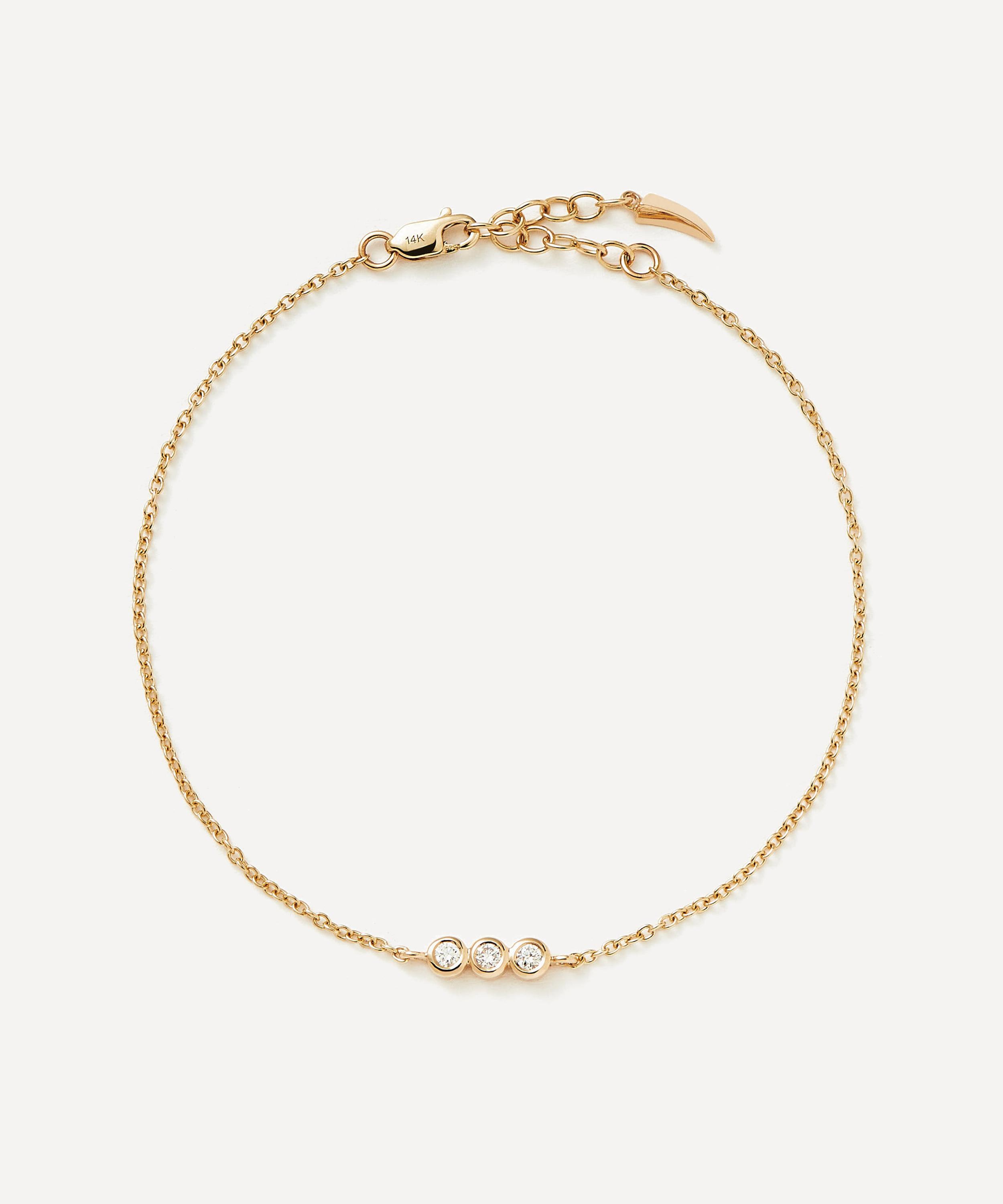 Perfect for stacking or styling alone, Missoma presents this timeless diamond bracelet. Crafted from solid 14ct gold, its elegant design is characterised by a fine trace chain and floating pendant, adorned with three sparkling diamonds. Wear it solo, or team with the matching necklace.