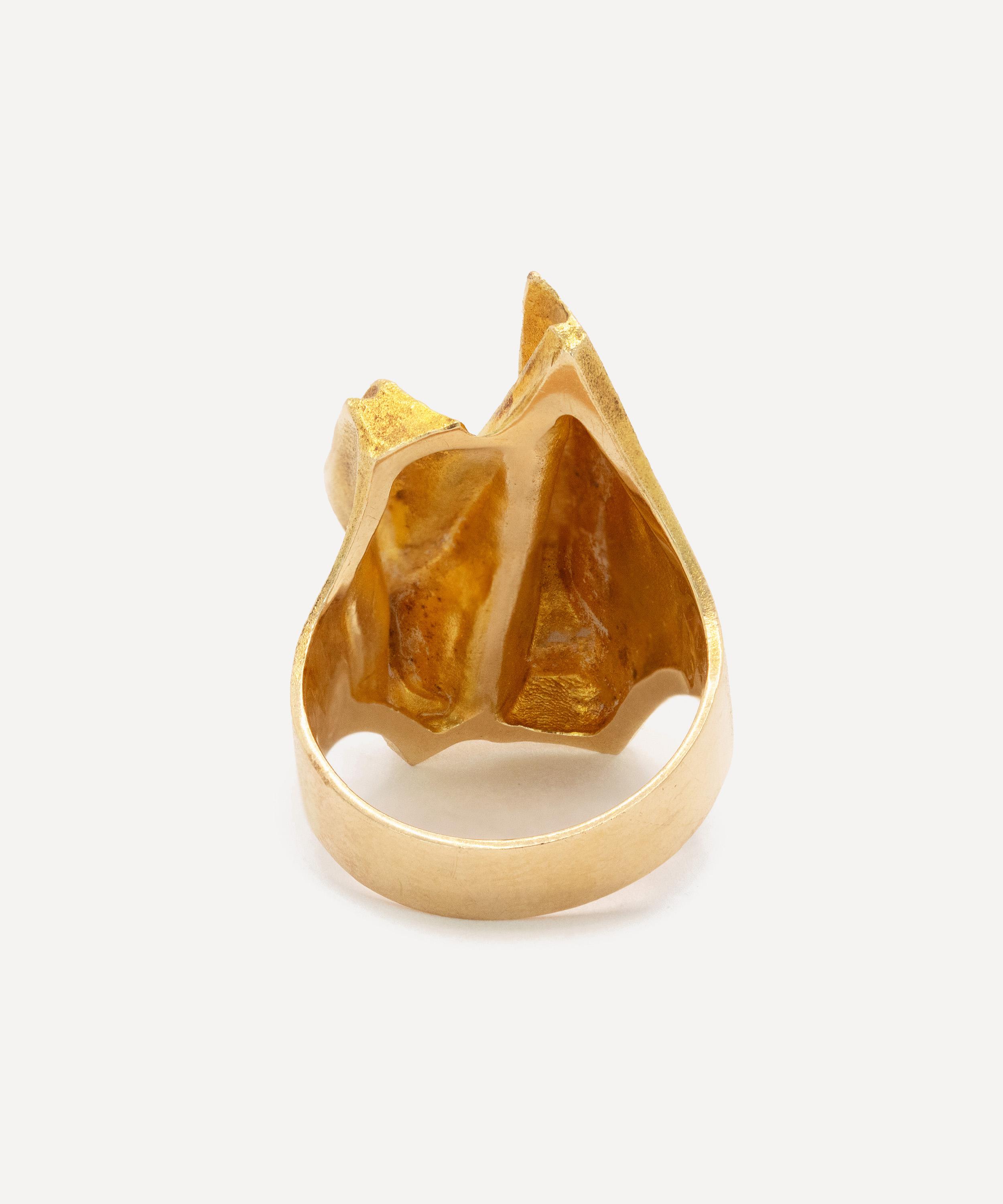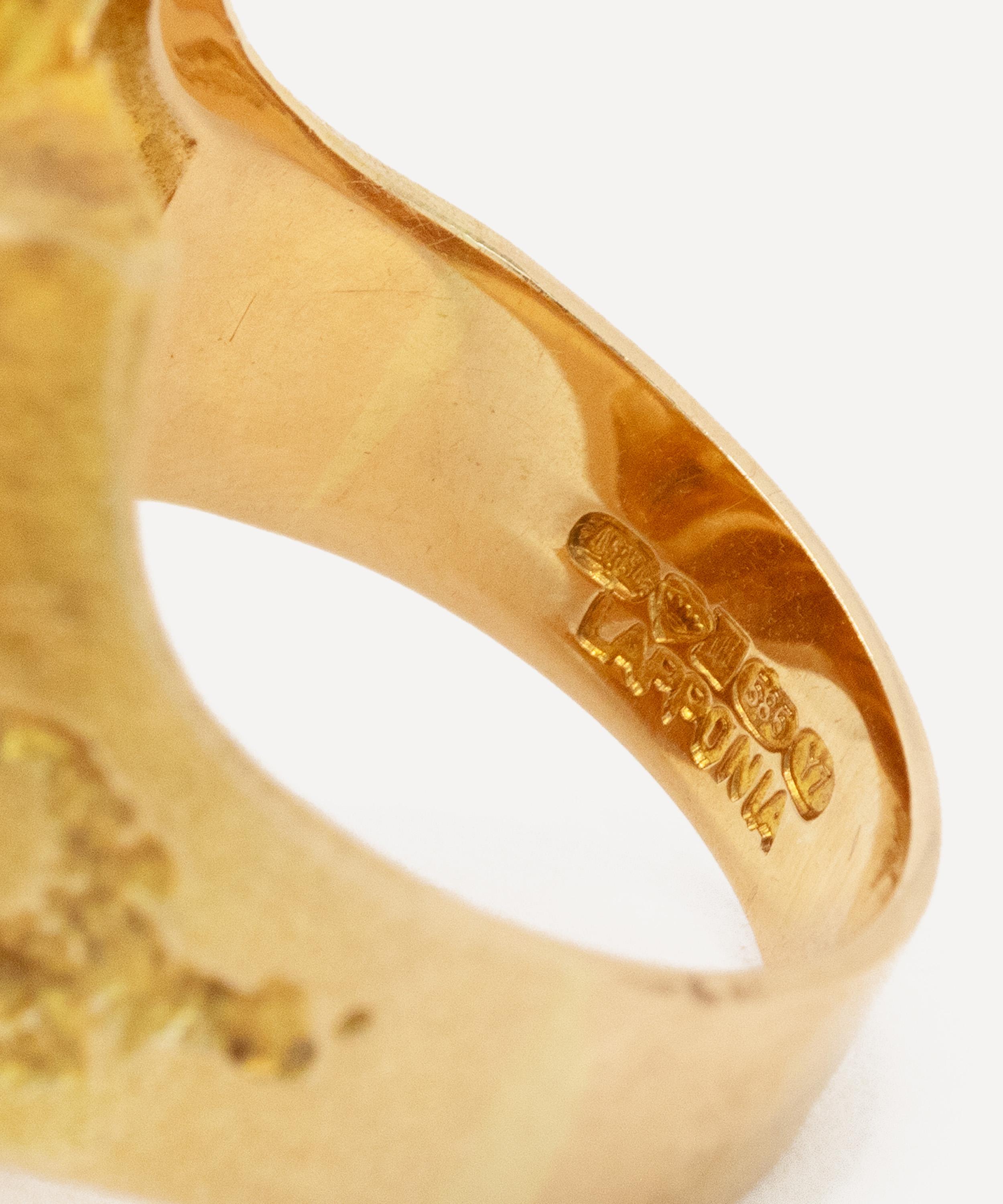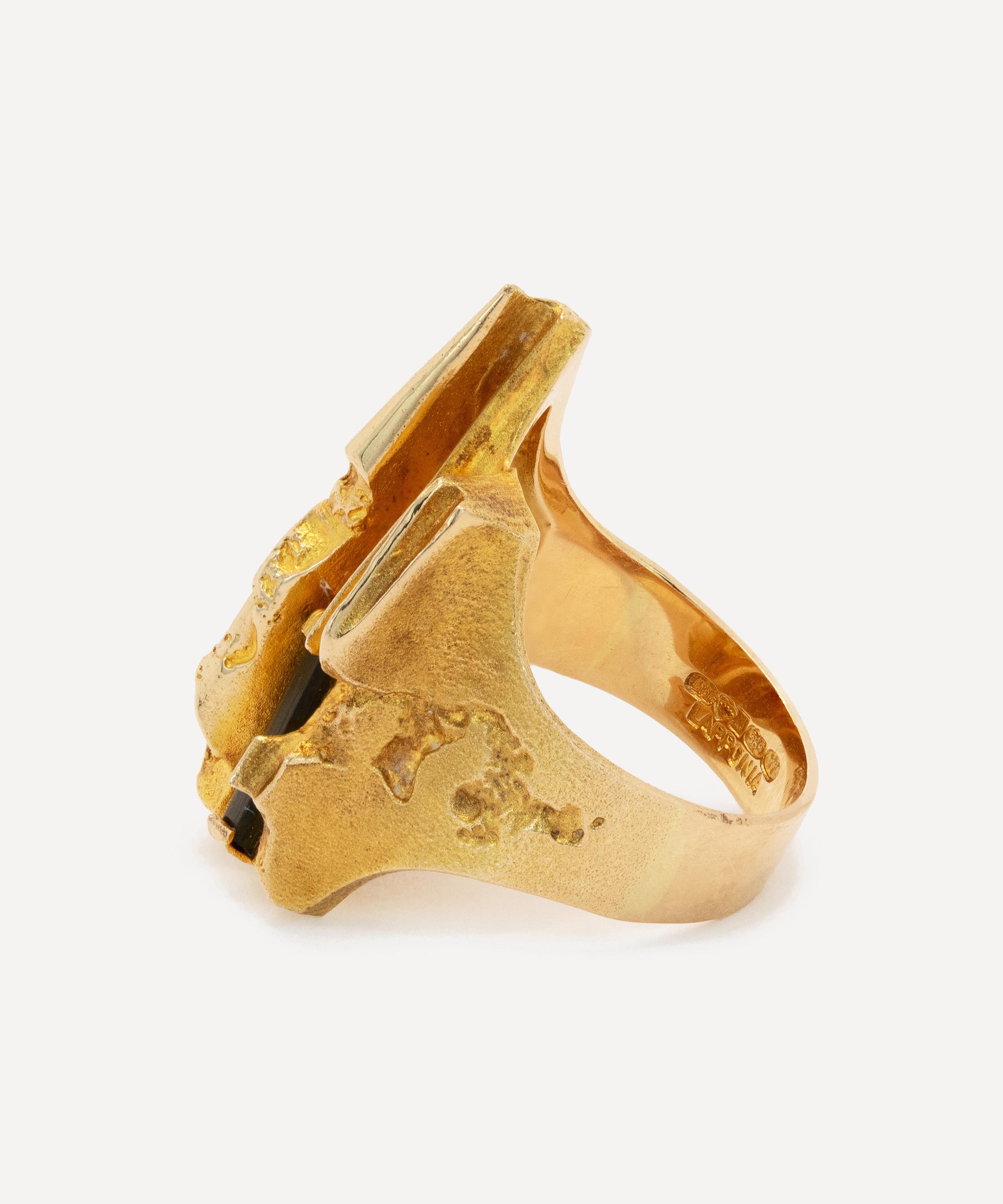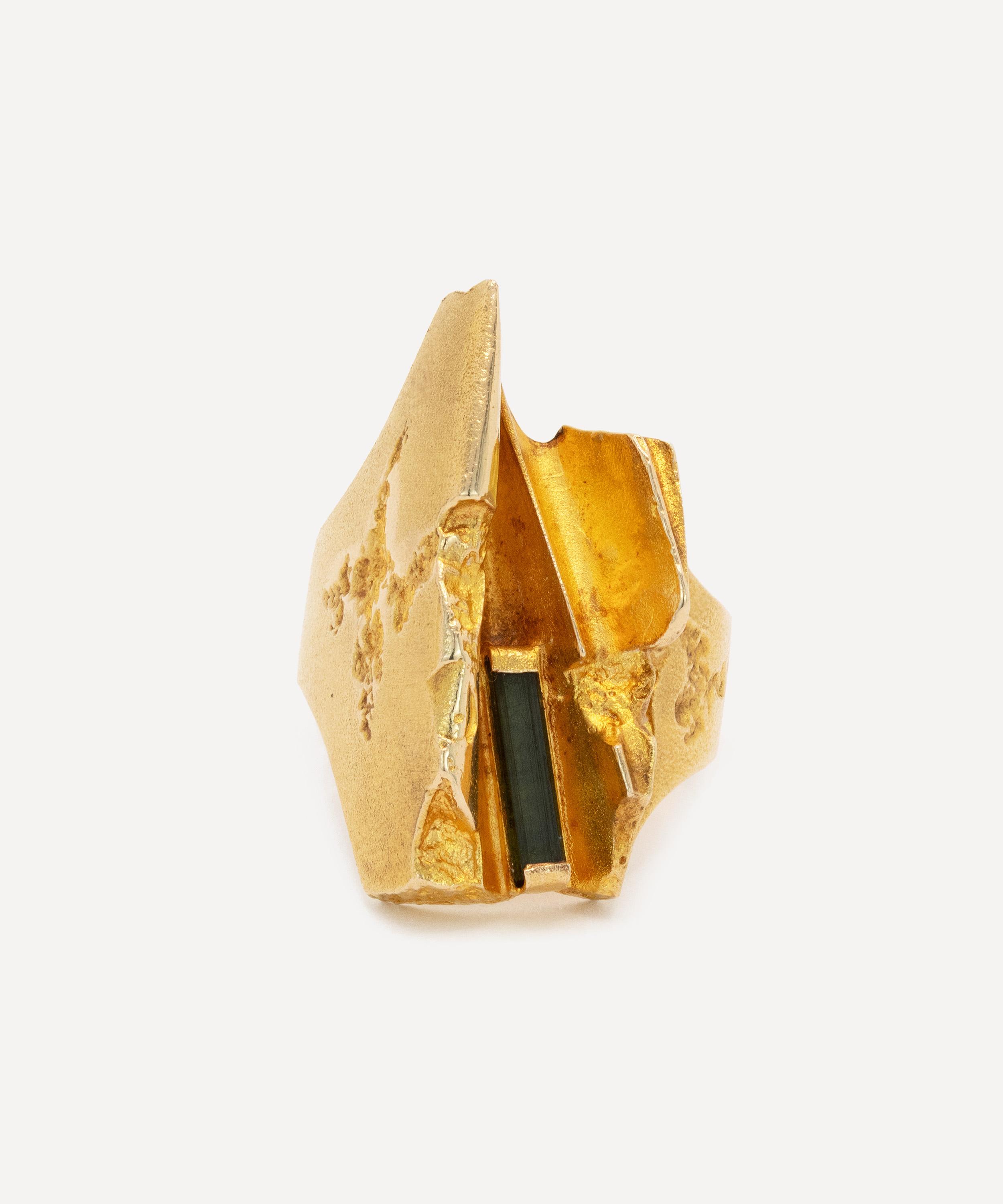 Crafted from 14ct gold by renowned Finnish jewellery company Lapponia, it features a unique, organic silhouette with a single, emerald cut green tourmaline at the centre. The ring is finished with a brushed effect.