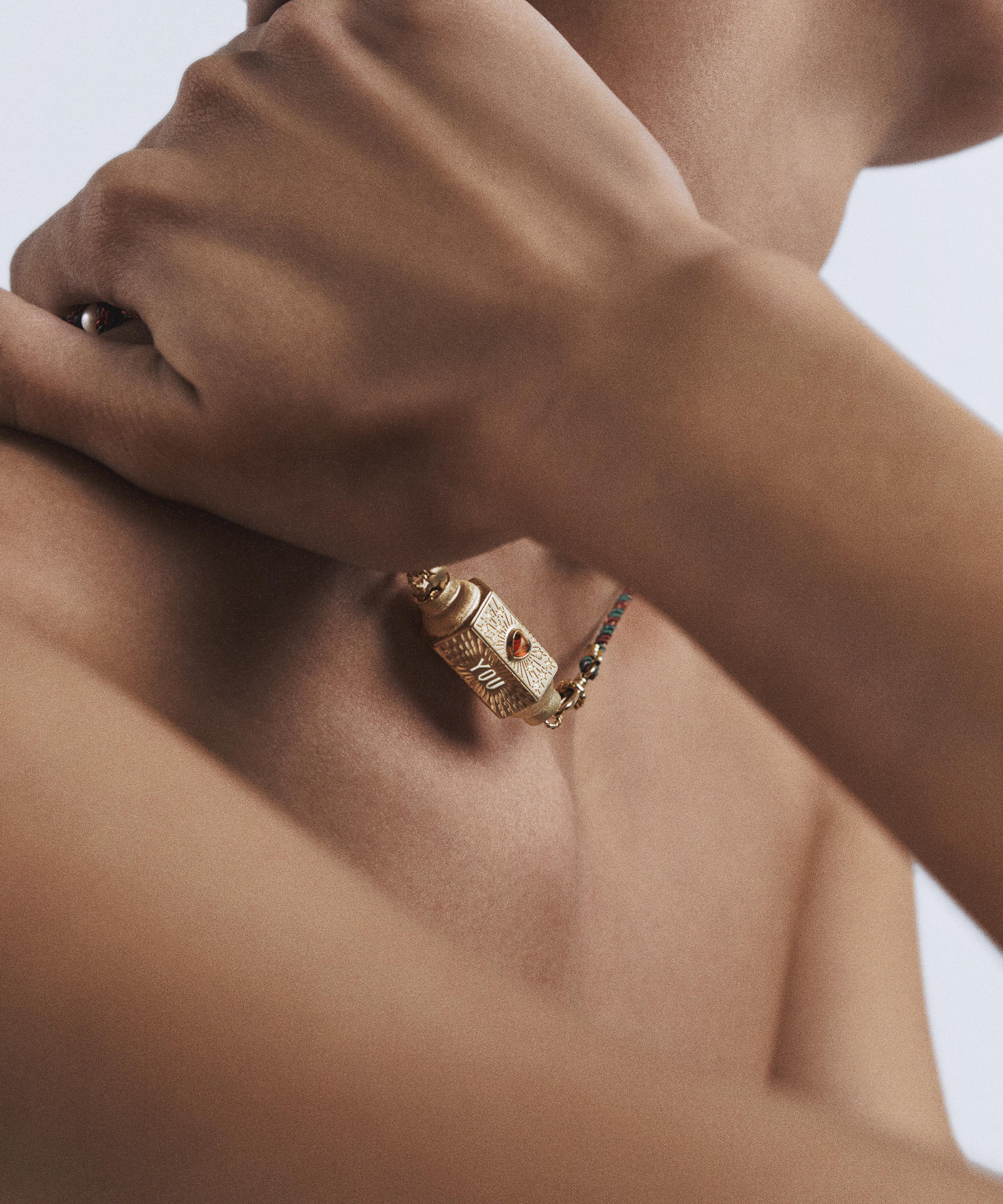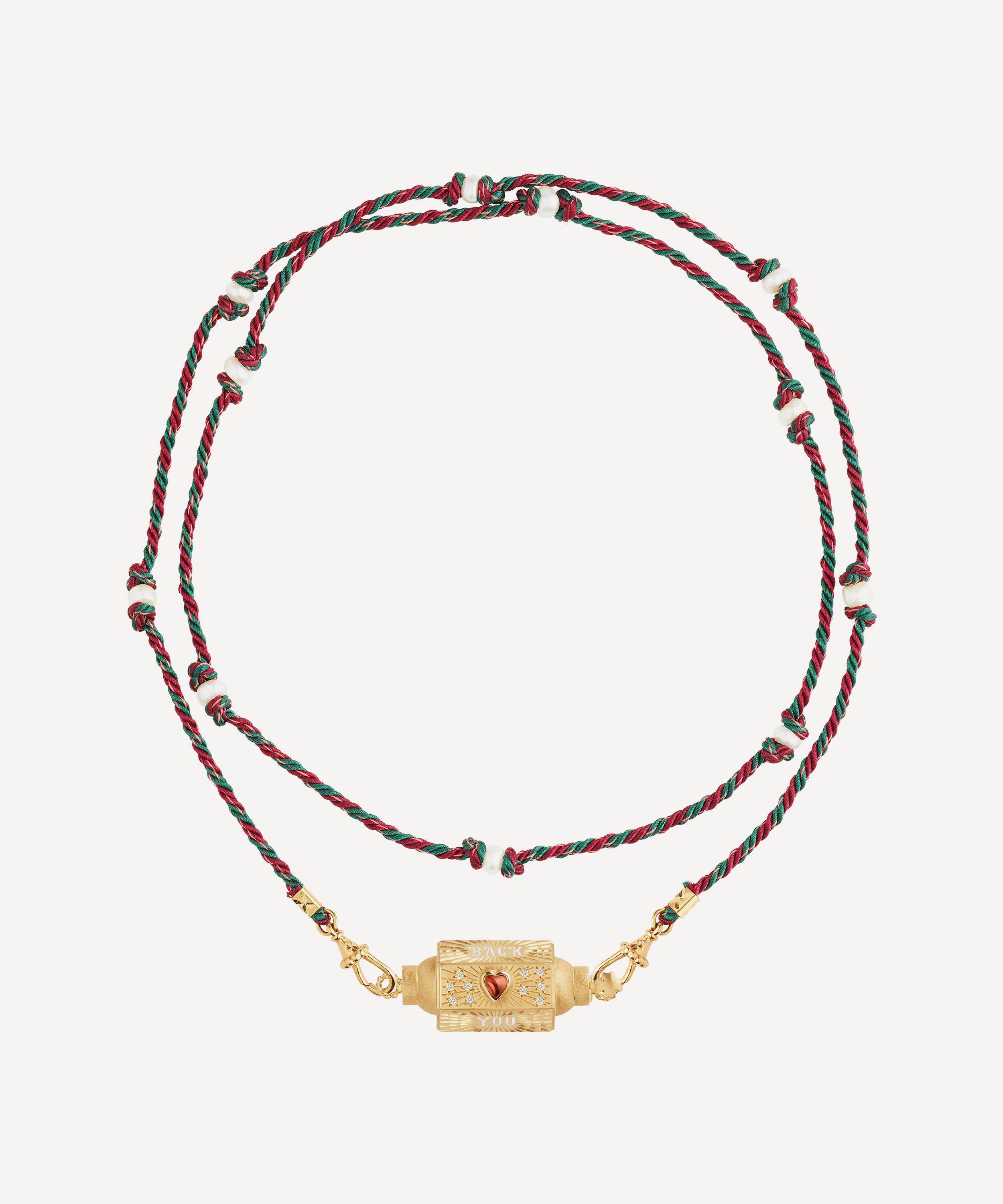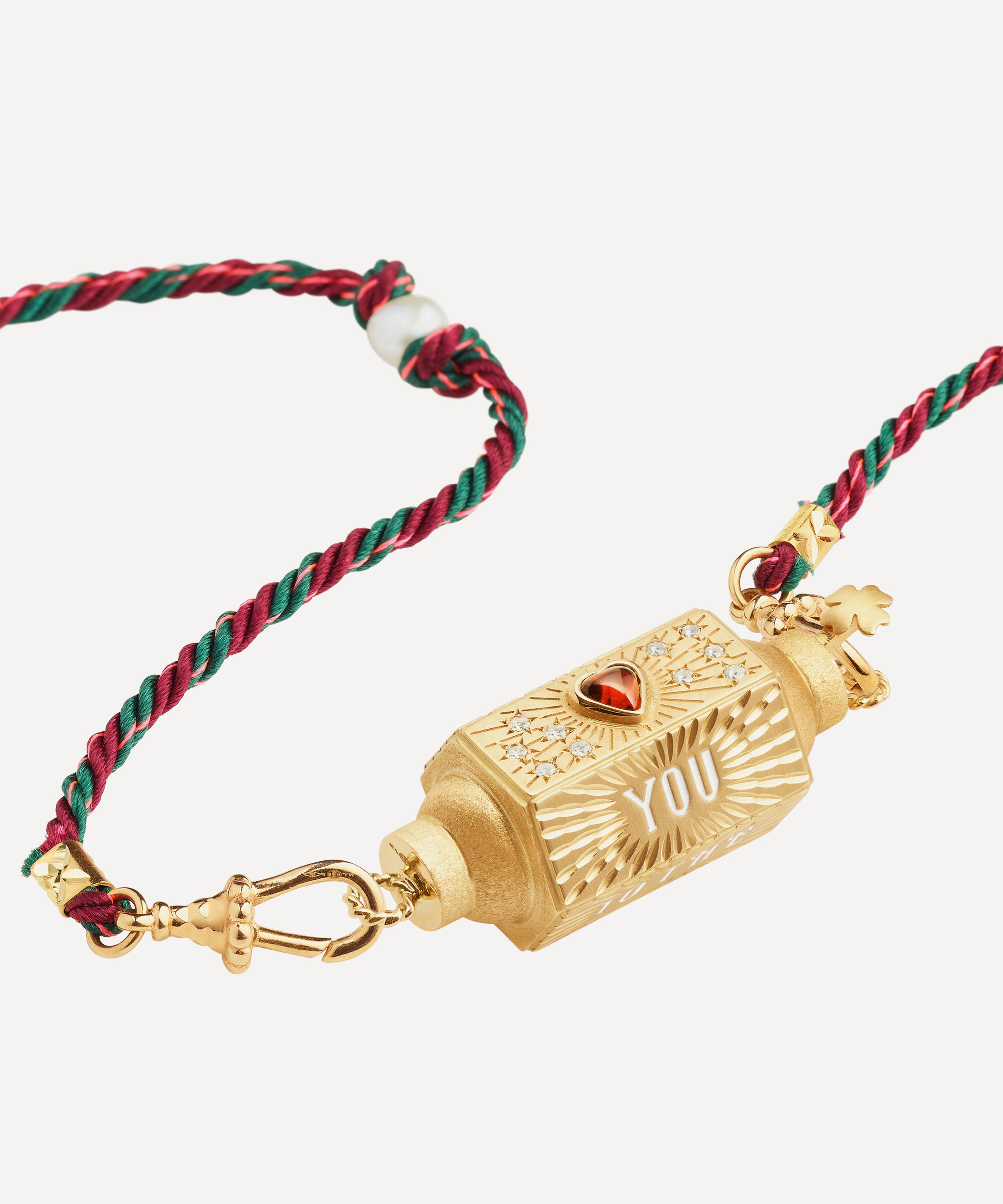 Expertly crafted from 14ct gold, this necklace features a unique double-loop mauli thread accented with freshwater pearls. At the centre hangs a large barrel pendant in chiselled gold with a garnet heart and moonstone surrounded by multicoloured sapphire stars. Finished with a “Love You To The Moon And Back” inscription, this statement piece will shine bright on its own, but looks equally alluring when teamed with one of the barrel bracelets for a stand-out curation of modern heirlooms.