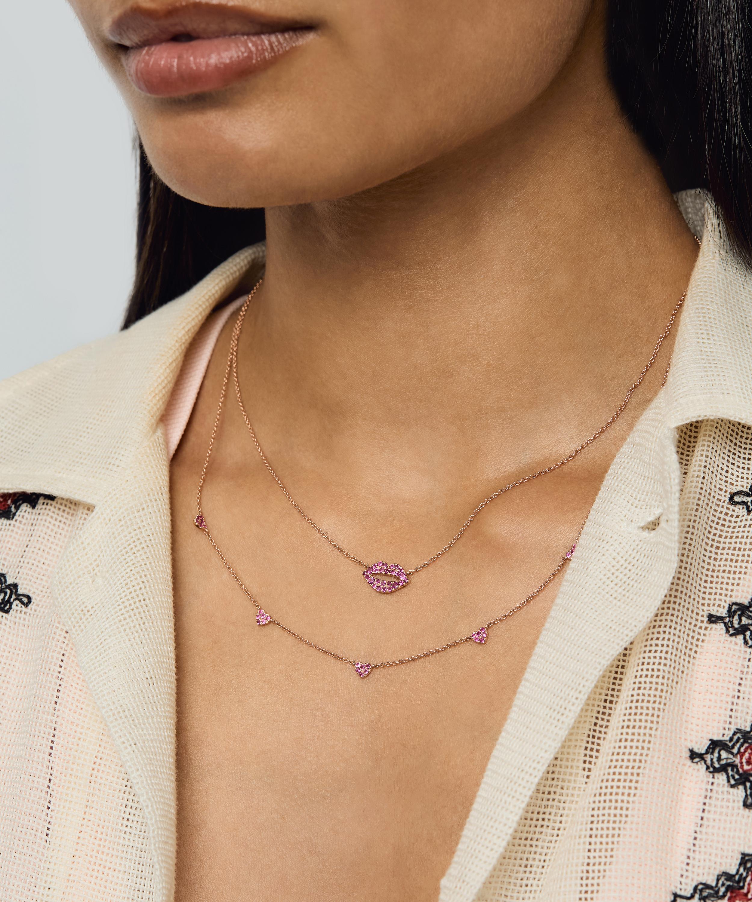 Take a playful approach to everyday dressing with this station necklace from Roxanne First. Crafted from 14ct gold, it features a fine trace chain embellished with five pink sapphire hearts. Style it solo, or stacked.