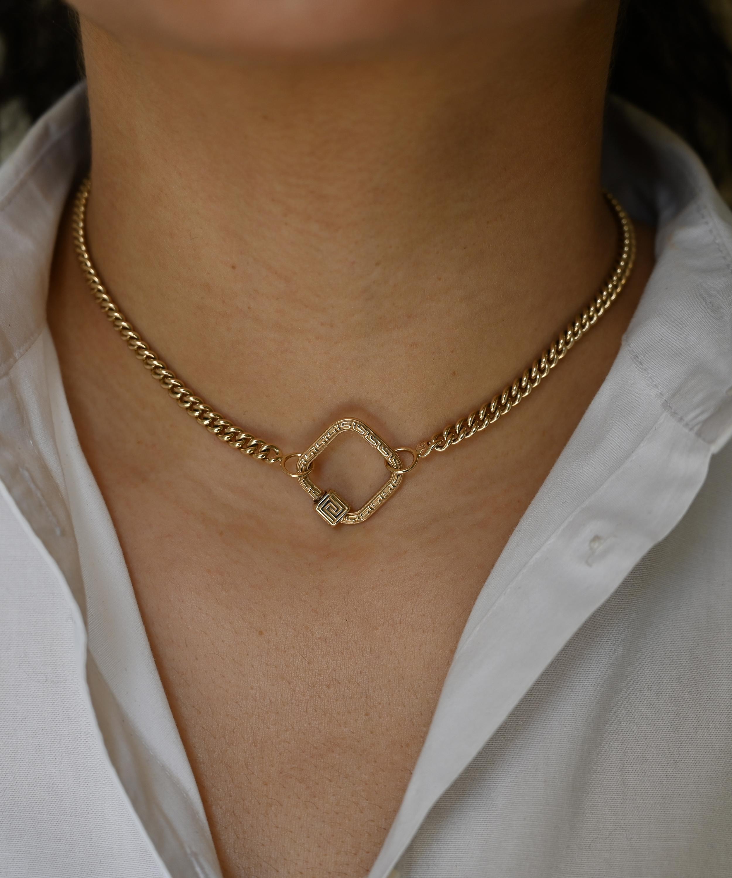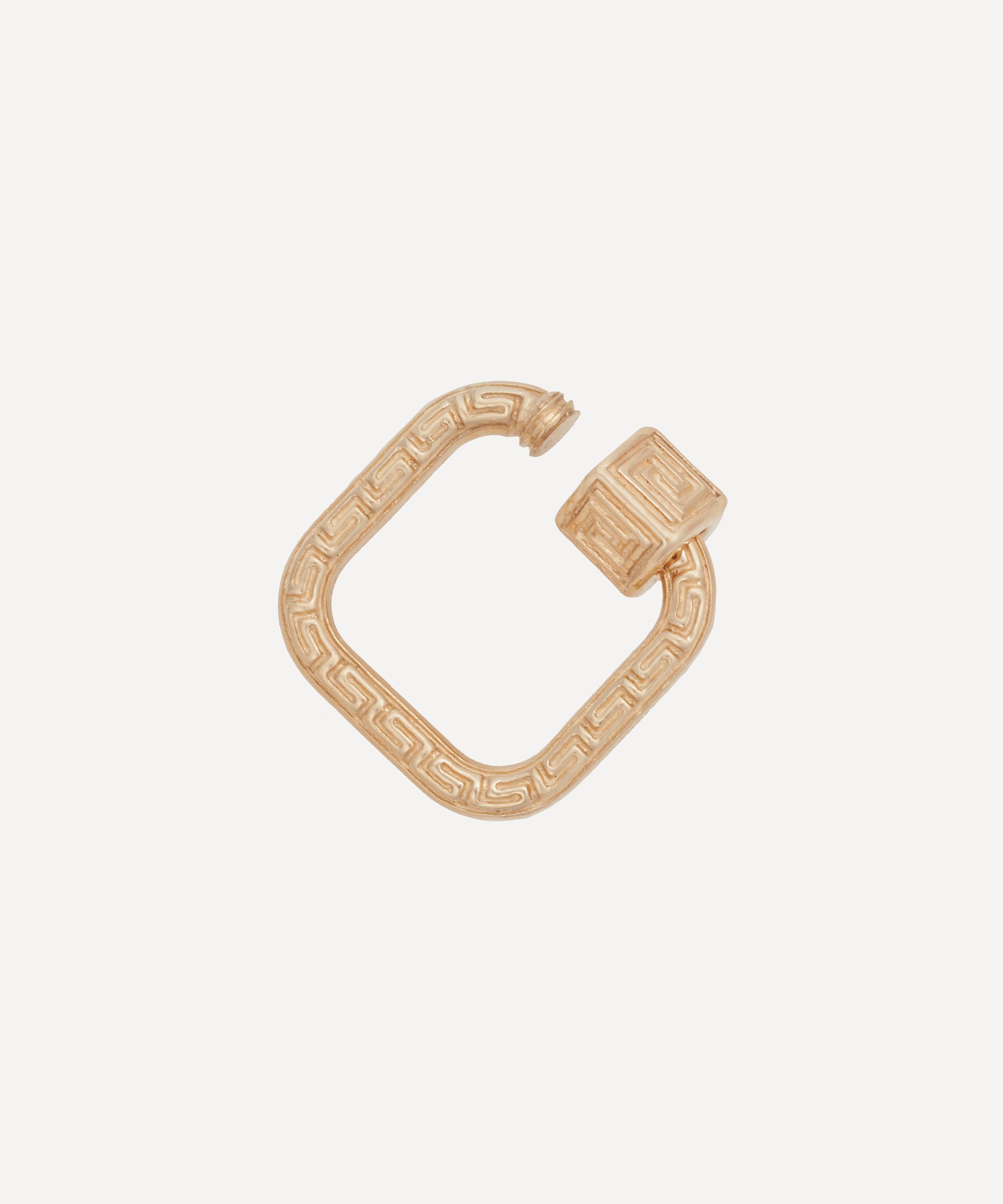 Complete your favourite chain from Marla Aaron with the brand’s Meander lock. Made from 14ct gold, it features Aaron’s signature carabiner-inspired design shaped into a square silhouette decorated with a long, continuous line that repeatedly folds back on itself, drawing on the ancient Meander River of Asia Minor. Designed to be paired with one of the brand’s exceptional chains, it can be used as a connector, a clasp, or a charm holder. Spotlighting functional maximalism with a bold, yet refined look, it boasts endless styling possibilities, ideal for a necklace or bracelet.