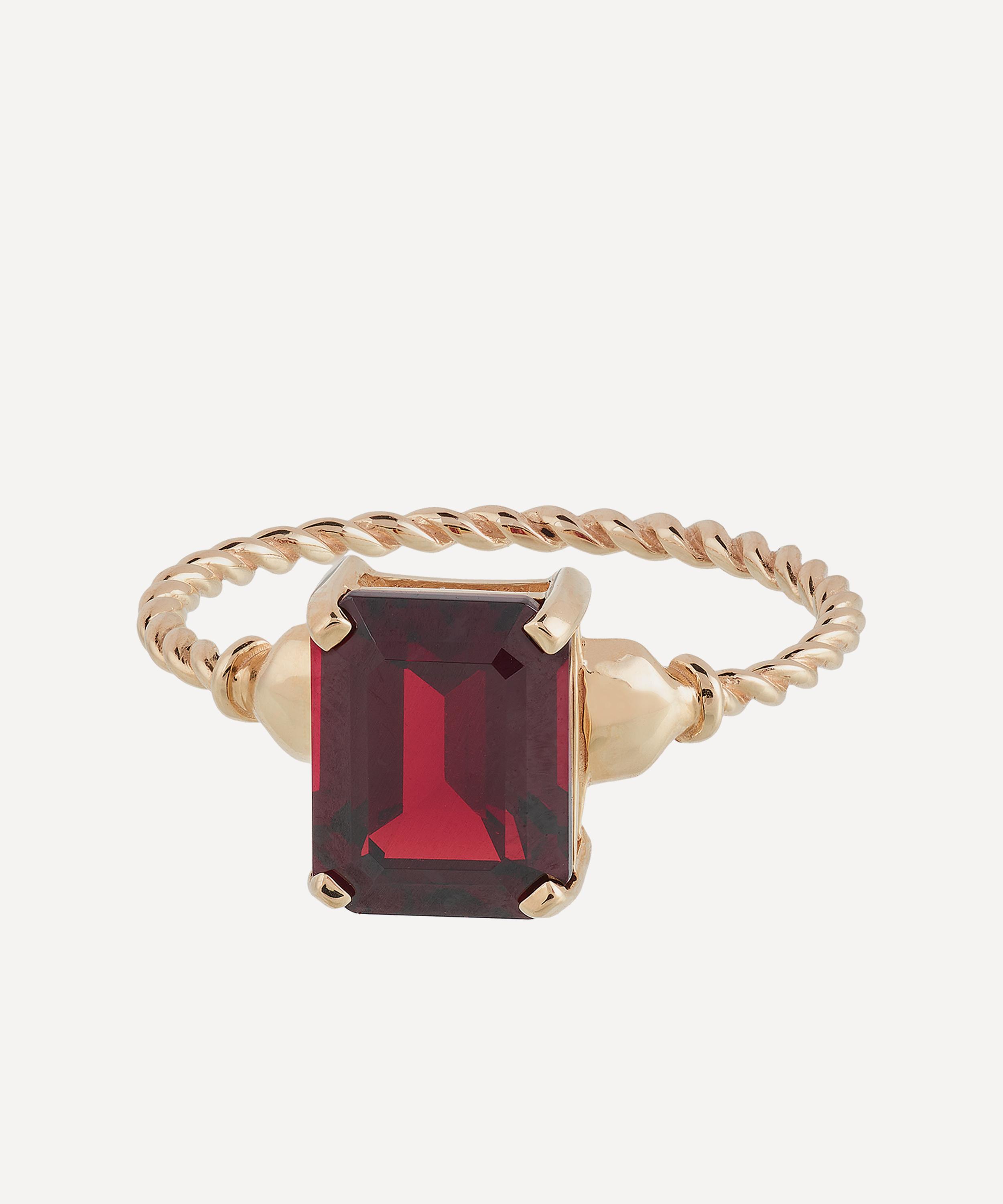Handcrafted from 14 carat gold, this elegant piece features a thin twisted band to further highlight the glittering square-cut garnet gemstone that adorns the front – style it solo, stack with other rings or team it with your favourite jewels for an elevated curation.
