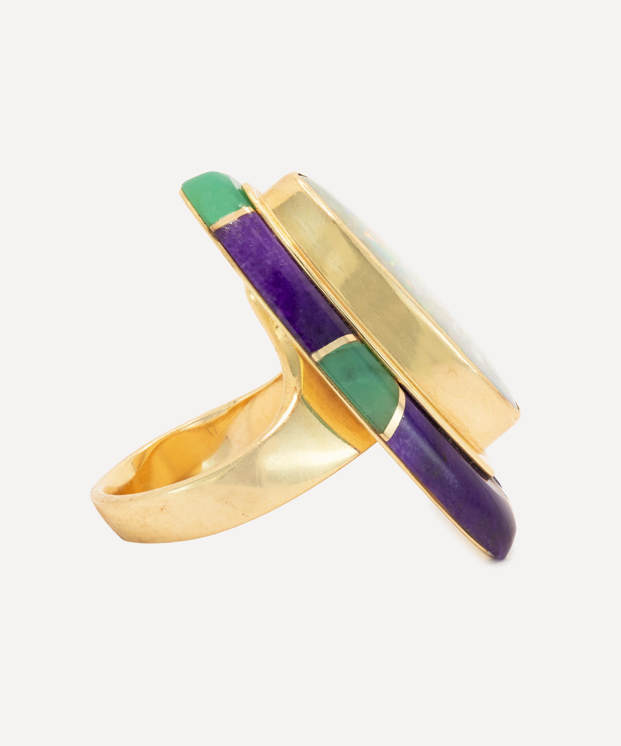 Designed by Raoul Sosa, it features a free-form cabochon opal. The opal is bezel set in 14ct gold, with its vibrant play-of-colour framed by rich inlays of purple sugilite and green chrysoprase. The polished yellow gold band balances the organic form of the setting. Whether worn as a statement of refinement or a whisper of vintage charm, it will steal the spotlight and elevate every ensemble with its undeniable presence.
