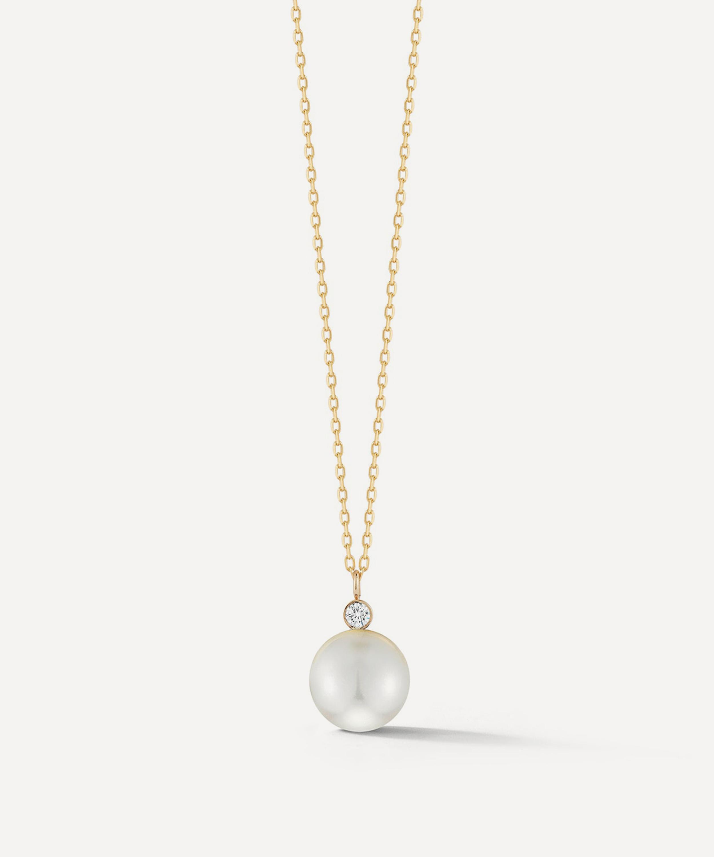 Keeping things simple, with an elevated edge, Mateo presents this beautiful pendant necklace. Crafted from 14ct solid gold, this necklace features a round, freshwater pearl pendant embellished with a sparkling diamond, suspended from a delicate link chain.