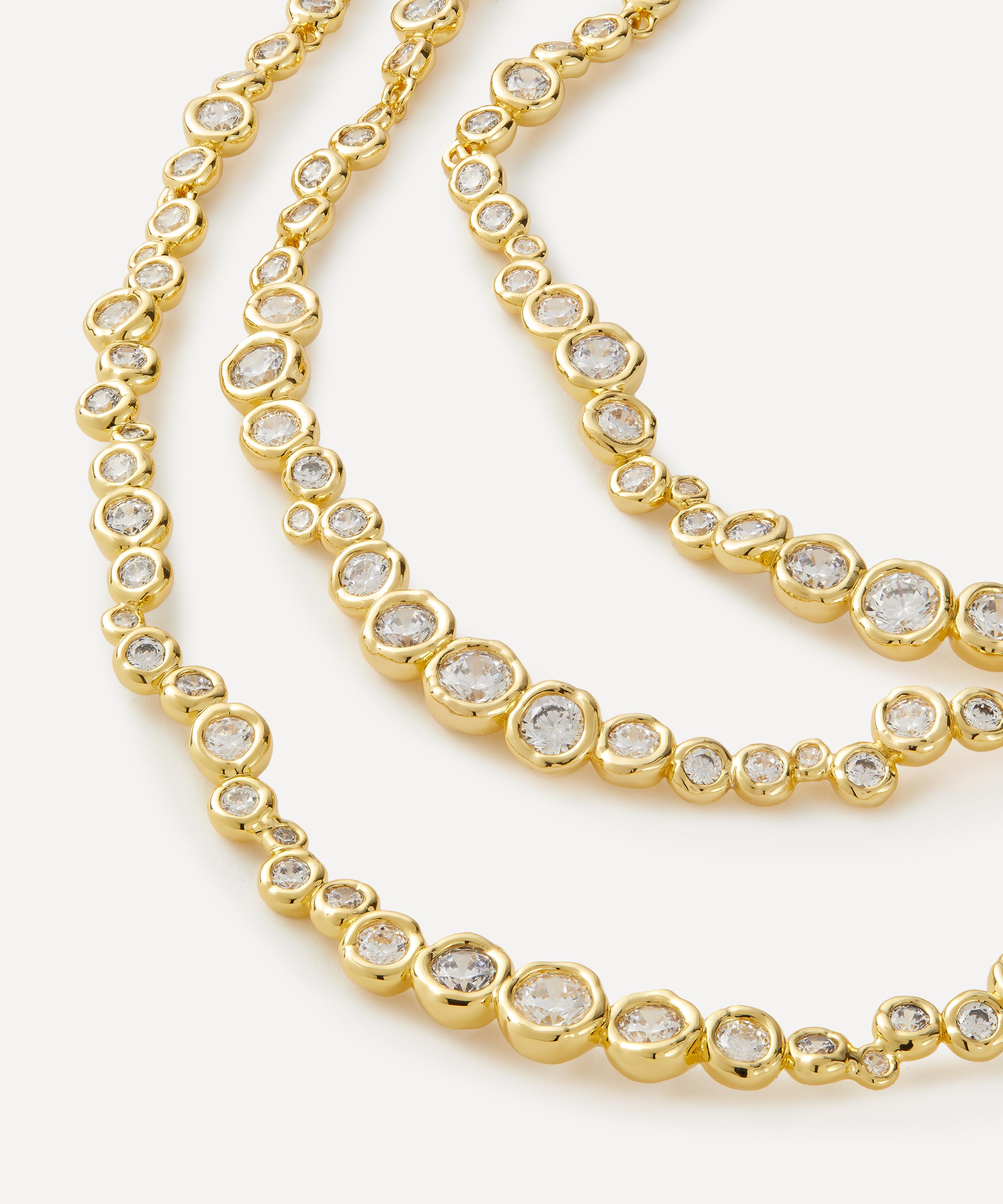 Turn heads with this statement-making bib necklace from acclaimed jewellery designer Alexis Bittar. Crafted from 14ct gold-plated brass, it features an elegantly layered bib silhouette with three strands of faceted cubic zirconia crystals in molten bezel settings. The stones are staggered in a graduating design inspired by galactic star formations of constellations. Style solo for a distinctive finish or incorporate into a curated stack for a maximalist approach.