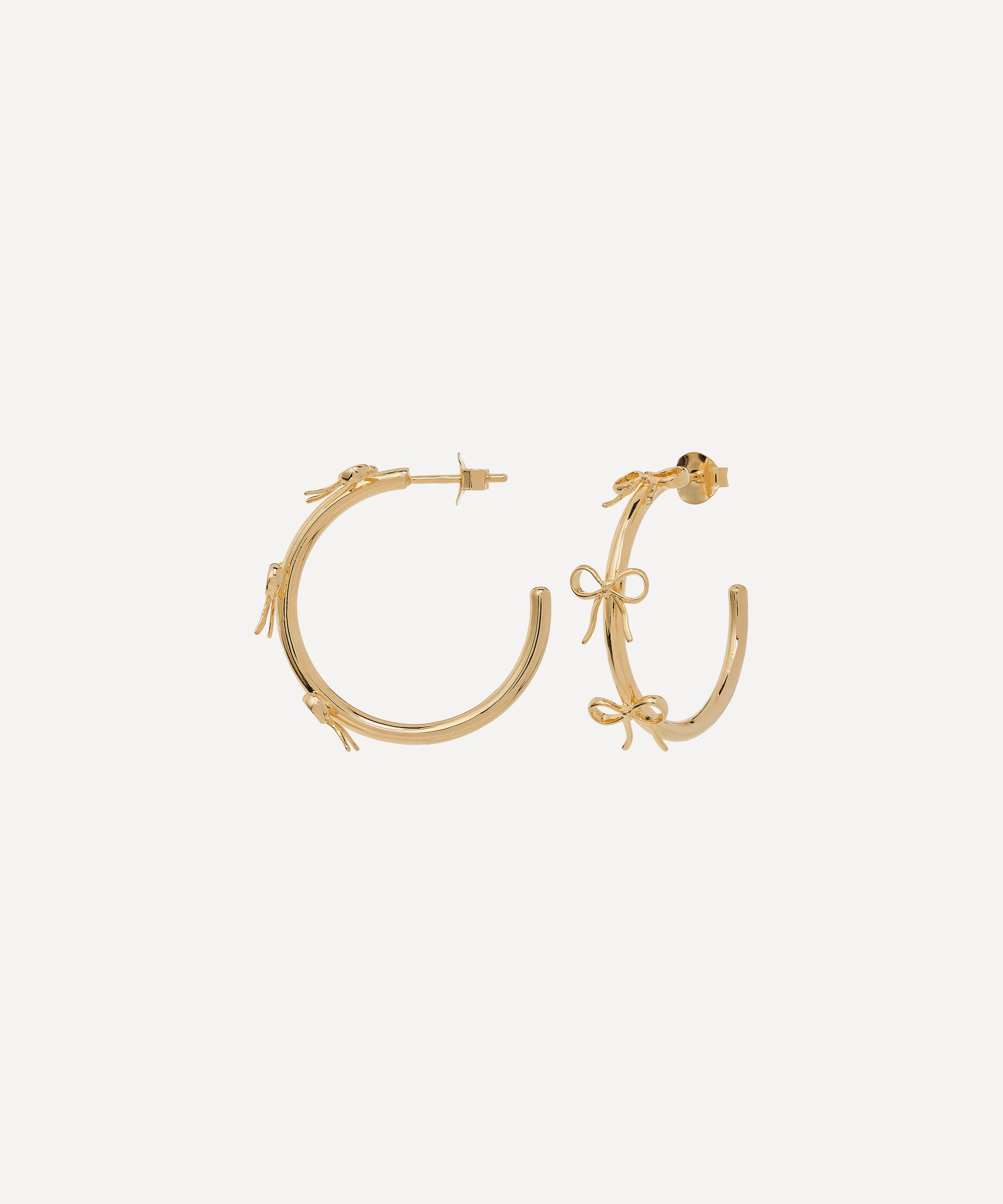 Crafted from 14ct gold-plated silver to a large hoop silhouette, this charming pair have been decorated with a row of sweet, delicate ribbons – style them solo, or team with studs and smaller hoops for an on-trend, stacked curation.