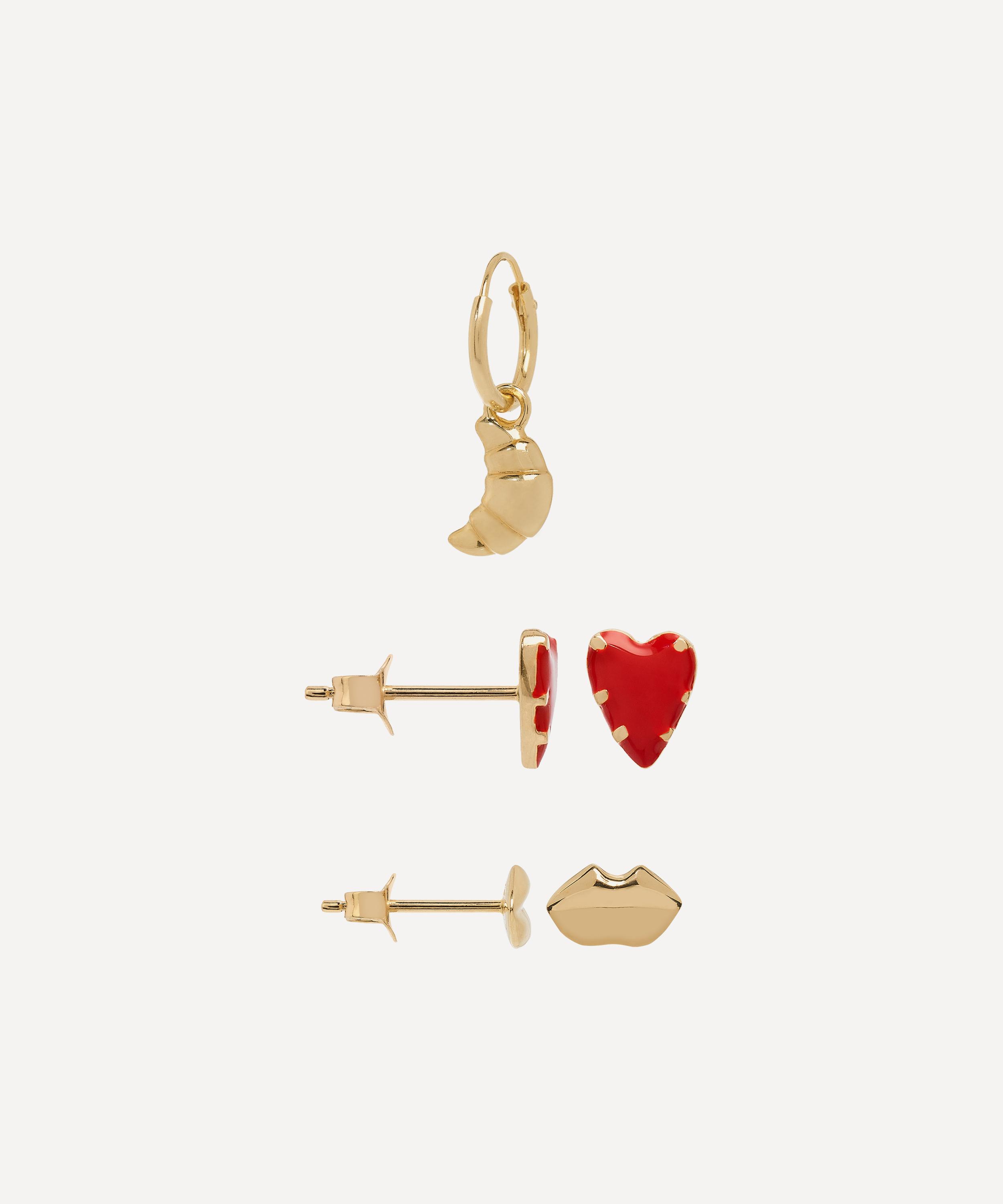 Crafted from 14ct gold-plated silver, this set features two stud earrings which take the shape of a love heart and a pair of lips, alongside a huggie hoop with a dropped croissant charm – incorporate them into a mixed ear stack for a trend-led finish, or wear two together for a light-hearted, mis-matched pair.