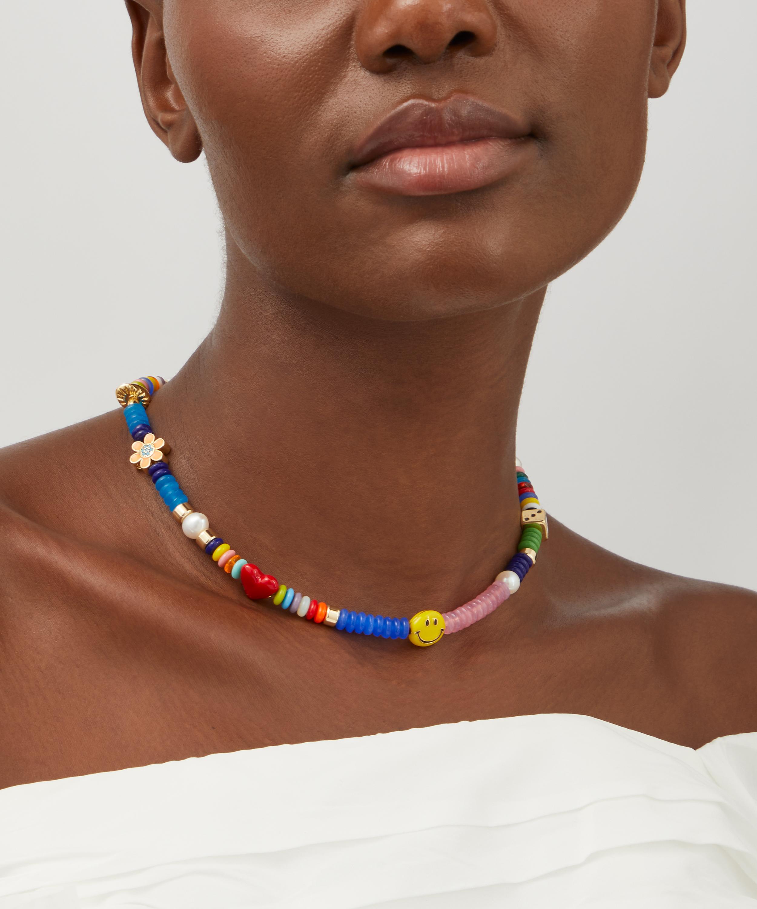 The Enamel beaded necklace presents a whimsical design from Miami-based jewellery brand Martha Calvo. Crafted from 14ct gold-plated brass, it’s composed of rainbow beads and assorted enamel beads including a ditsy happy face, red heart, dice, flower and mushroom.