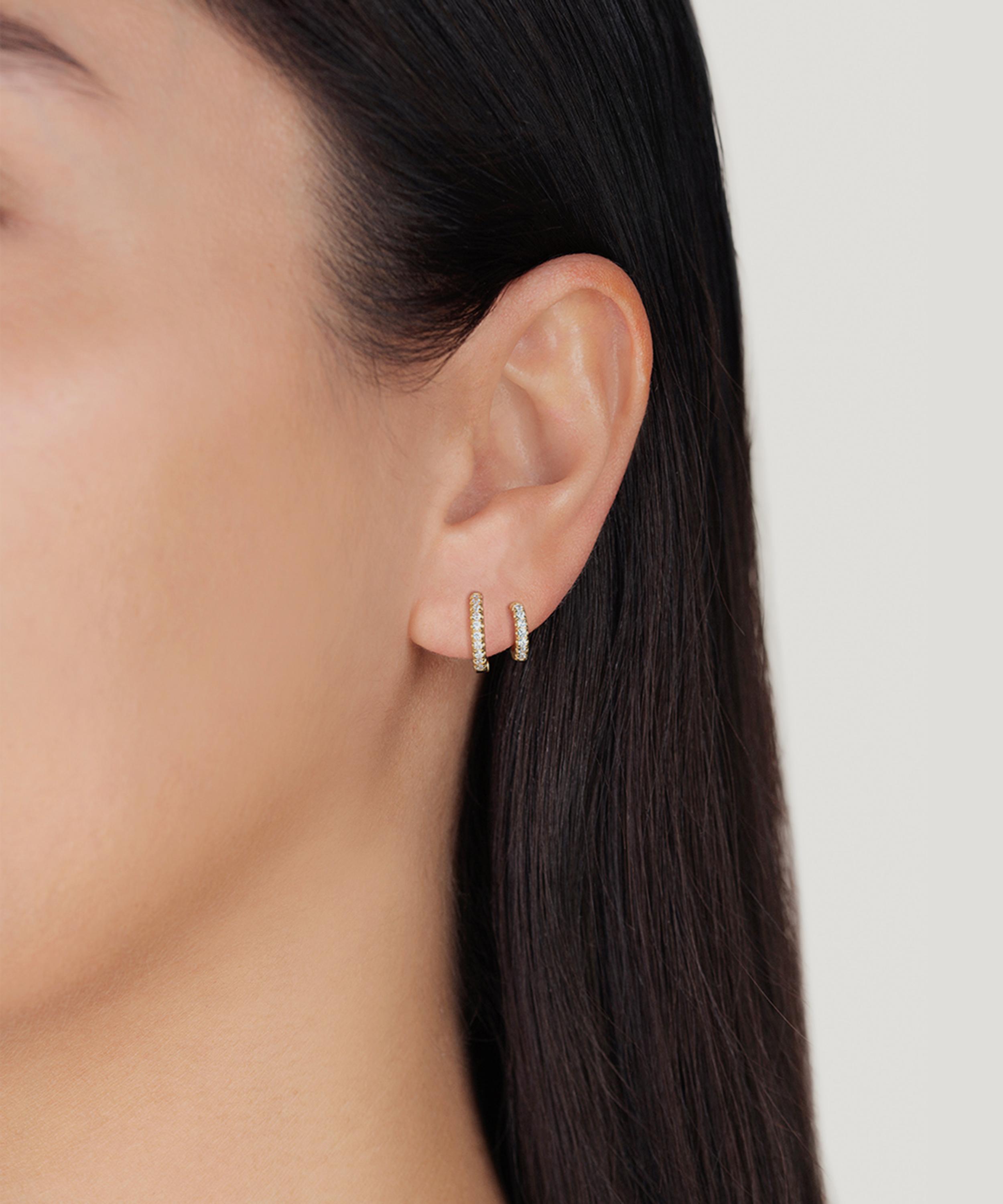 Perfect for stacked curations, get two in one with the Katerina Double hoop earrings from SHASHI. Expertly crafted from 14ct gold-plated silver, each earring is fashioned in a double hoop design – mimicking a two-hole piercing, without the piercing. Featuring a graduated silhouette with one larger hoop that fits into a piercing, and one small hoop that works as an adjustable cuff, it’s finished with sparkling cubic zirconia lined across the front.