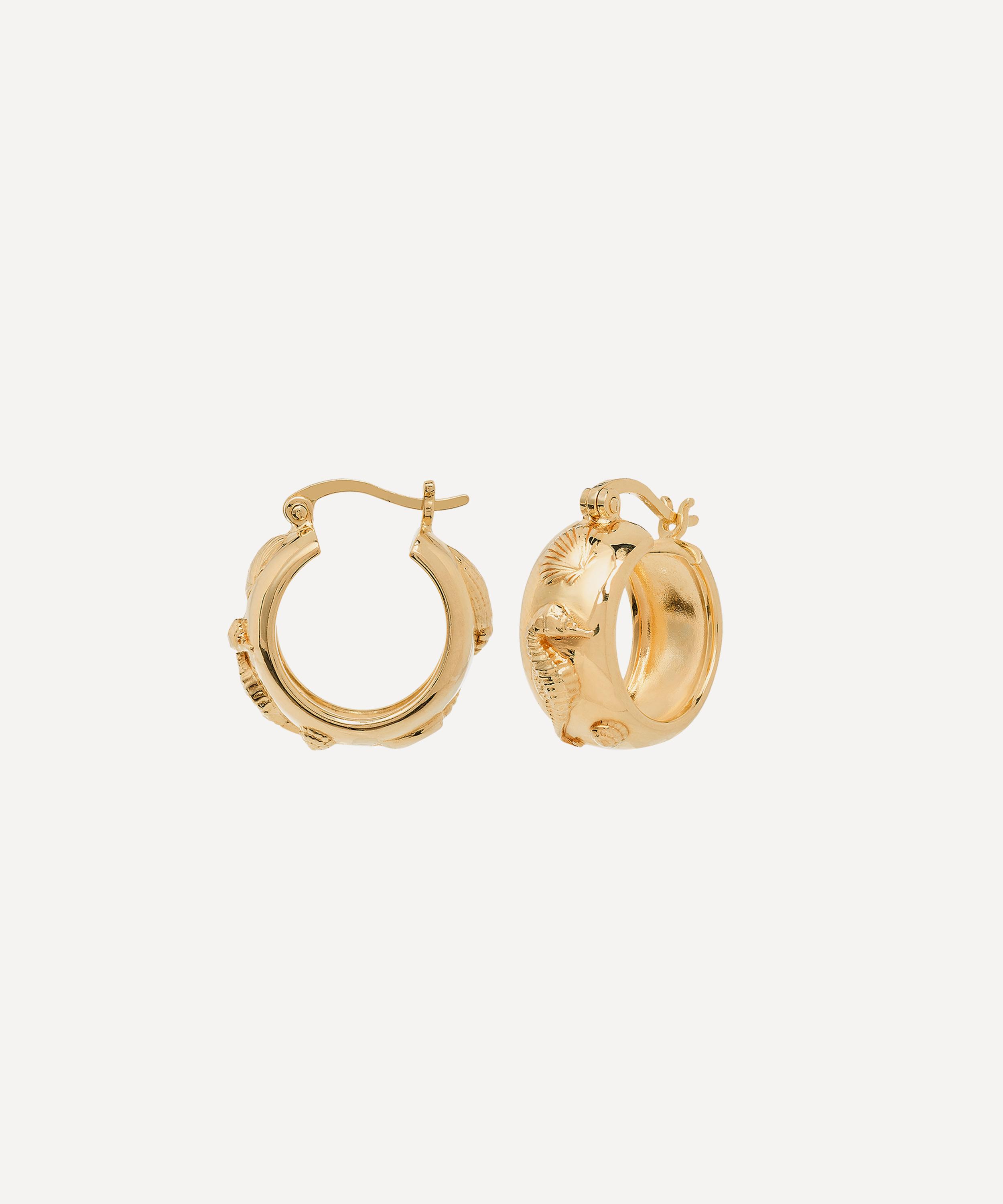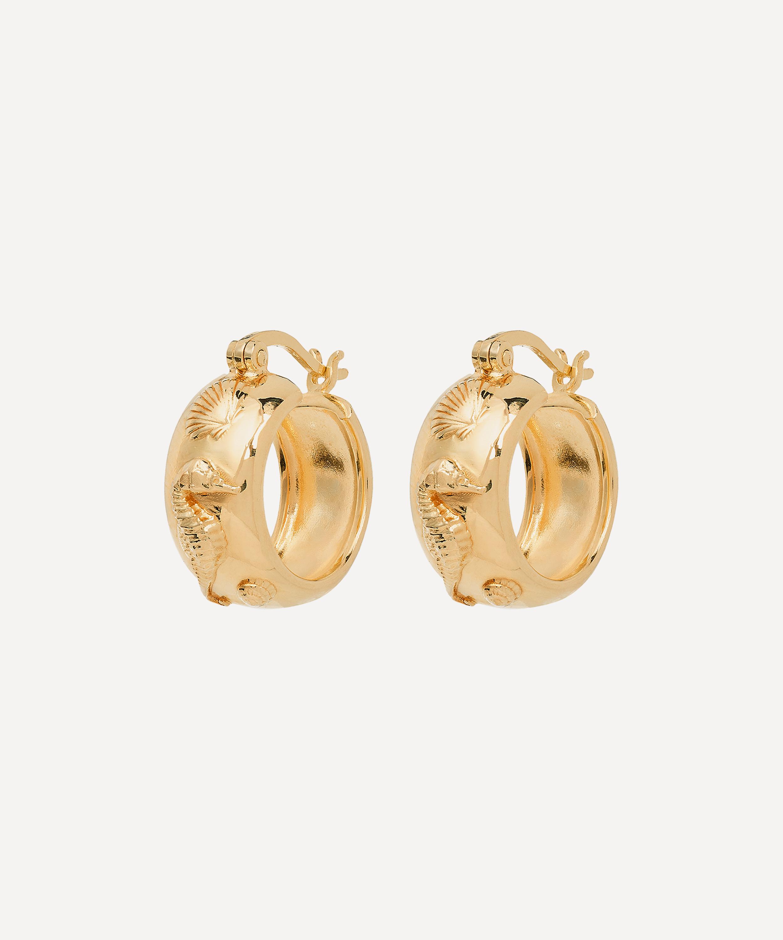 Crafted from 14ct gold-plated silver to a wide hoop silhouette, this charming pair are decorated with an array of seahorses and shells – style them solo, or team with studs and smaller hoops for an on-trend, stacked curation.
