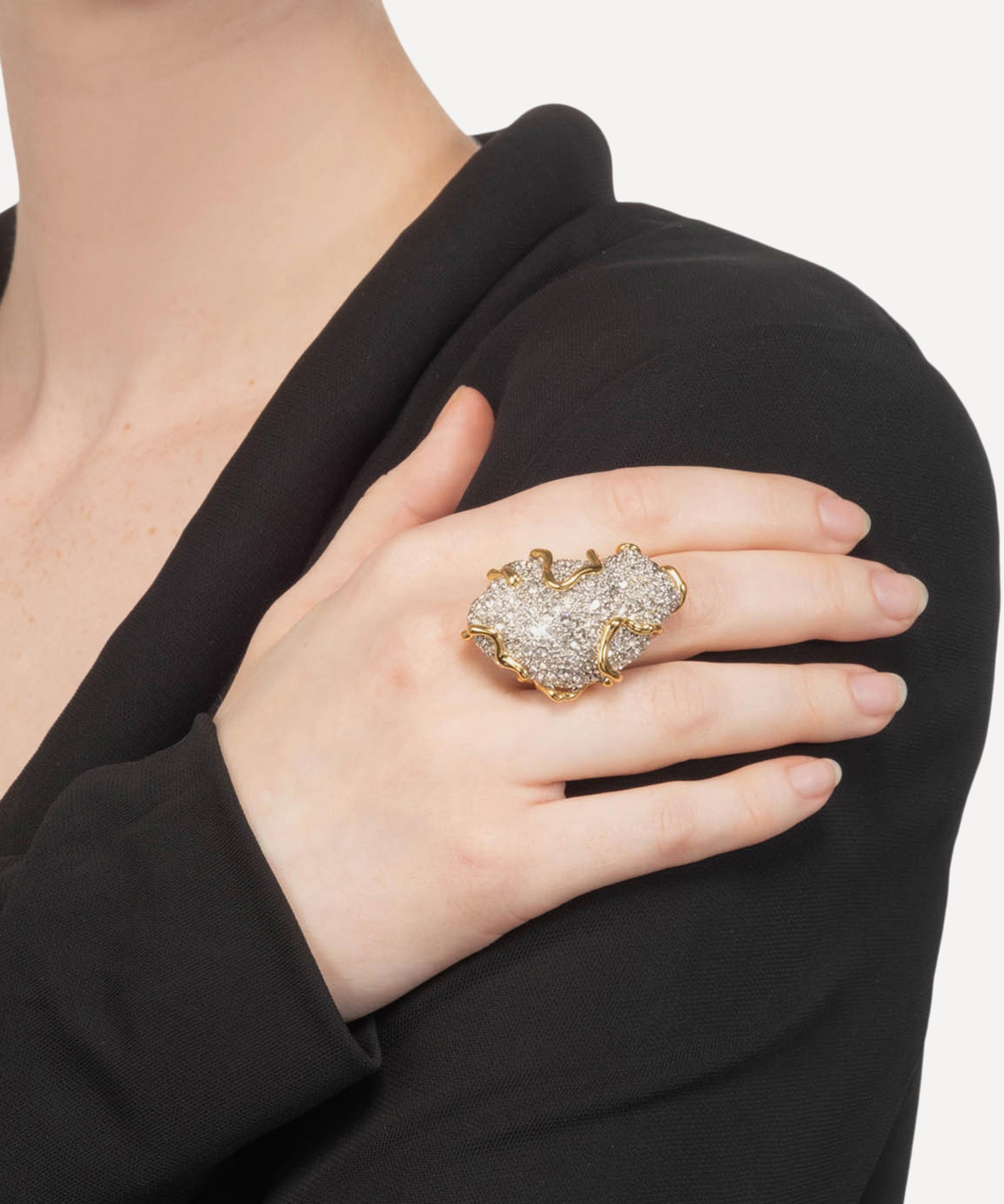 Exemplifying the brand’s bold and artistic aesthetic, it’s crafted from 14ct gold-plated brass, featuring a split, double band with molten metalwork that twists and sprawls over a large pebble covered in a sparkling crystal pavé – reminiscent of a natural geode. Uniting vintage glamour with a sculpted modern refinement, style it as a solo piece or pair with other cocktail rings and stacking bands.