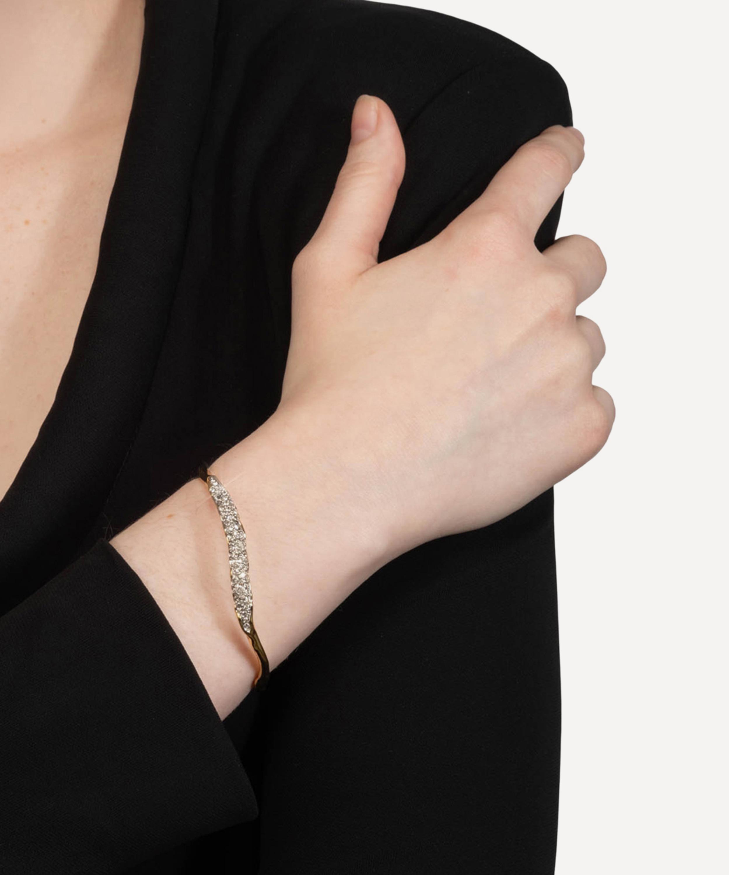 Exemplifying the brand’s bold and artistic aesthetic, it’s crafted from 14ct gold-plated brass, featuring a molten silhouette, adorned with sparkling pavé crystals atop imitation rhodium. Let it shine on its own or team it with a mix of cuff bracelets and chains to elevate your current stack line-up.