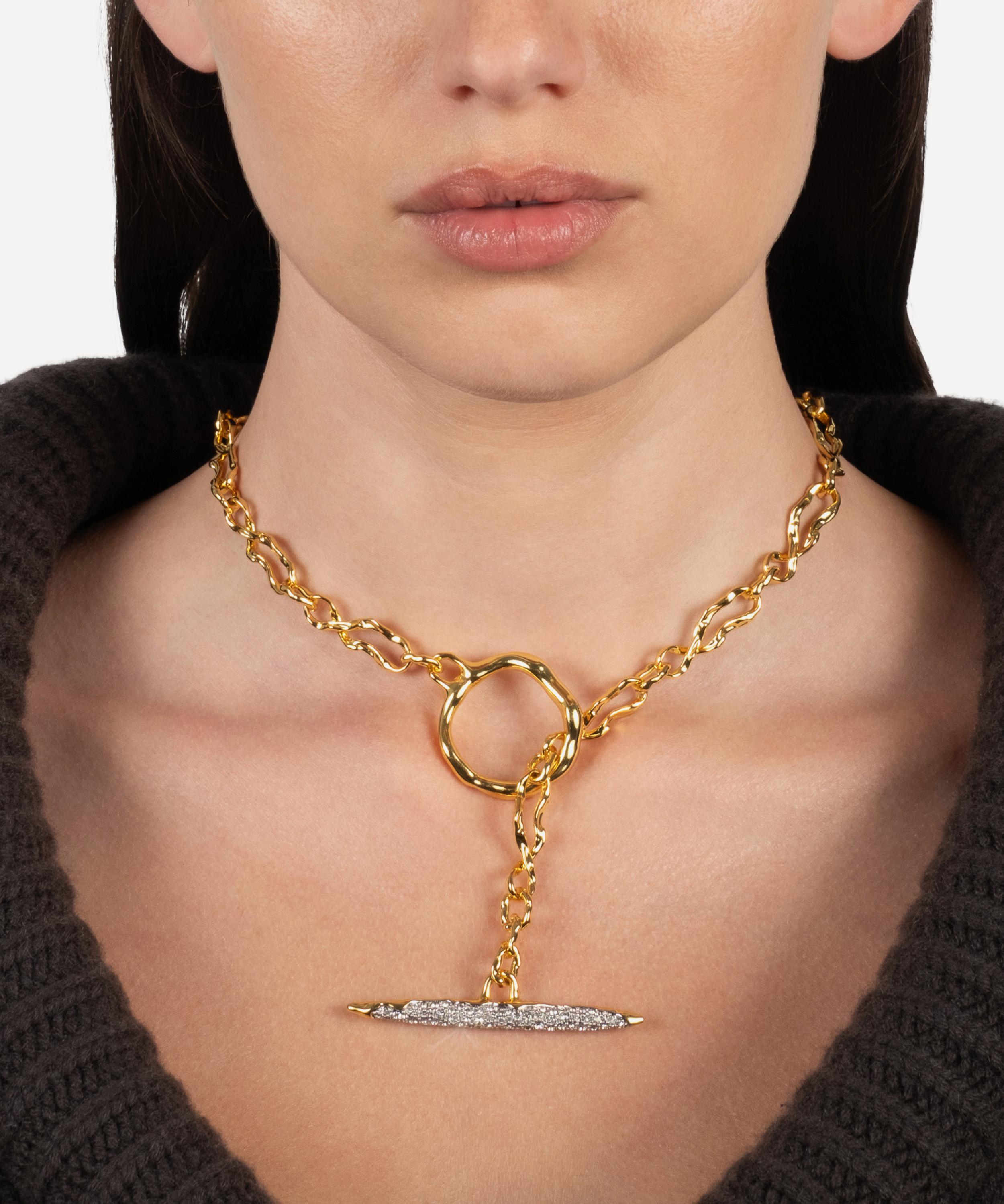 Exemplifying the brand’s bold and artistic aesthetic, it’s crafted from 14ct gold-plated brass, featuring a molten, organic chain with a toggle and T-bar covered in glistening crystals. Style it as a solo piece or layer with other necklaces.
