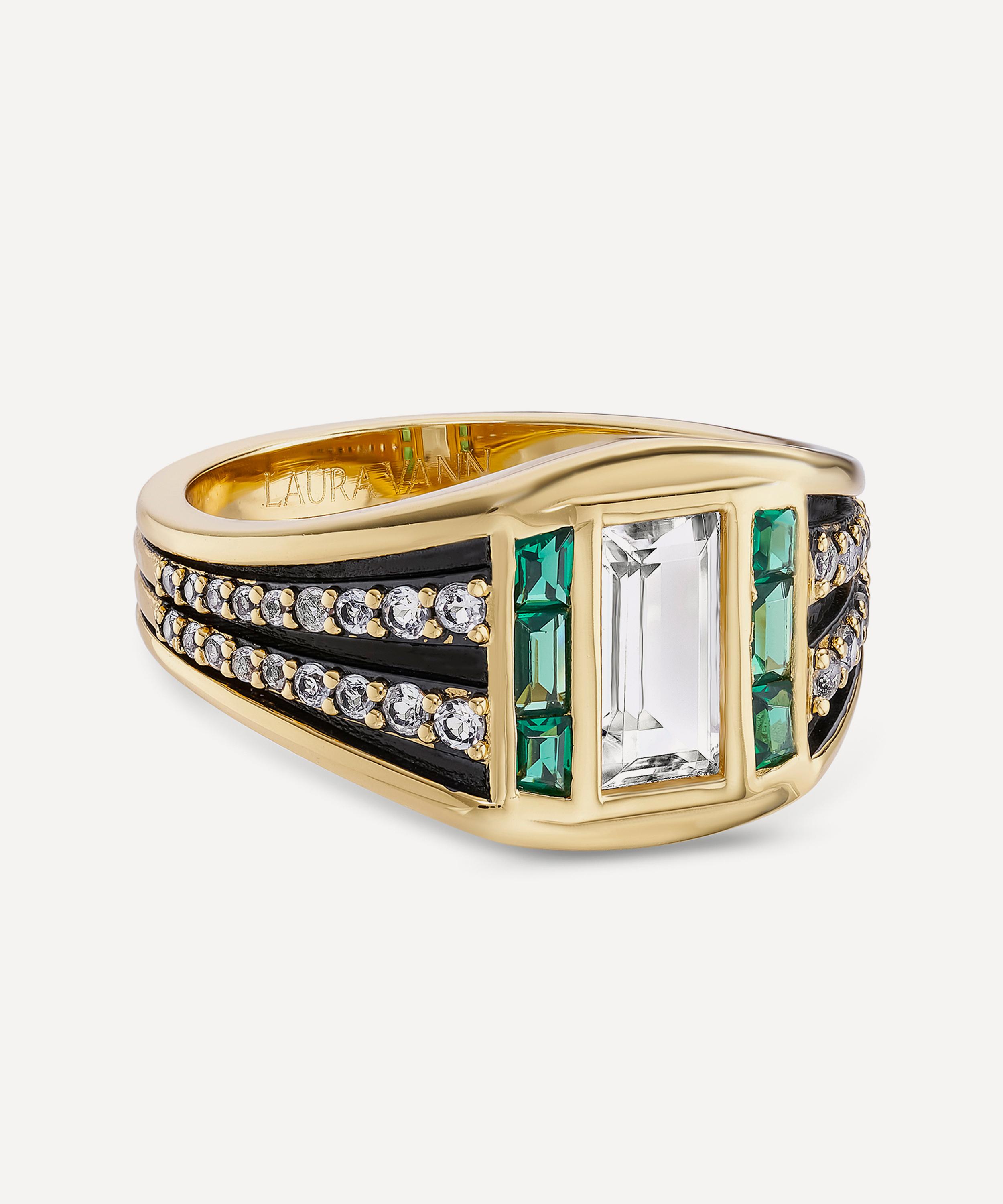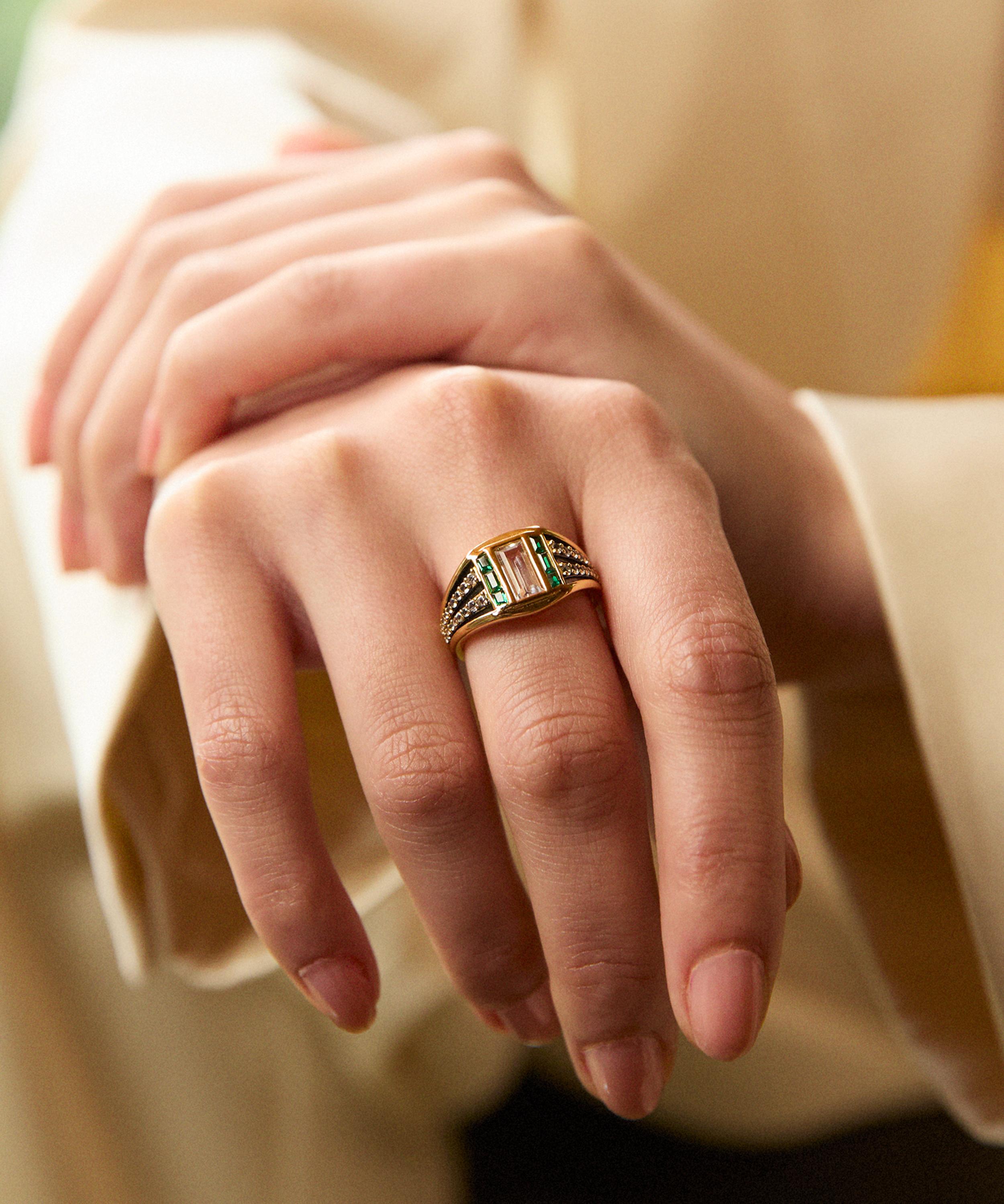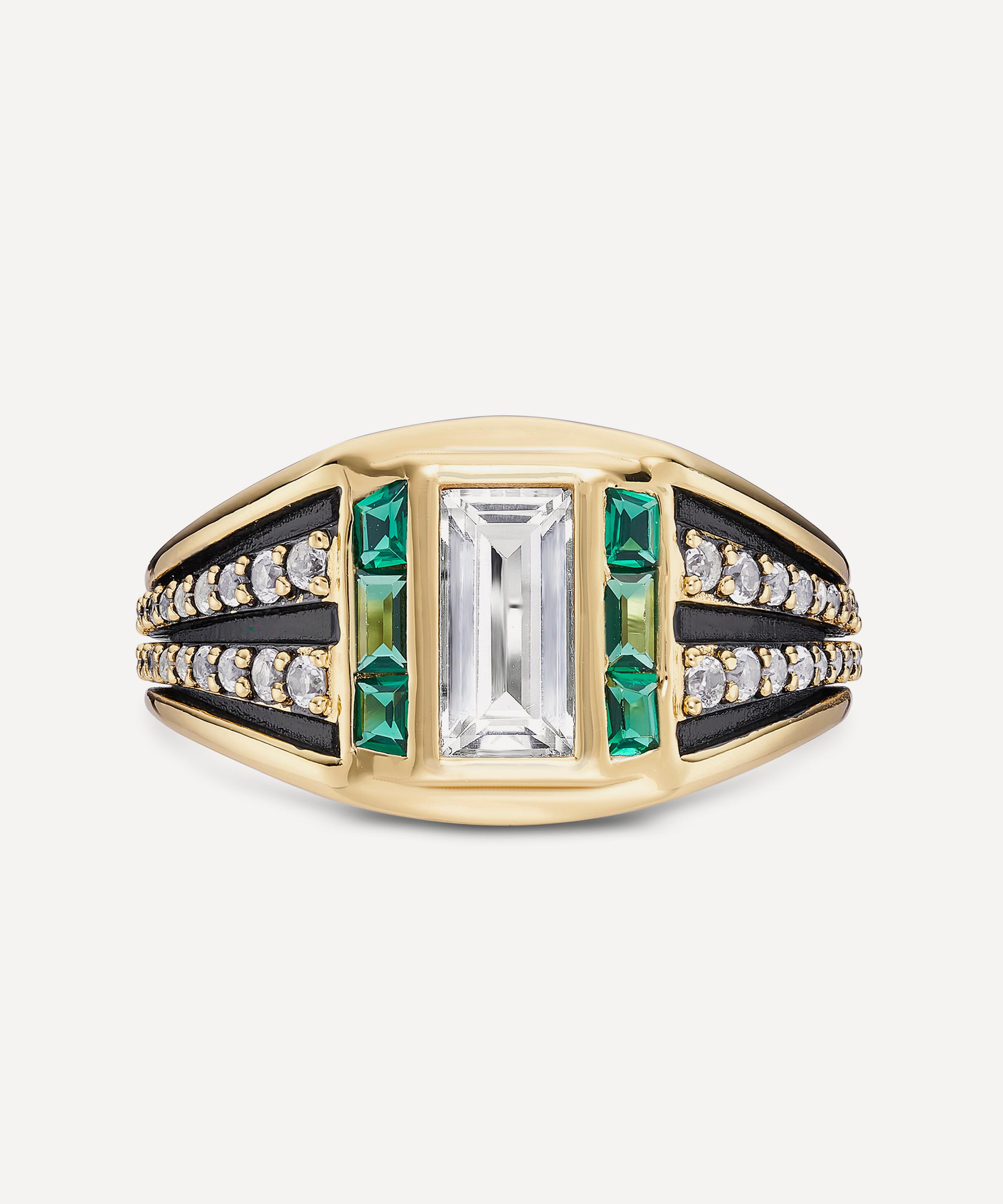 Showcasing modern Art Deco influences, this ring is crafted from sterling silver plated in 14ct gold vermeil, punctuated by a baguette-cut white topaz framed by green cubic zirconia. The chunky band features contrasting sections, creating a layered finish. Beautifully styled as a solo piece, it can also be paired with other band rings and cocktail rings for a curated stack.
