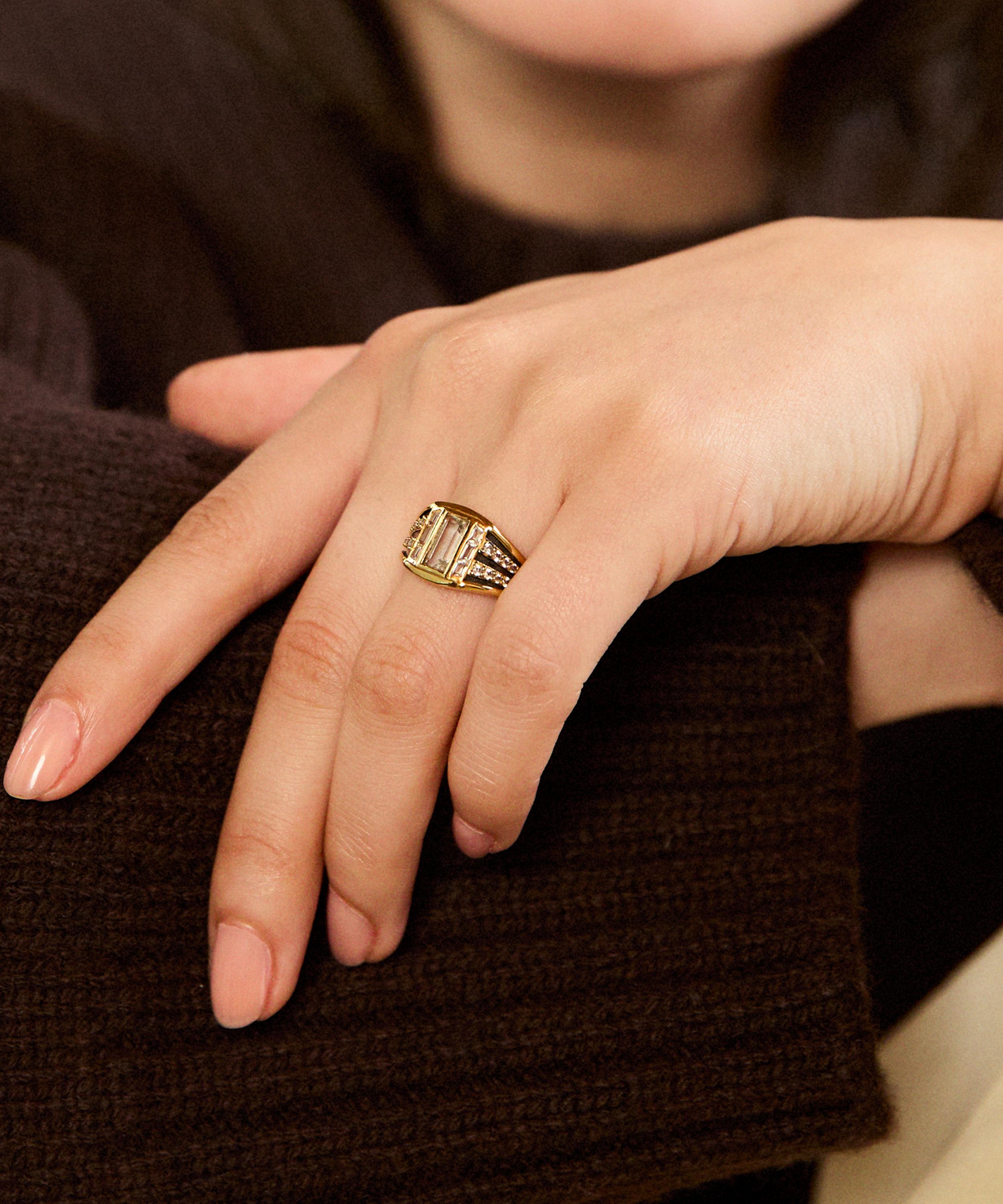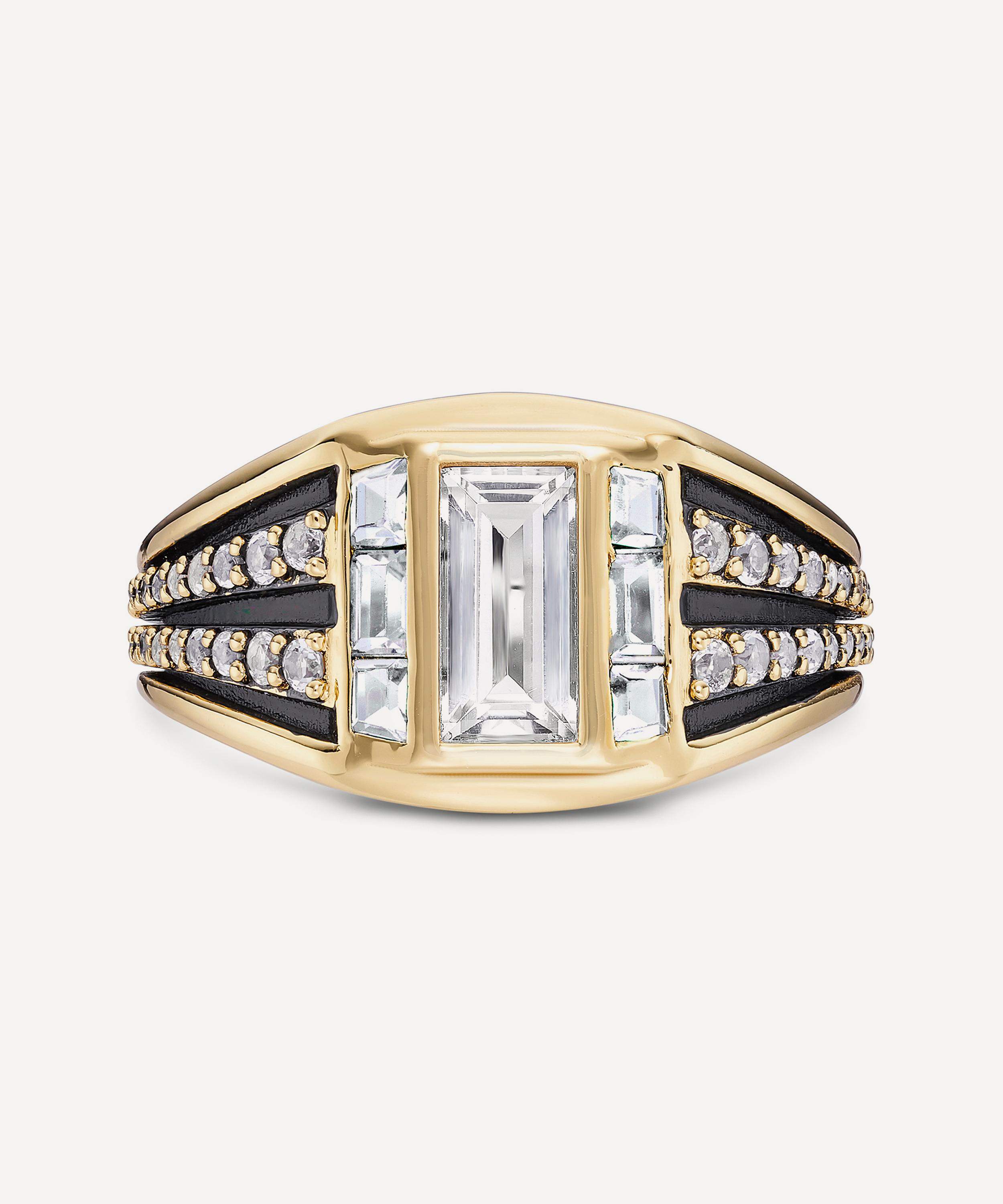 Showcasing modern Art Deco influences, this ring is crafted from sterling silver plated in 14ct gold vermeil, punctuated by a baguette-cut white topaz framed by green cubic zirconia. The chunky band features contrasting sections, creating a layered finish. Beautifully styled as a solo piece, it can also be paired with other band rings and cocktail rings for a curated stack.