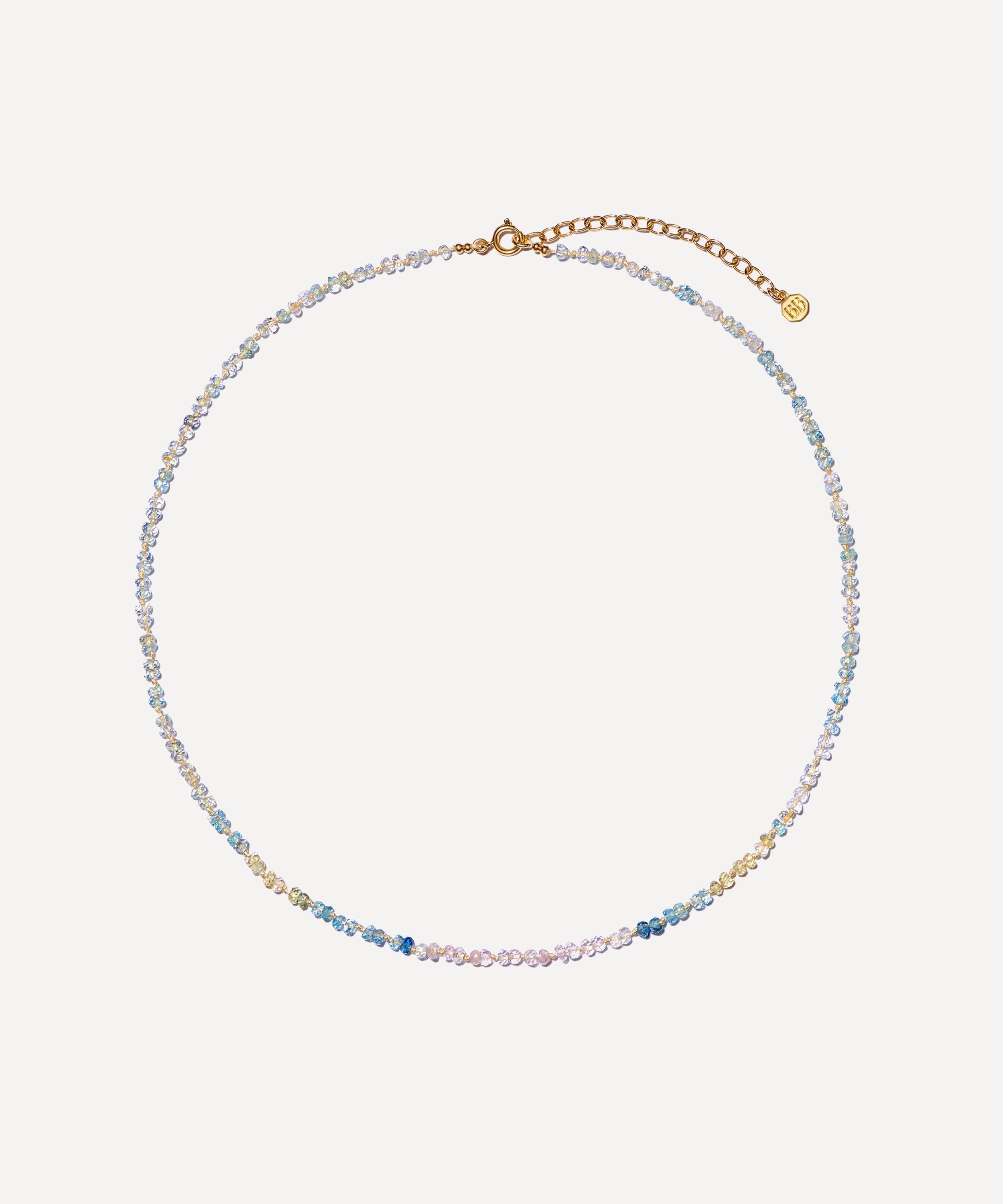Add a playful pop of colour to your outfit and draw all eyes on you with this mood-boosting bead necklace from Bon Bon Jewellery Club. Handcrafted from sterling silver plated in 14ct gold vermeil, it features a single thread knotted with delectable aquamarine beads – a gemstone linked to the tranquillity of the sea. Style it as a solo piece, stack it with contrasting gold chains and pendant necklaces or layer it with other beaded designs from the brand for a unique take on dopamine dressing.