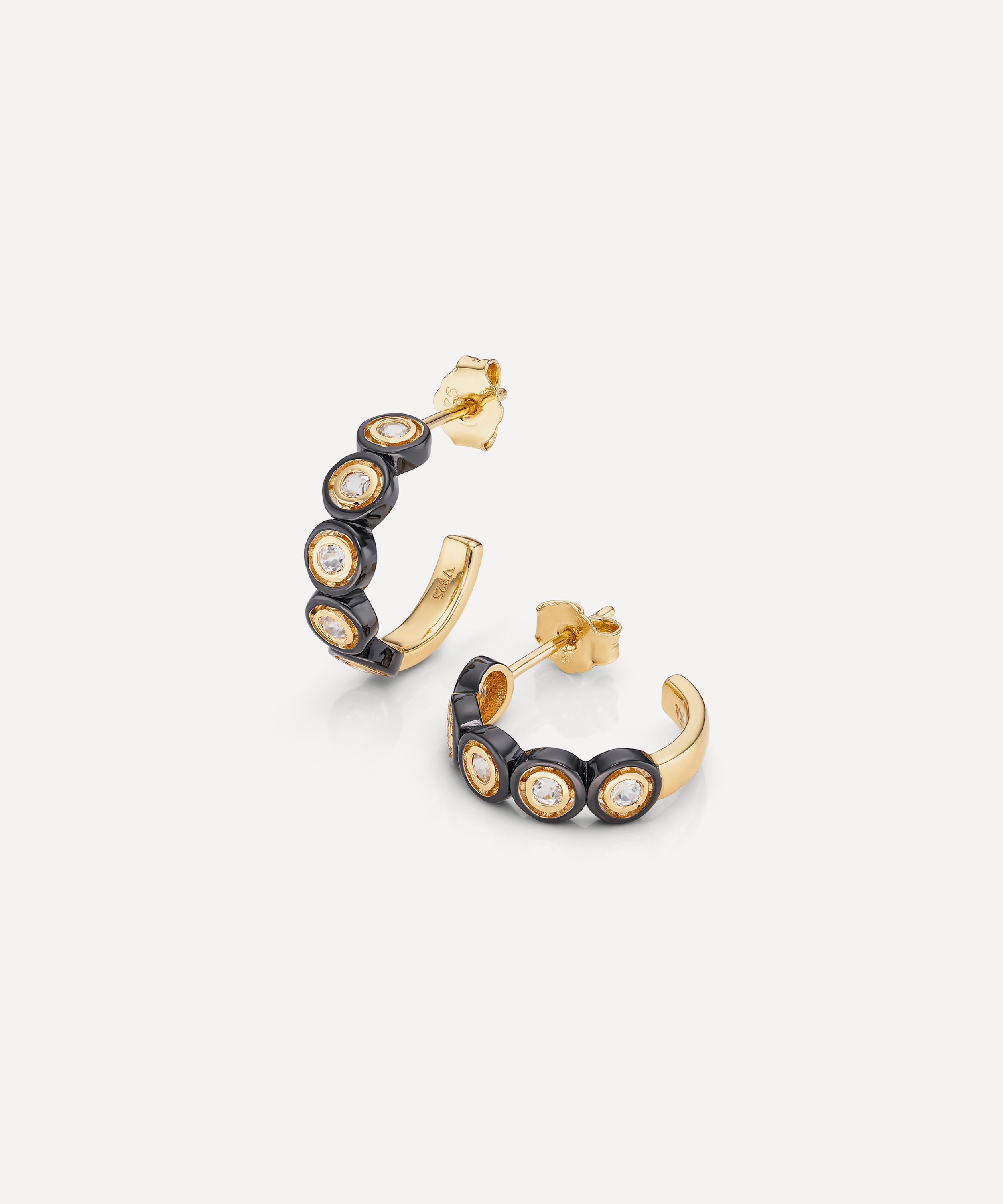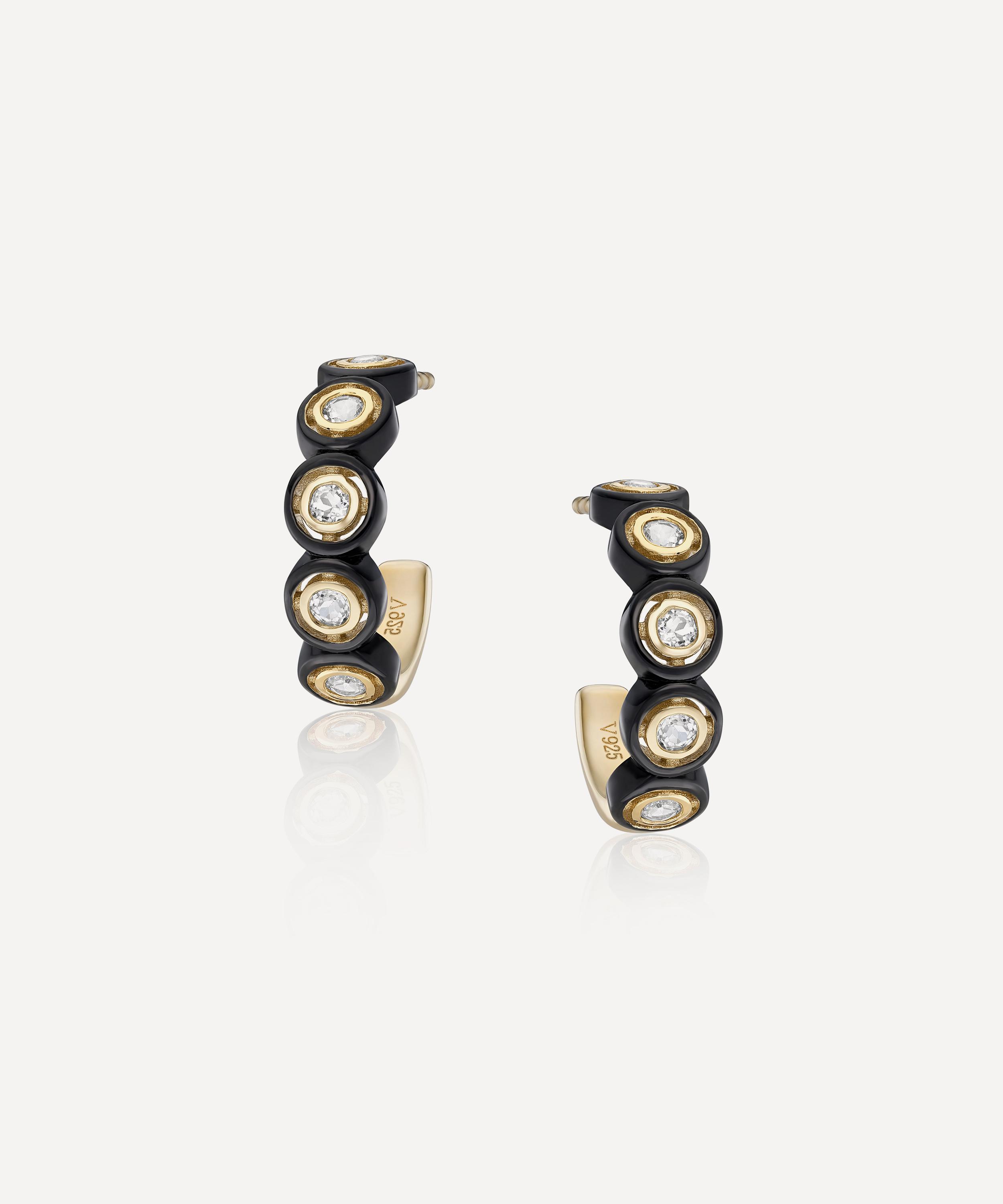 Embedded in the bold contrasts of Art Deco, each huggie is crafted from sterling silver plated in 14ct gold vermeil with round-cut white topaz stones set against black circles. Sculptural yet versatile, they bring an architectural accent when worn solo or styled in a curated stack of studs and hoops.