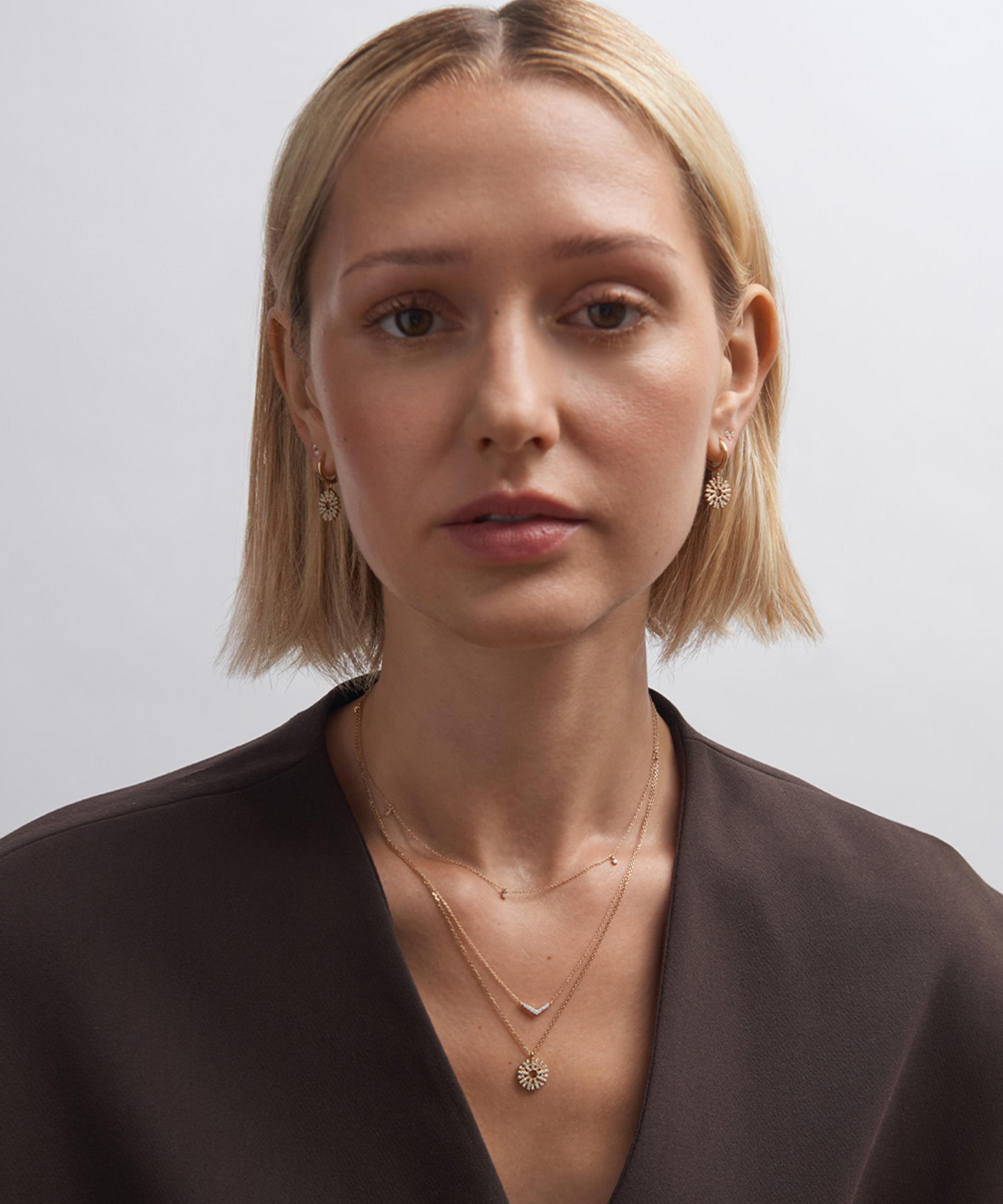 Rendered in solid 14ct gold, it features single cut diamonds arranged in a sun motif to reflect the beams of our most powerful star. Suspended from a fine trace chain, style yours solo, incorporate it into a curated stack, or pair it with matching pieces from the Rising Sun collection.