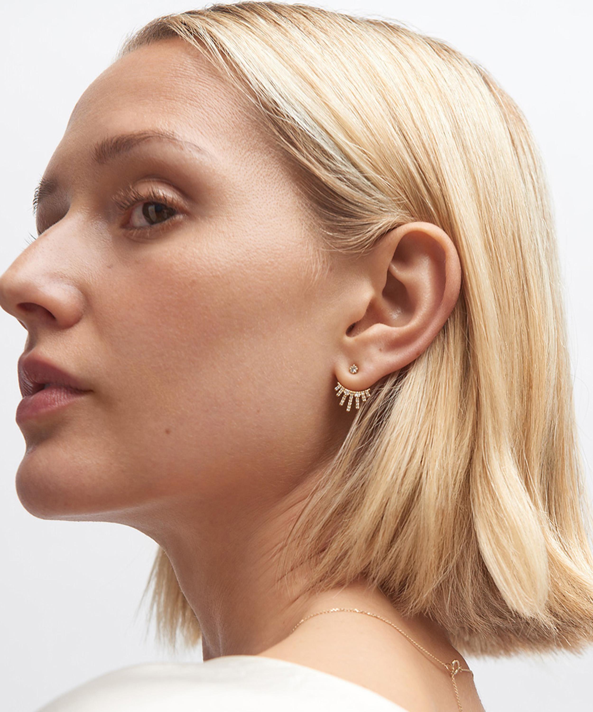 Rendered in solid 14ct gold, each earring features single cut diamonds arranged in a sun ray motif to reflect the beams of our most powerful star. Style yours solo, incorporate them into a curated stack, or pair with matching pieces from the Rising Sun collection.