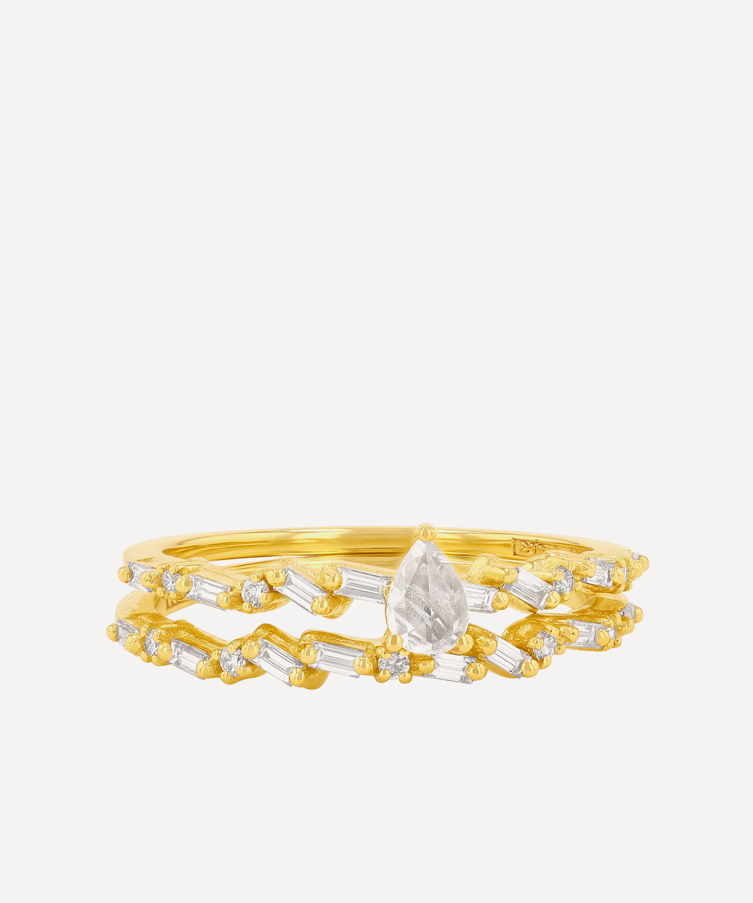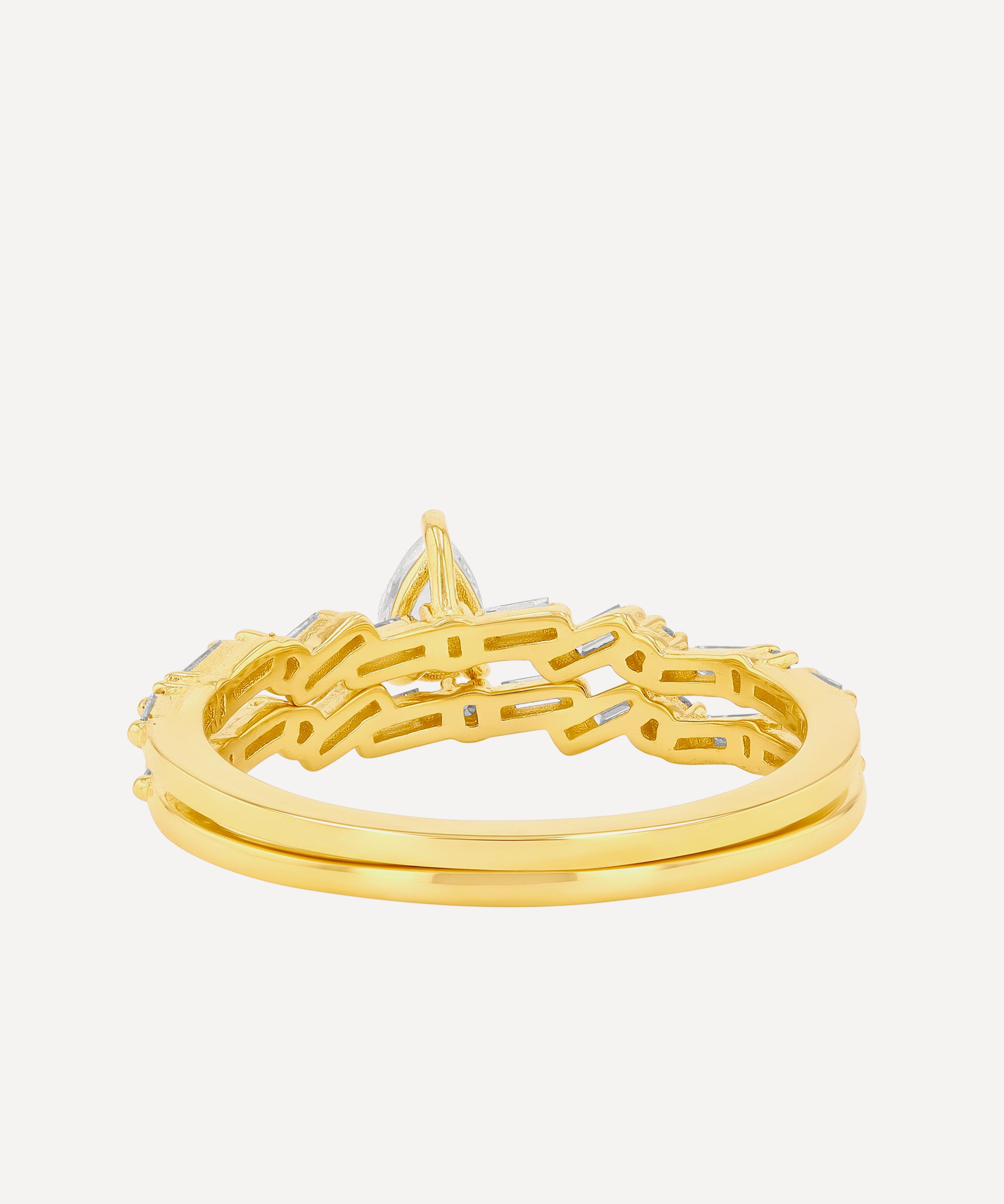 Handcrafted from solid 14ct gold, it is adorned with a central pear-shaped rose cut white diamond, surrounded by two matching contour bands illuminated by baguette cut accents in a prong setting. Designed as a celebration of individuality, it perfectly reflects the designer’s passion for creating unparalleled yet precious pieces. Style it solo for an unforgettable look or stack it with other styles.