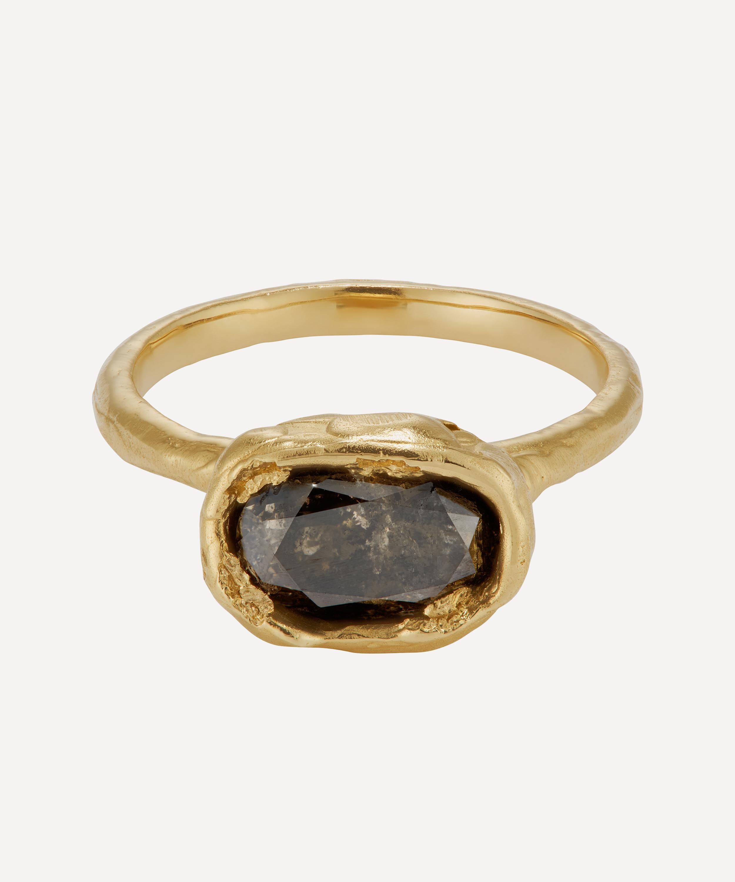 Inspired by medieval jewellery hoards found across Scotland, it features an oval, brilliant cut salt and pepper diamond set in an organic, softly distressed texture, as if it has been uncovered like buried treasure. Ellis Mhairi Cameron pieces are designed to form sculptural stacks – pair with a wedding band from the collection for the full statement look.