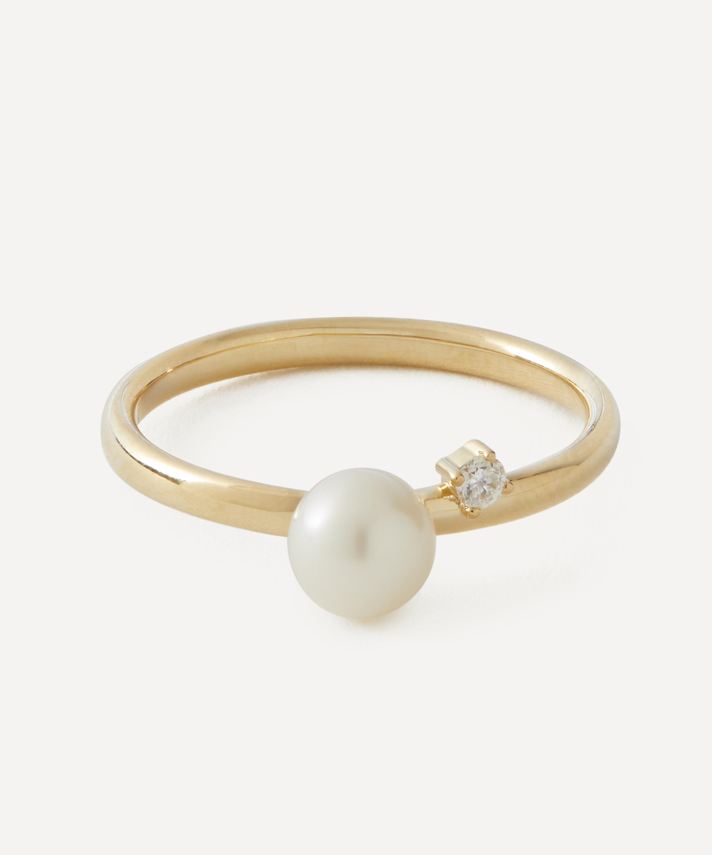 Crafted with a solid 14ct gold band, it is adorned with a gleaming pearl. A single white diamond sits just beside the pearl, appearing as if floating on top of the design for a luminous finish. Incorporate it into your ring stack for a sophisticated edge, wear it alone or pair it with matching necklaces and earrings from the collection.