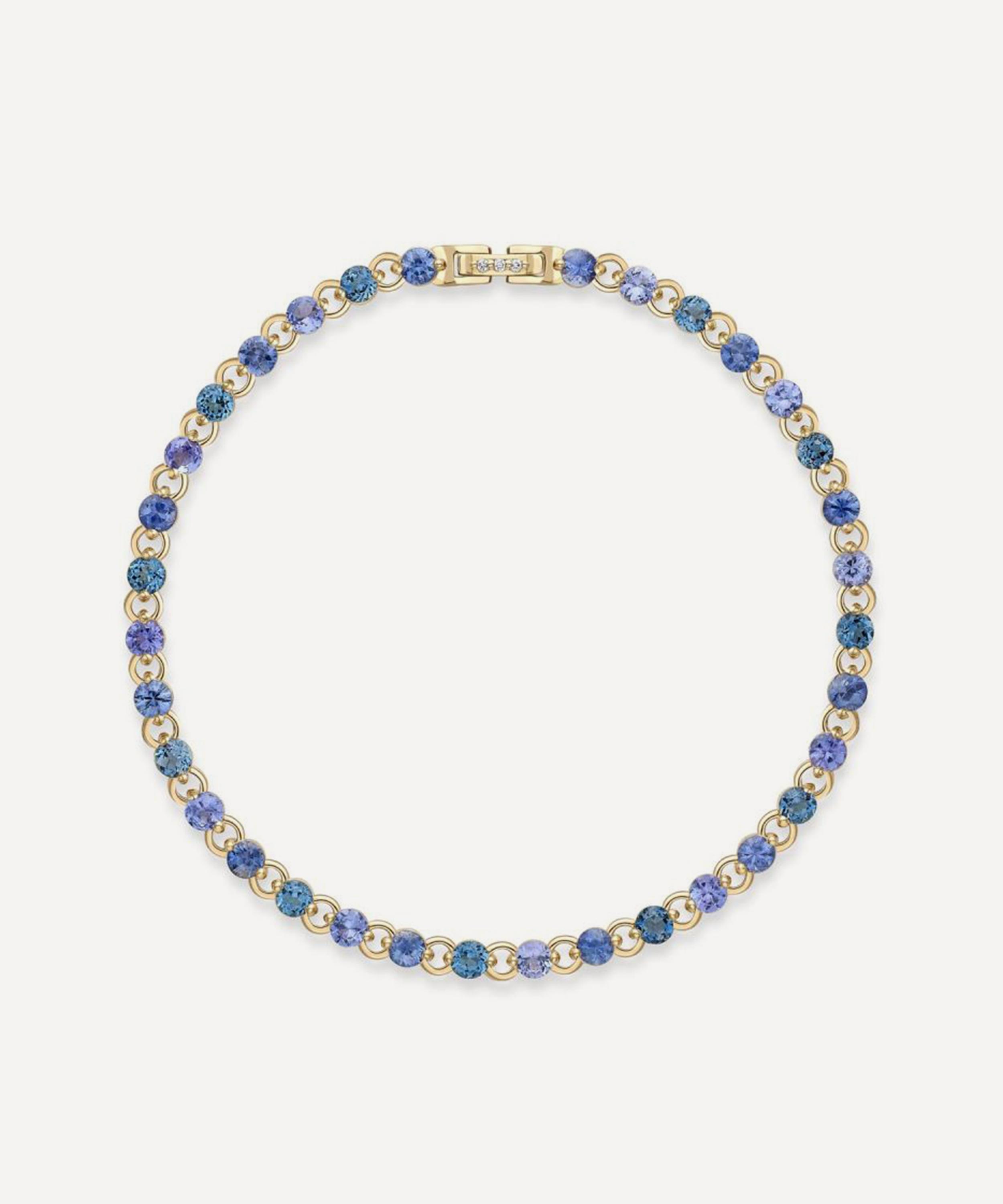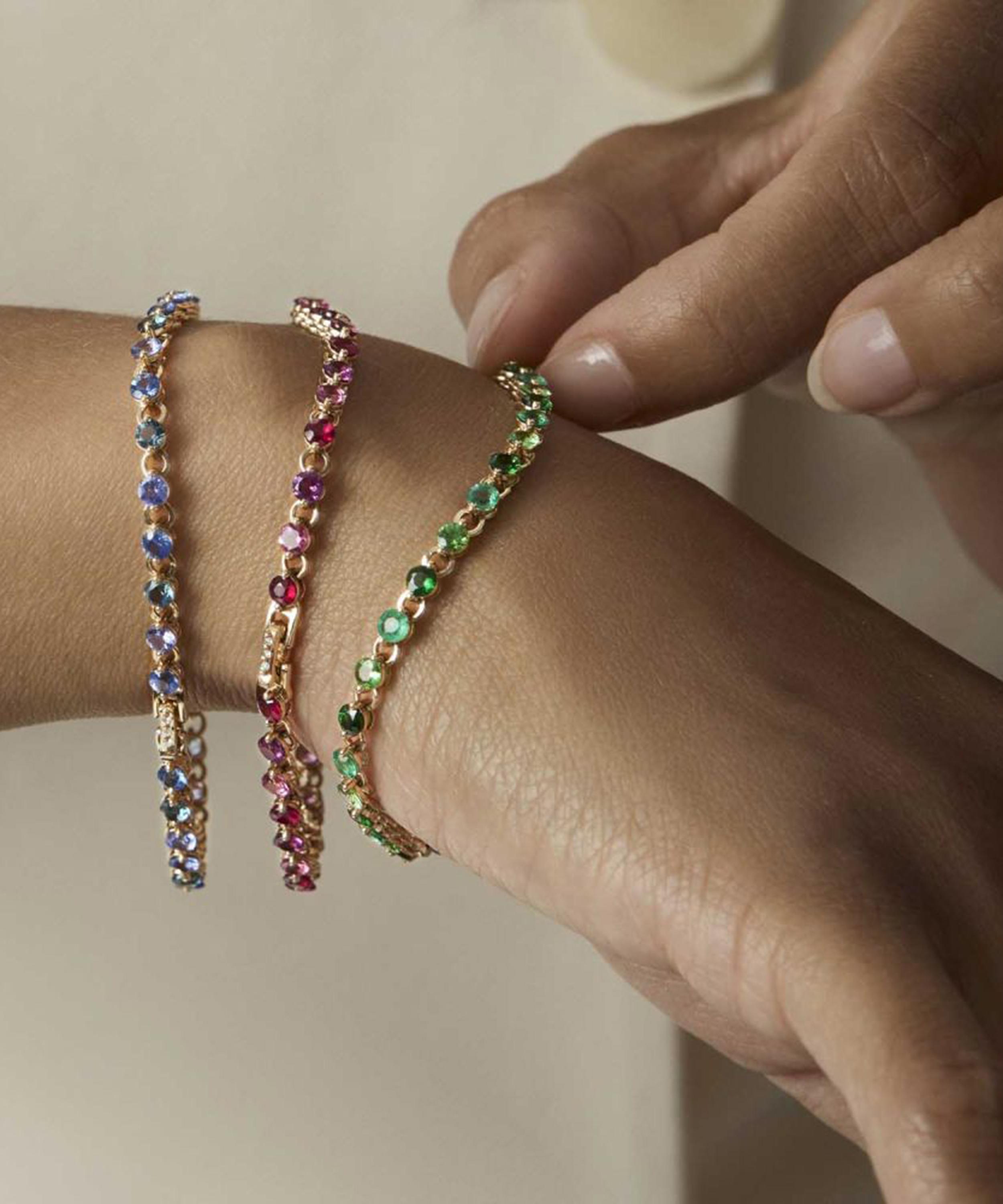 Inspired by classic tennis bracelets, it’s rendered in 14ct gold, featuring vibrant gemstones in tranquil blue tones, including sapphire, tanzanite and topaz, with a sprinkling of diamonds adorning the box clasp. Wear it solo with a pair of elegant drop earrings, or incorporate into a layered wrist curation for more impact.