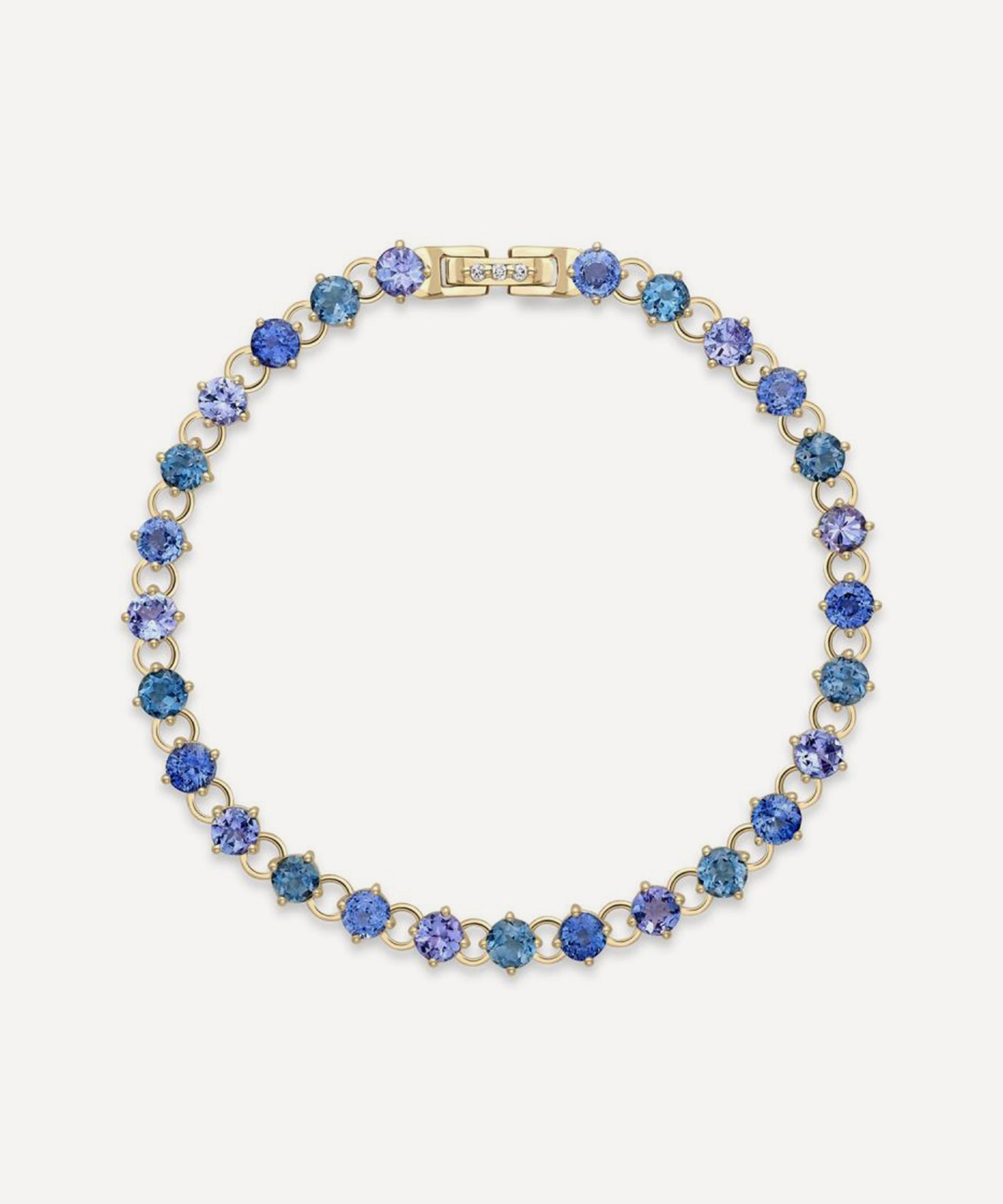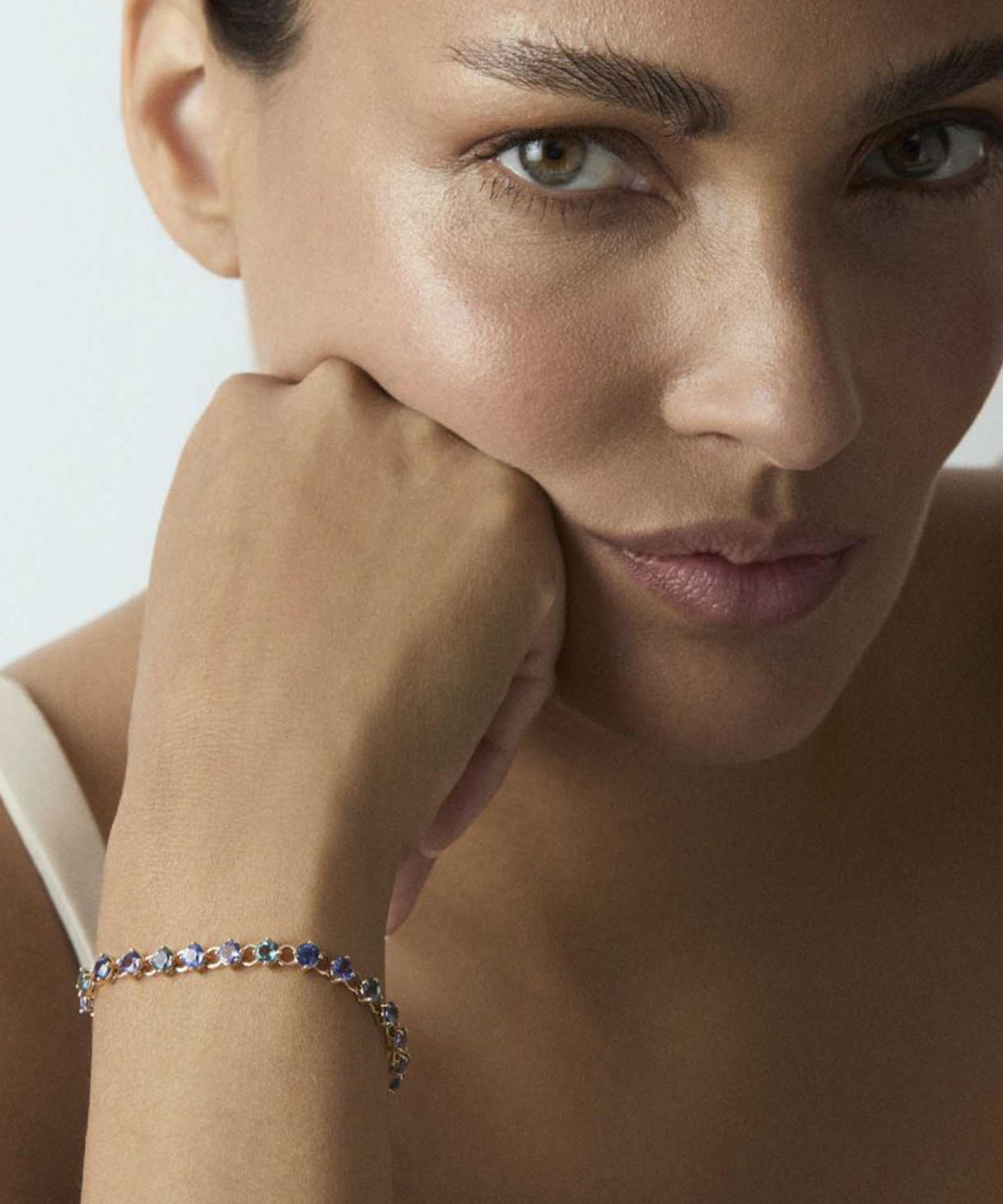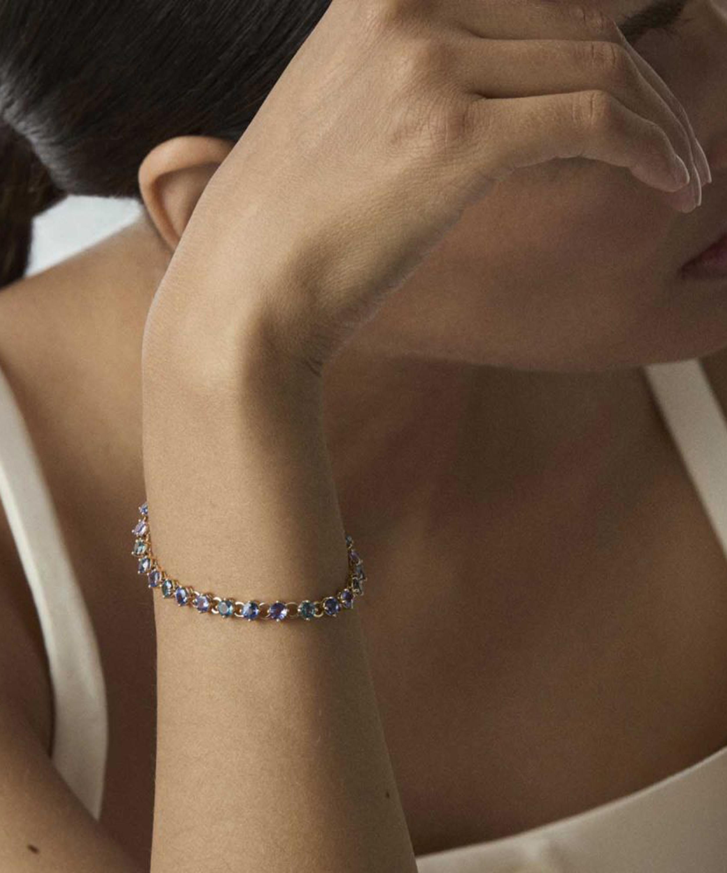 Inspired by classic tennis bracelets, it’s rendered in 14ct gold, featuring vibrant gemstones in tranquil blue tones, including sapphire, tanzanite and topaz, with a sprinkling of diamonds adorning the box clasp. Wear it solo with a pair of elegant drop earrings, or incorporate into a layered wrist curation for more impact.