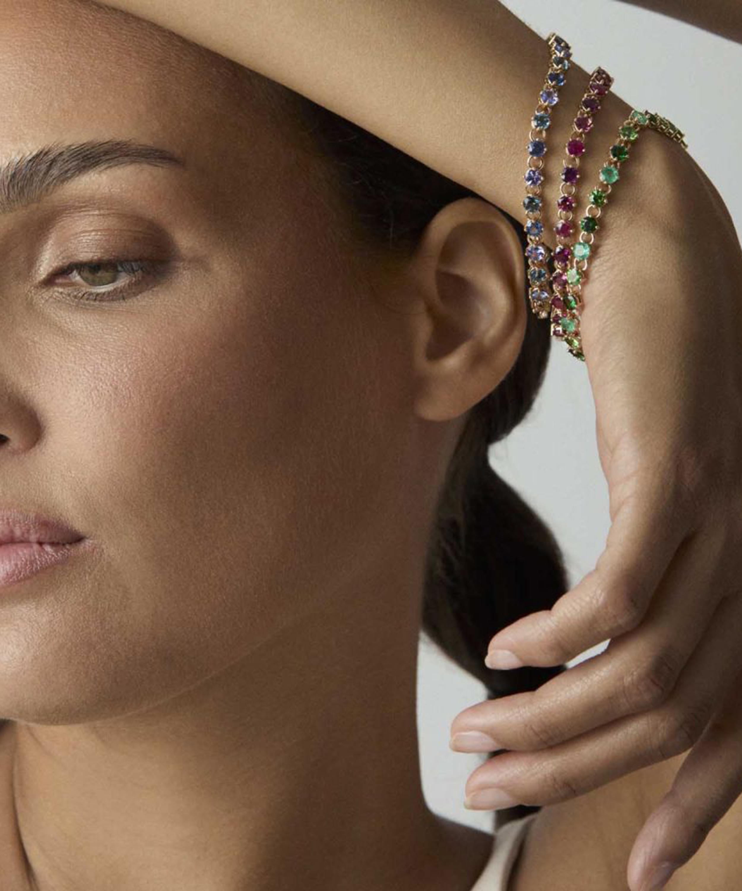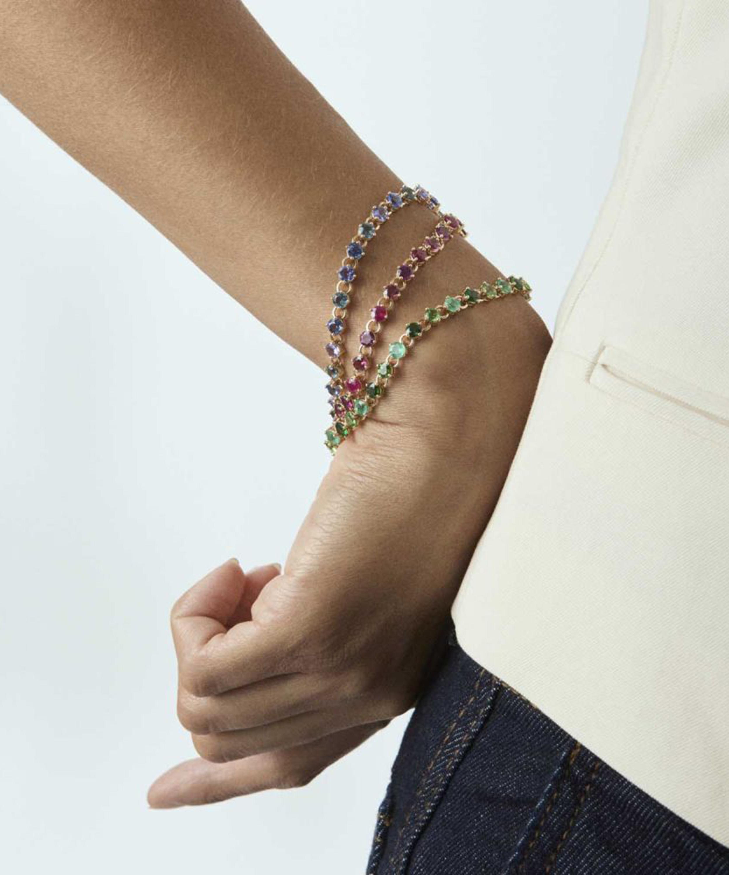Inspired by classic tennis bracelets, it’s rendered in 14ct gold, featuring vibrant gemstones in blush pink tones, including ruby, rhodolite and pink tourmaline, with a sprinkling of diamonds adorning the box clasp. Wear it solo with a pair of elegant drop earrings, or incorporate into a layered wrist curation for more impact.