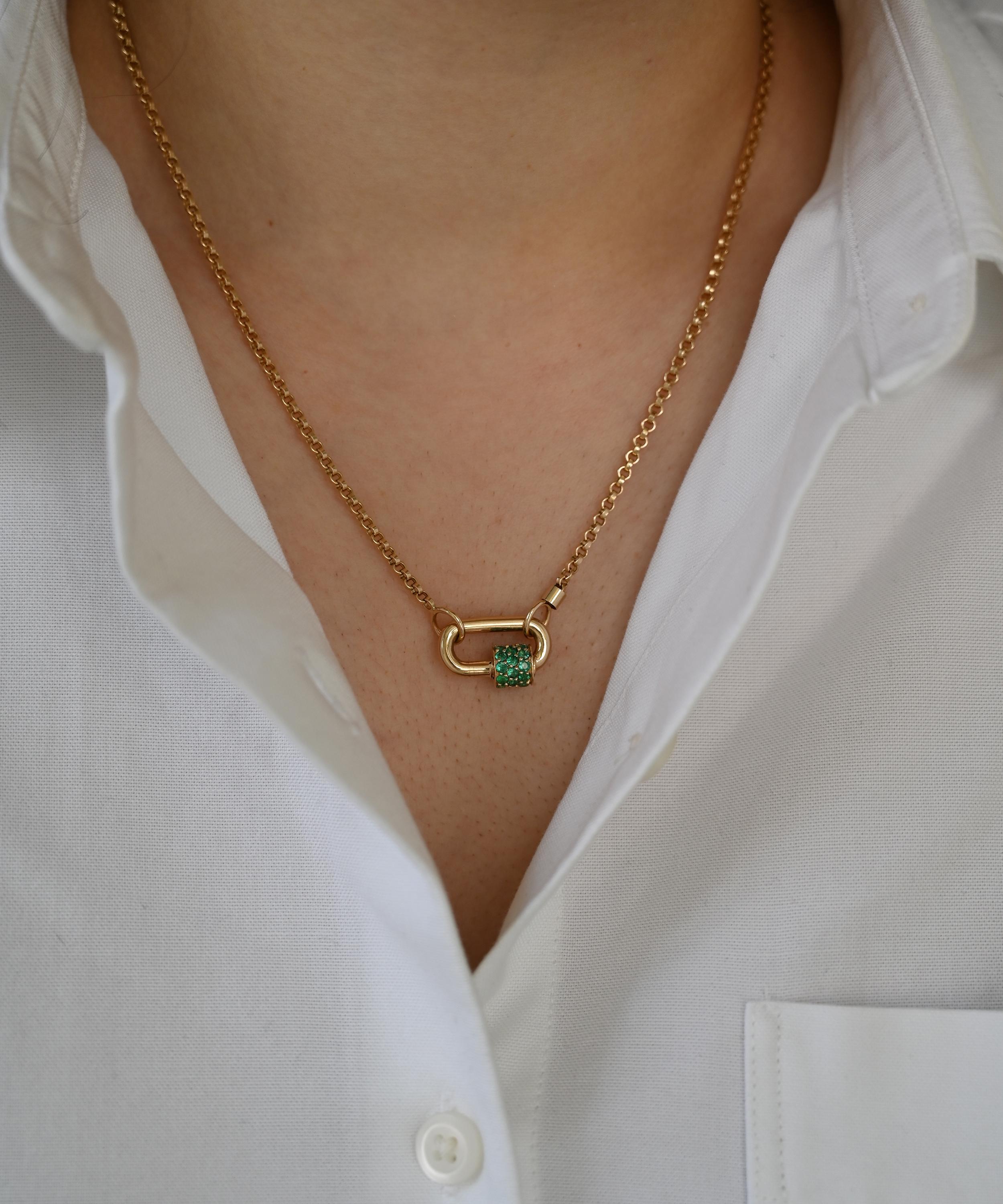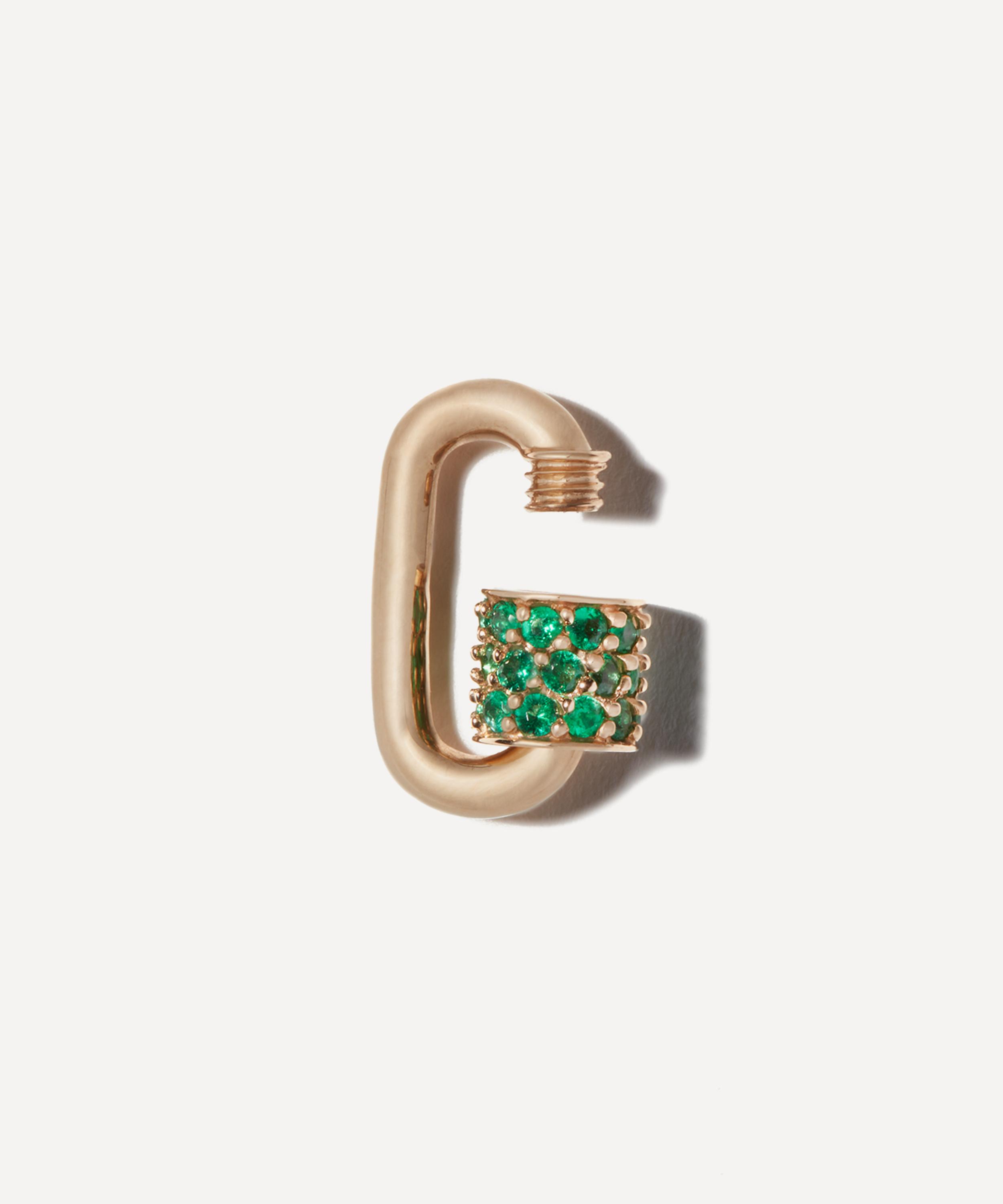 Complete your favourite chain from Marla Aaron with the brand’s Stoned Babylock clasp. Handmade from 14ct gold, it features Aaron’s signature carabiner lock adorned with an emerald embellished locking sleeve. Designed to be paired with one of the brand’s exceptional chains, it can be used as a connector, a clasp, or a charm holder. Spotlighting functional maximalism with a bold, yet refined look, it boasts endless styling possibilities, ideal for a necklace or bracelet.