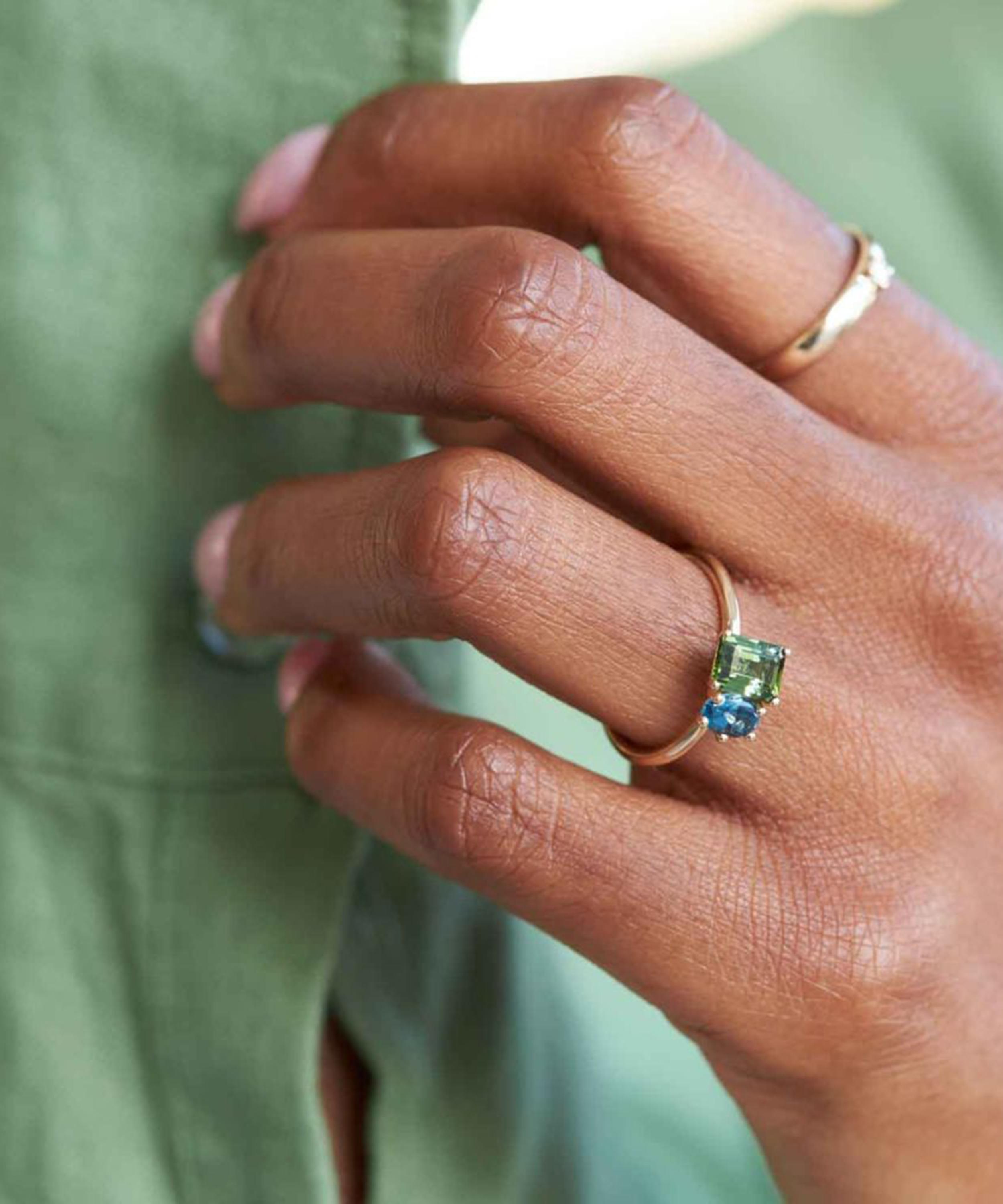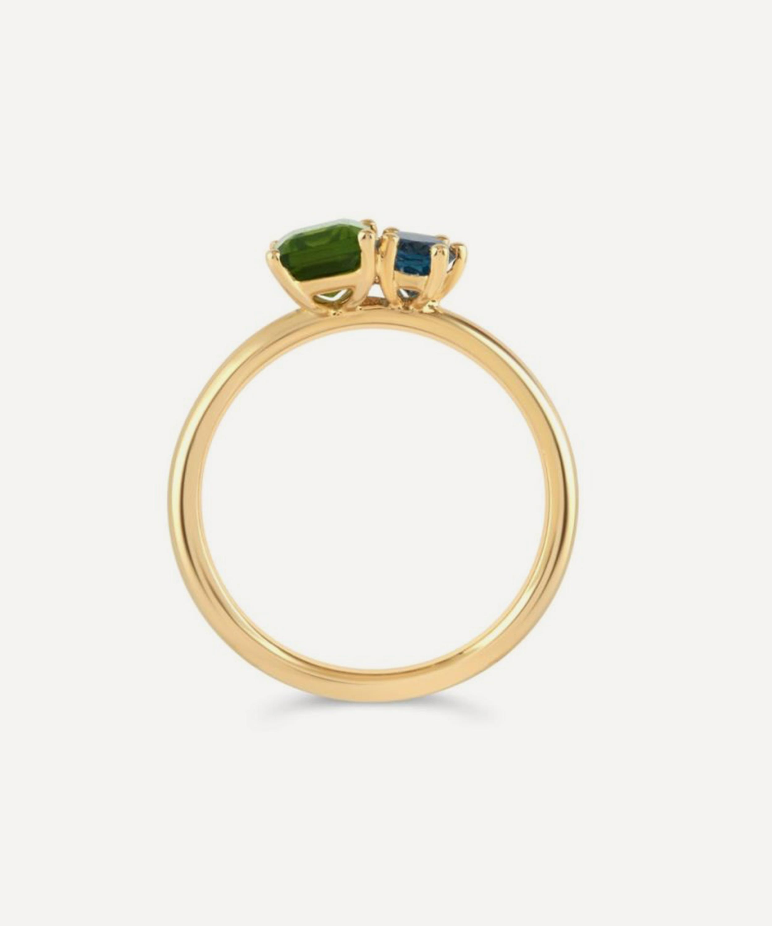 Declare your special bond with a loved one through Dinny Hall’s sentimental Toi & Moi ring. Expertly crafted from 14ct gold, it features a green tourmaline joined by a London blue topaz, both prong-set atop a slim, polished band. Style it as a solo statement piece or create a show-stopping curation of stacked rings.