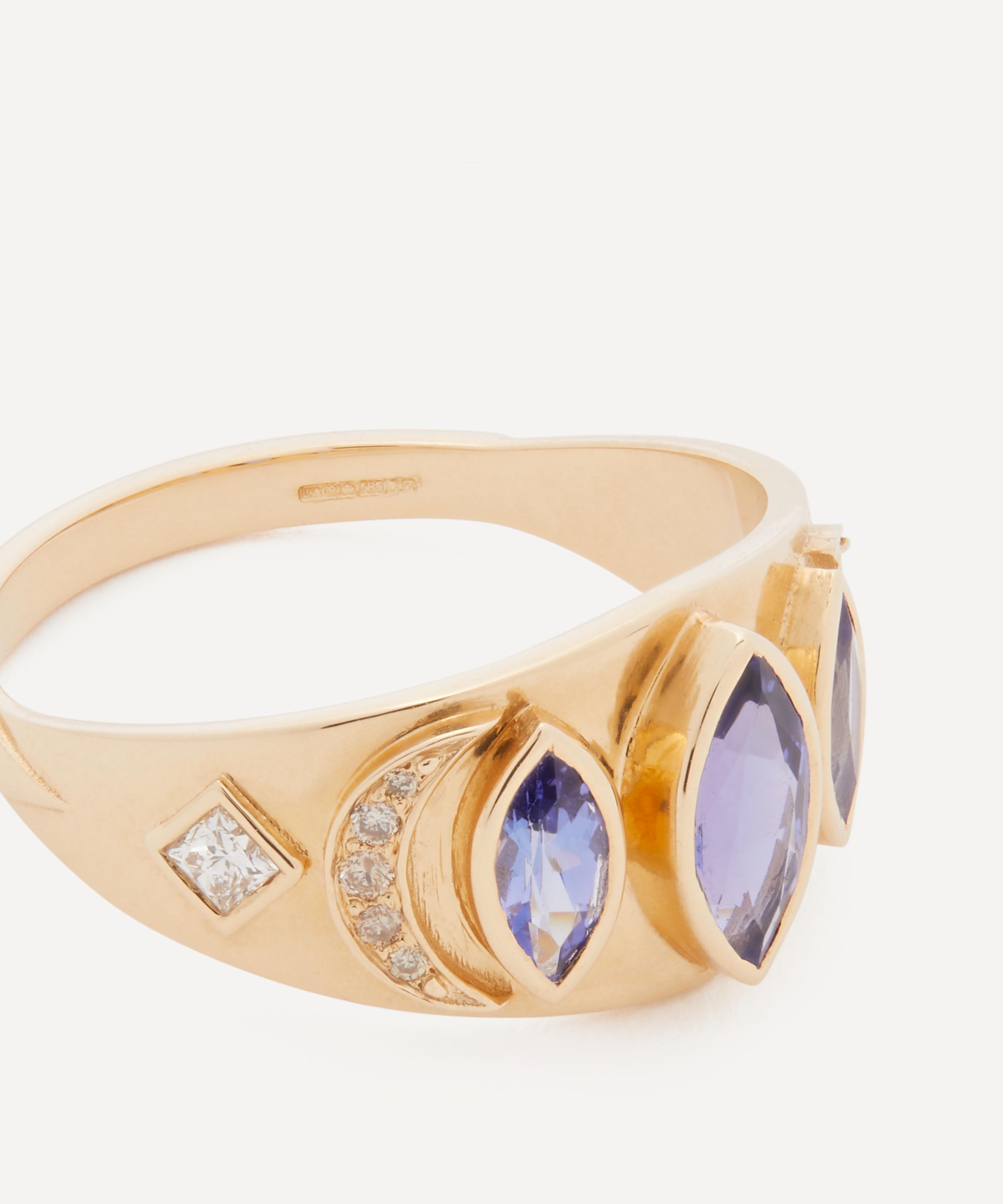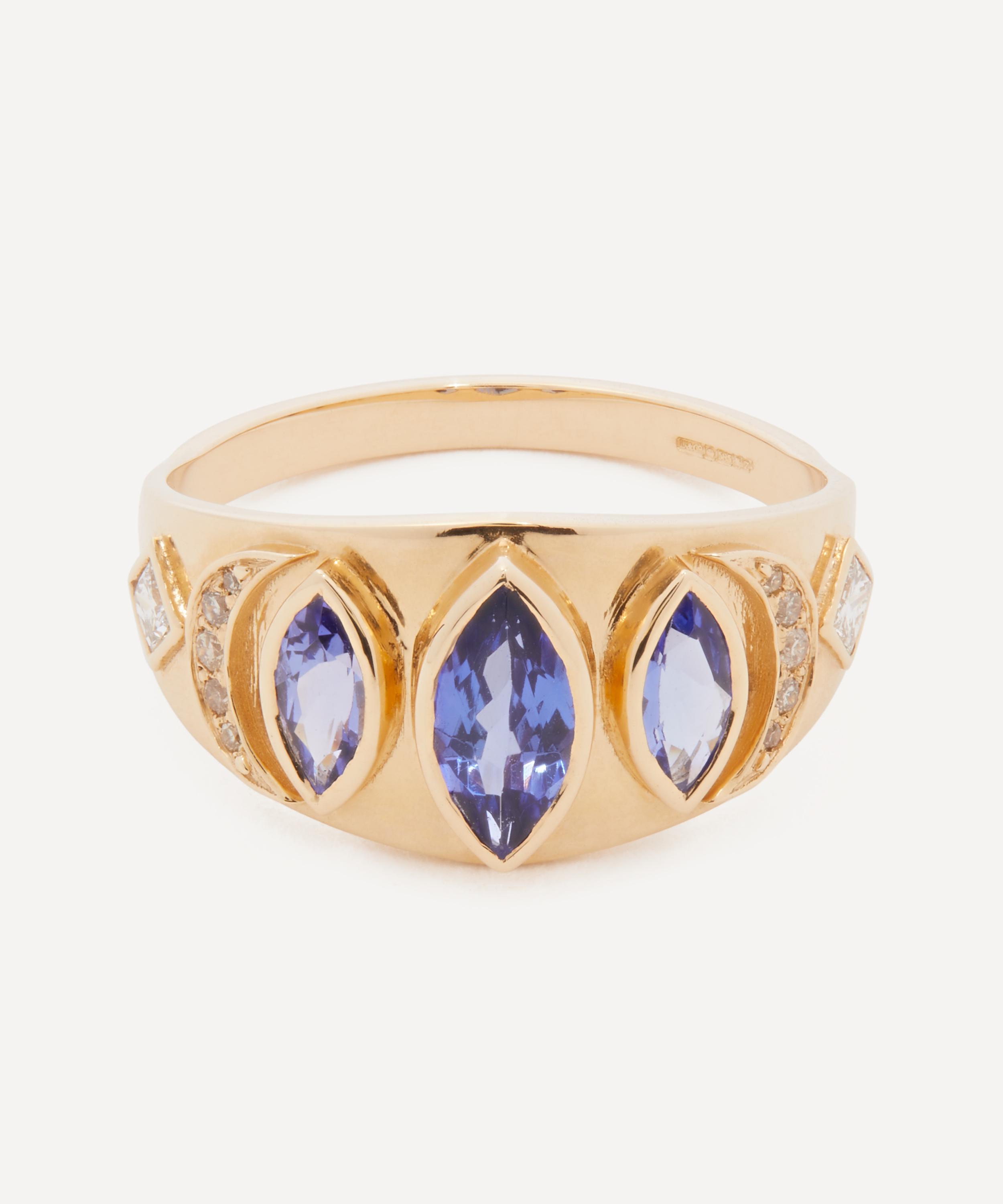Complete styled looks and draw on the spiritual energy of gemstones through this refined and colourful ring by Celine Daoust. Meticulously crafted from solid 14ct gold, it’s fashioned into a wide band set with two square-cut diamonds and crescent moons leading to a triple stone feature inspired by the Anja Eye, an important symbol in Hinduism. It’s beautifully adorned with three marquise-cut tanzanite stones – known to stimulate imagination and creativity. Radiating with a totemic energy, this stunning heirloom piece boasts the perfect finishing touch, wear it solo or stacked.