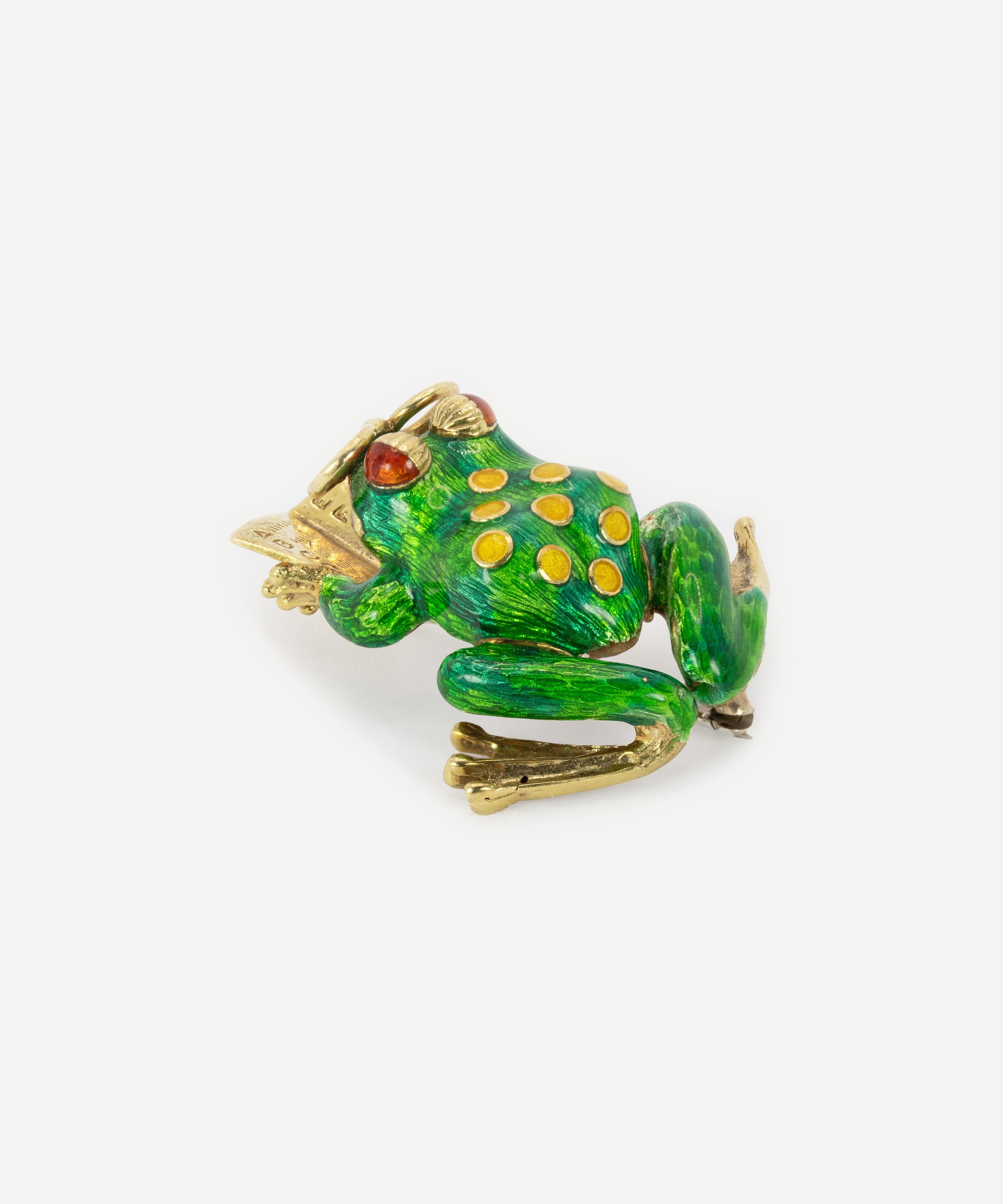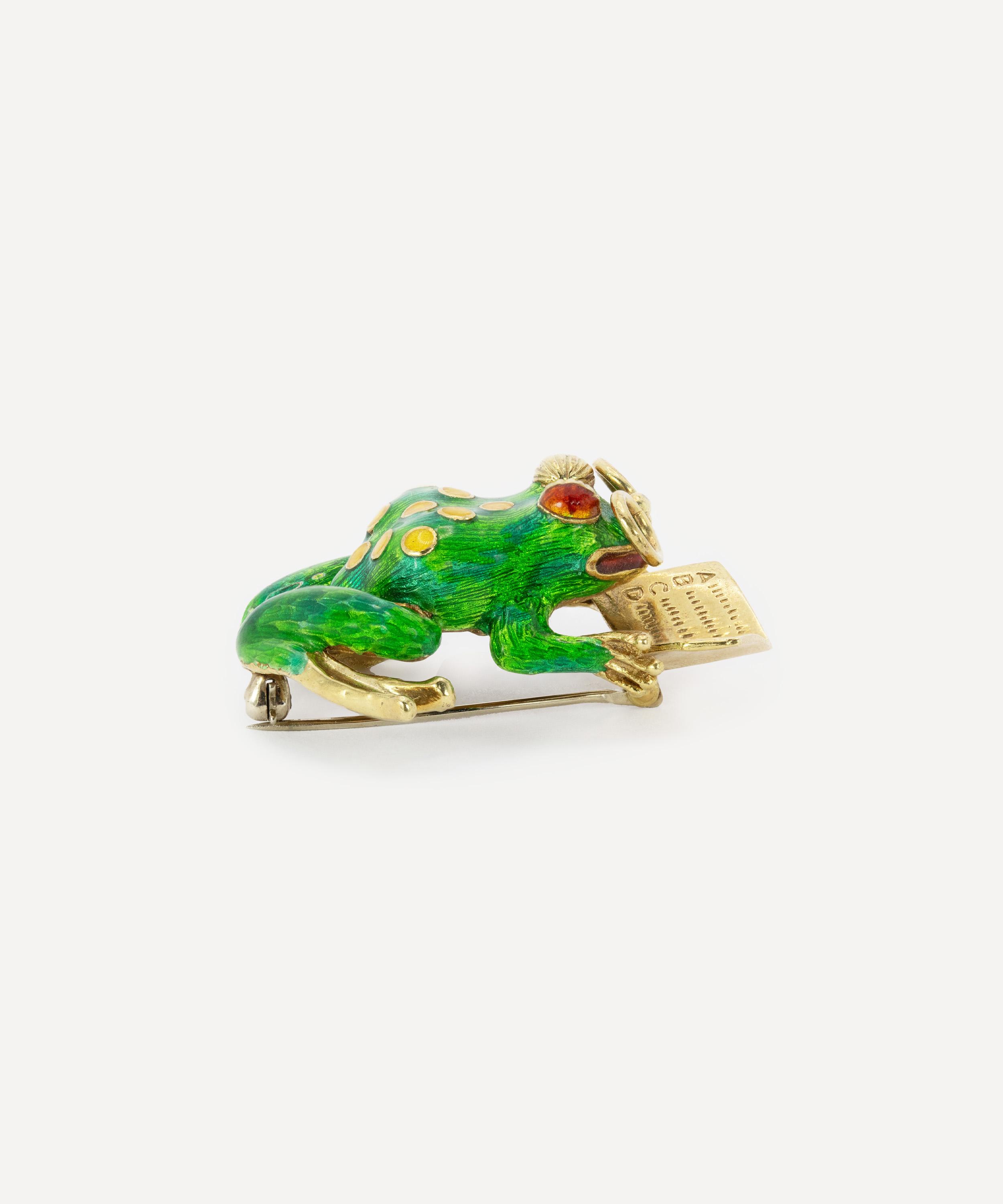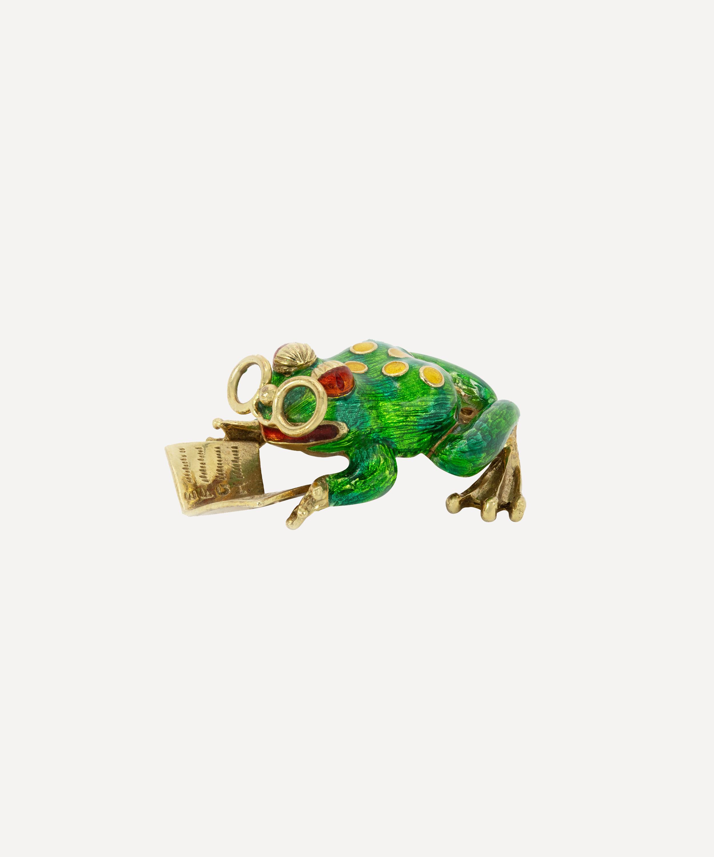 Brimming with character, this brooch is a one-of-a-kind statement piece from Kojis. Crafted from 14ct gold, it features a green enamel frog with yellow spots and red eyes, reading an ABC’s book while wearing glasses. Wear it alone or team it with several other artisanal brooches and pins for a maximalist take on traditional formalwear.