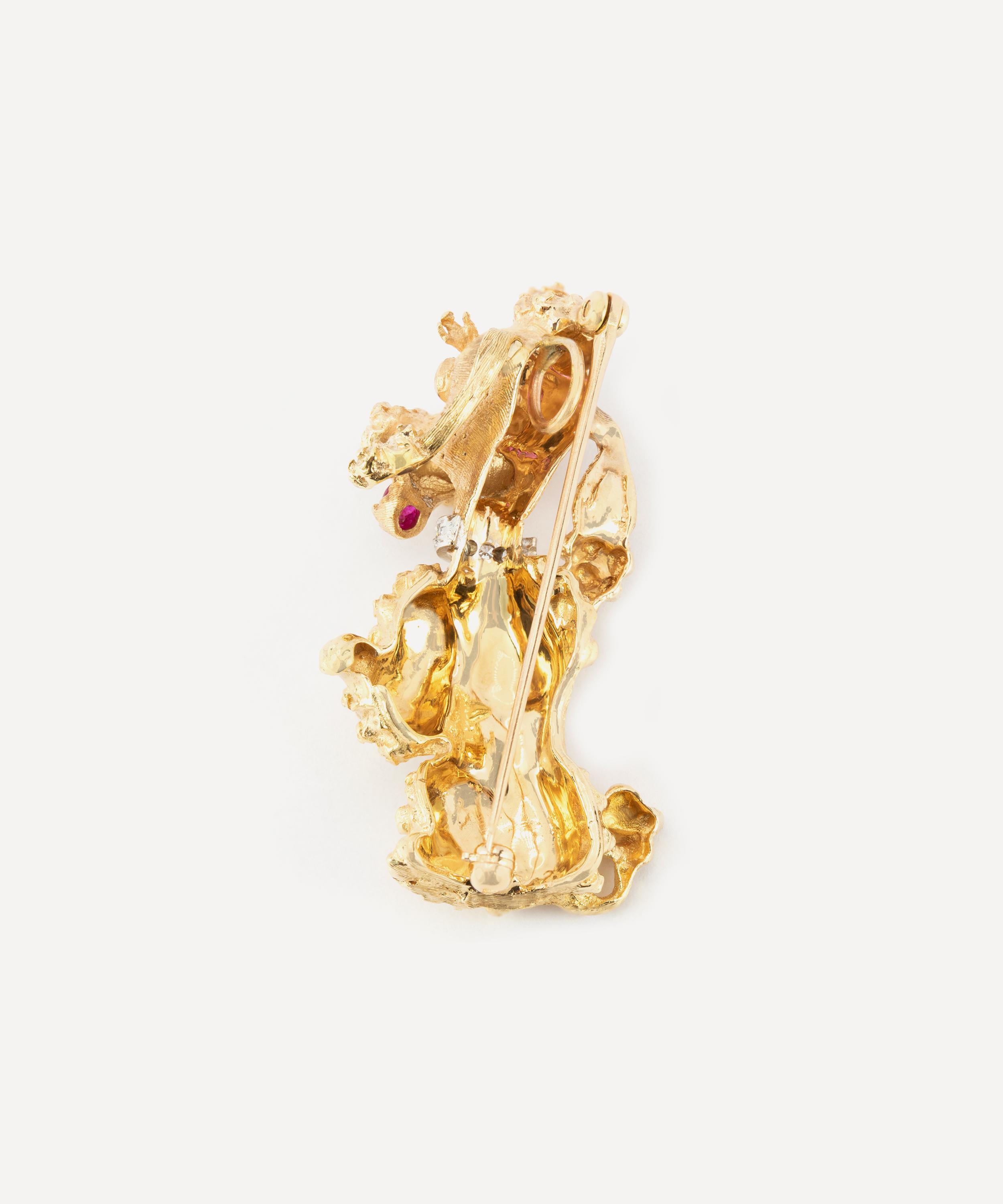 Crafted from solid 14 carat gold, this brooch depicts a French poodle standing on its hind legs. The poodle wears a diamond collar, made of five round, brilliant cut white diamonds and its eyes, nose and mouth are set with vivid red rubies for a striking contrast. An elegant example of timeless vintage jewellery, wear it alone to showcase its delightfully novel appeal, or team it with several other playfully designed brooches and pins for a light-hearted take on traditional formalwear.