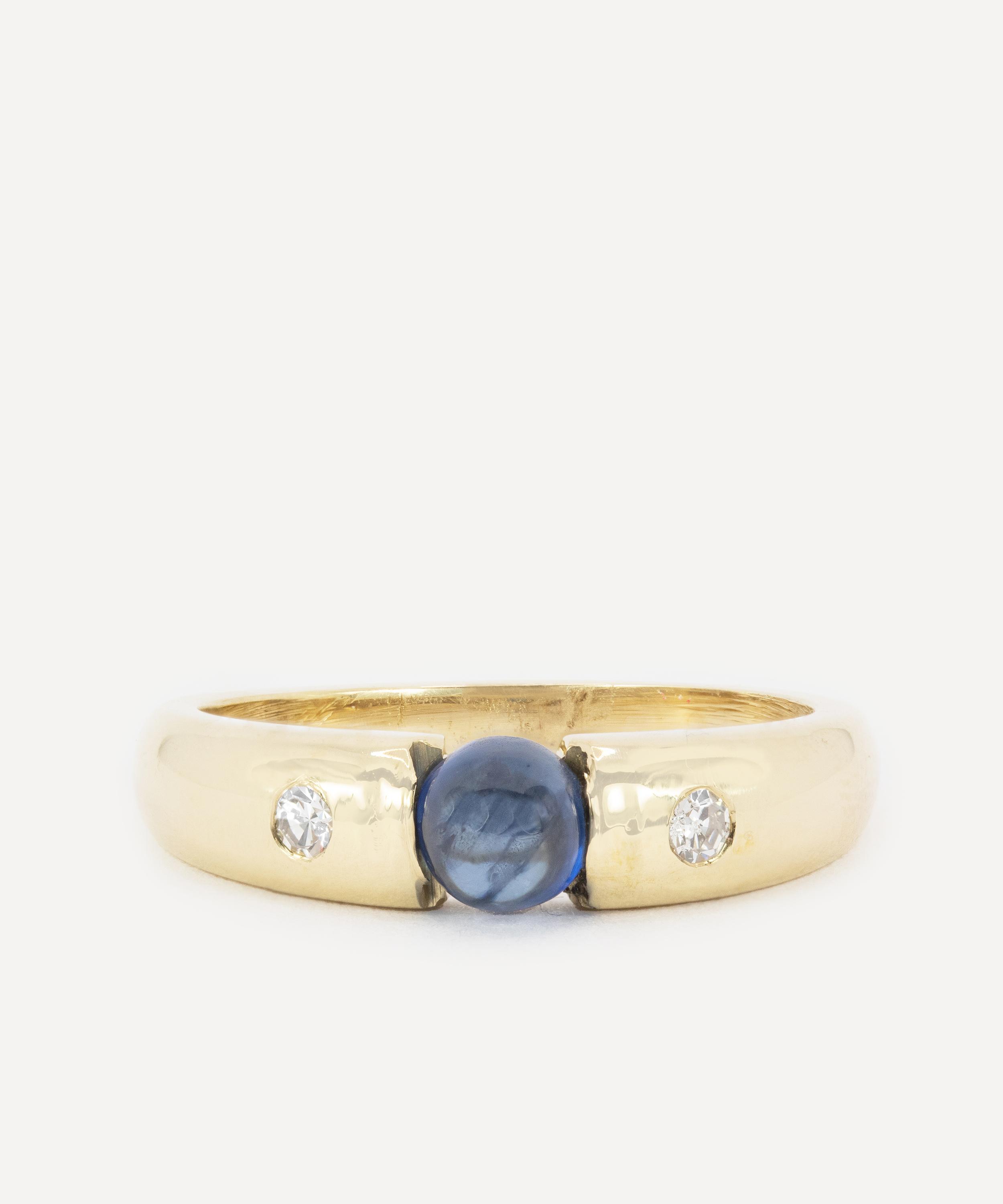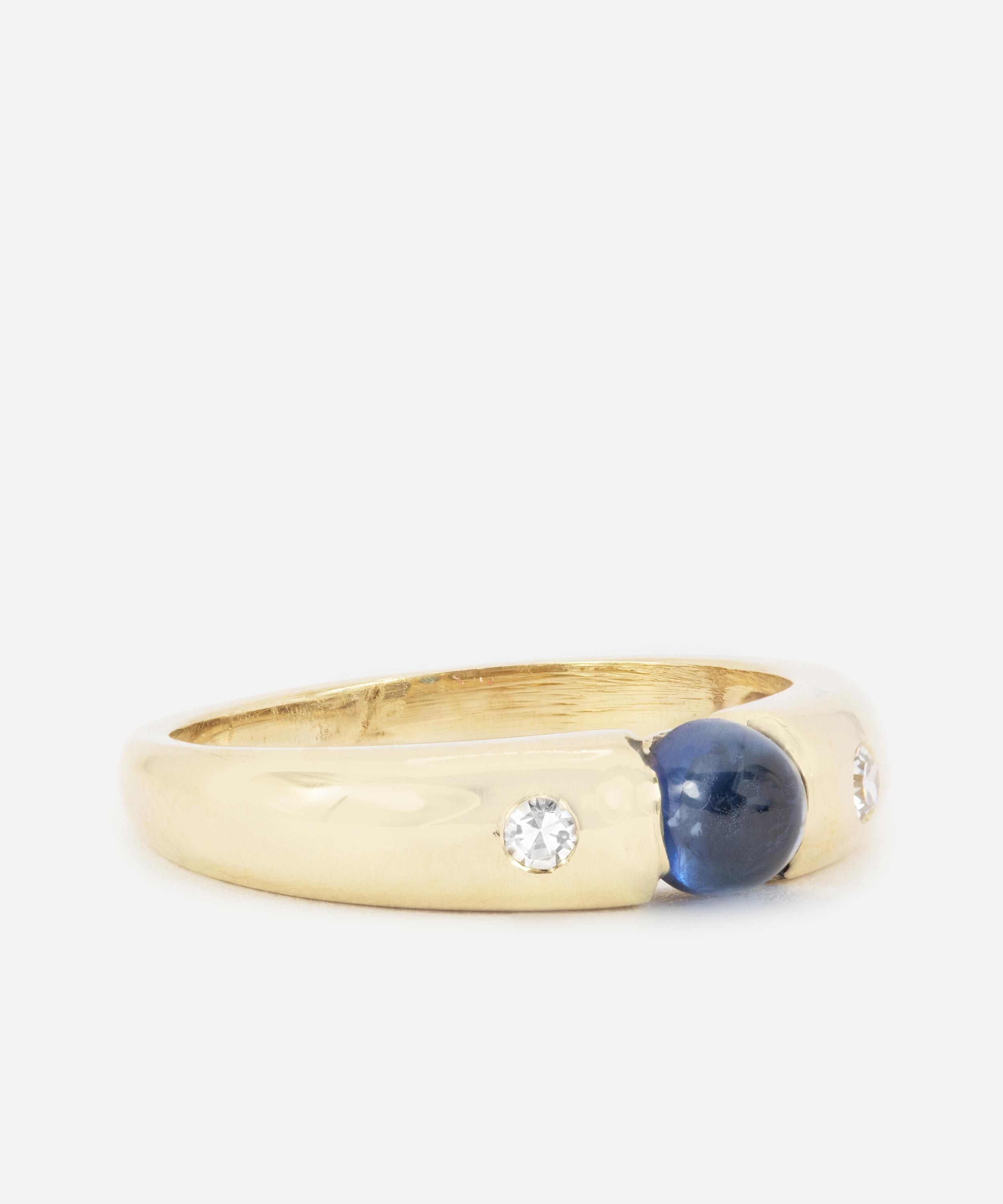 This vintage ring from antique purveyor Kojis is perfect for your everyday jewellery rotation. Crafted from 14ct gold, it features a cabochon-cut sapphire flanked by a flush set, single cut diamond on either side on the polished band.