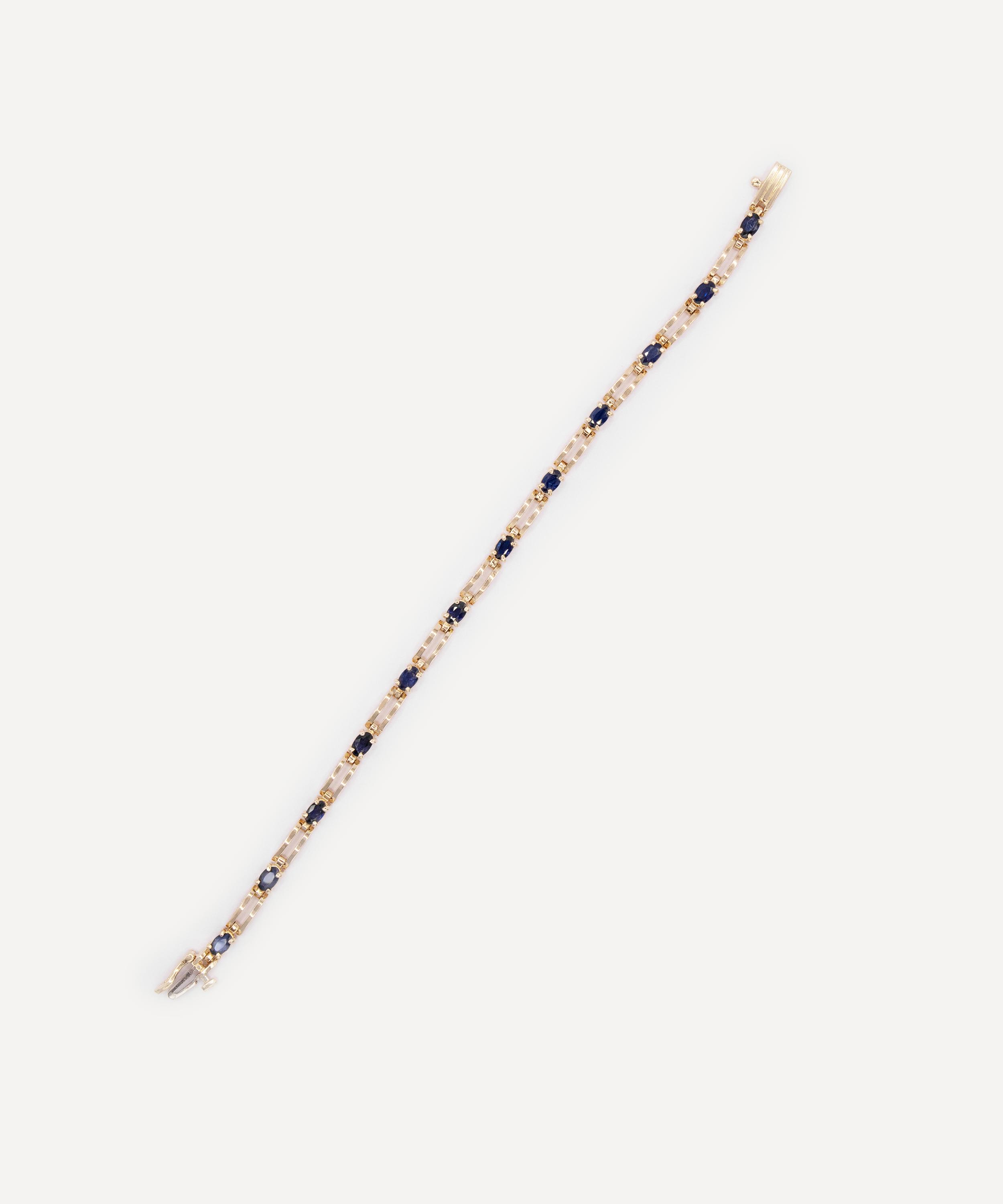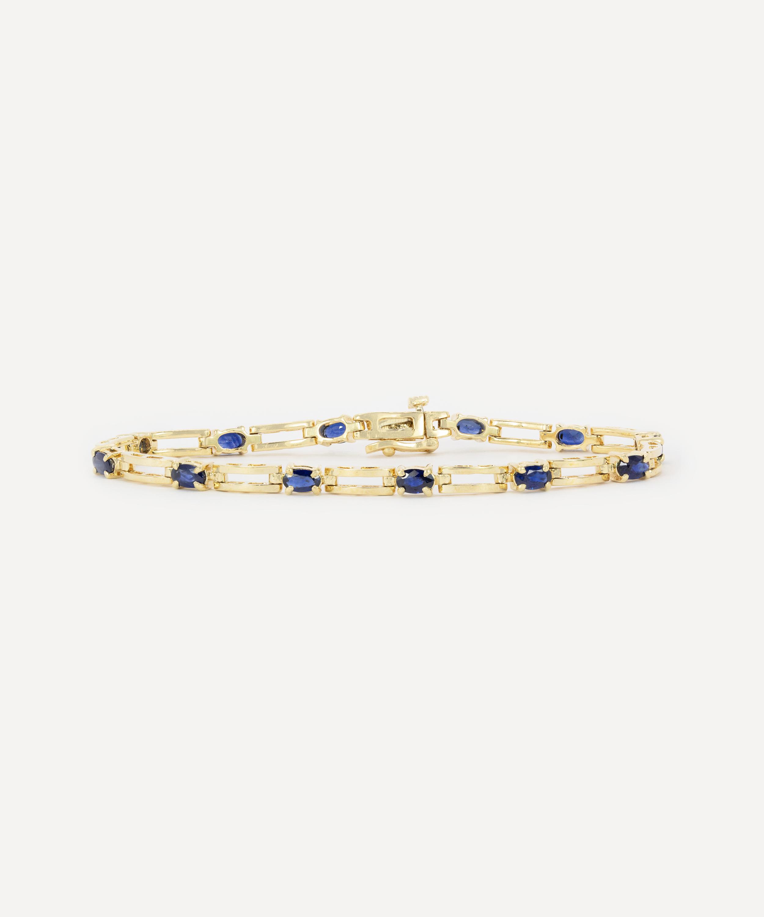 Perfect for stacking, this bracelet is a one-of-a-kind vintage piece from antique purveyor Kojis. Crafted from 14ct gold, it features a twelve oval cut sapphires, each separated by a gold rectangular open link.