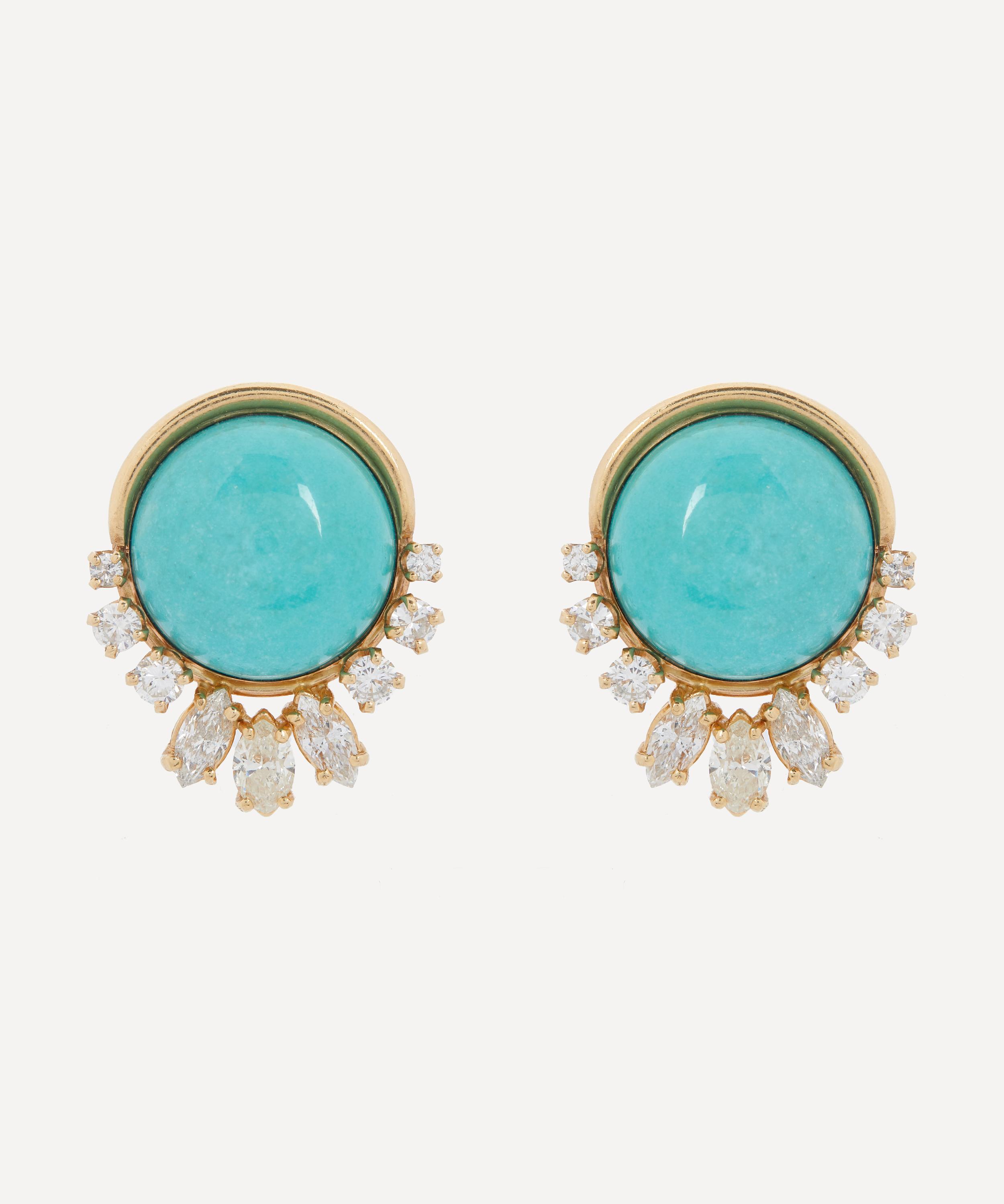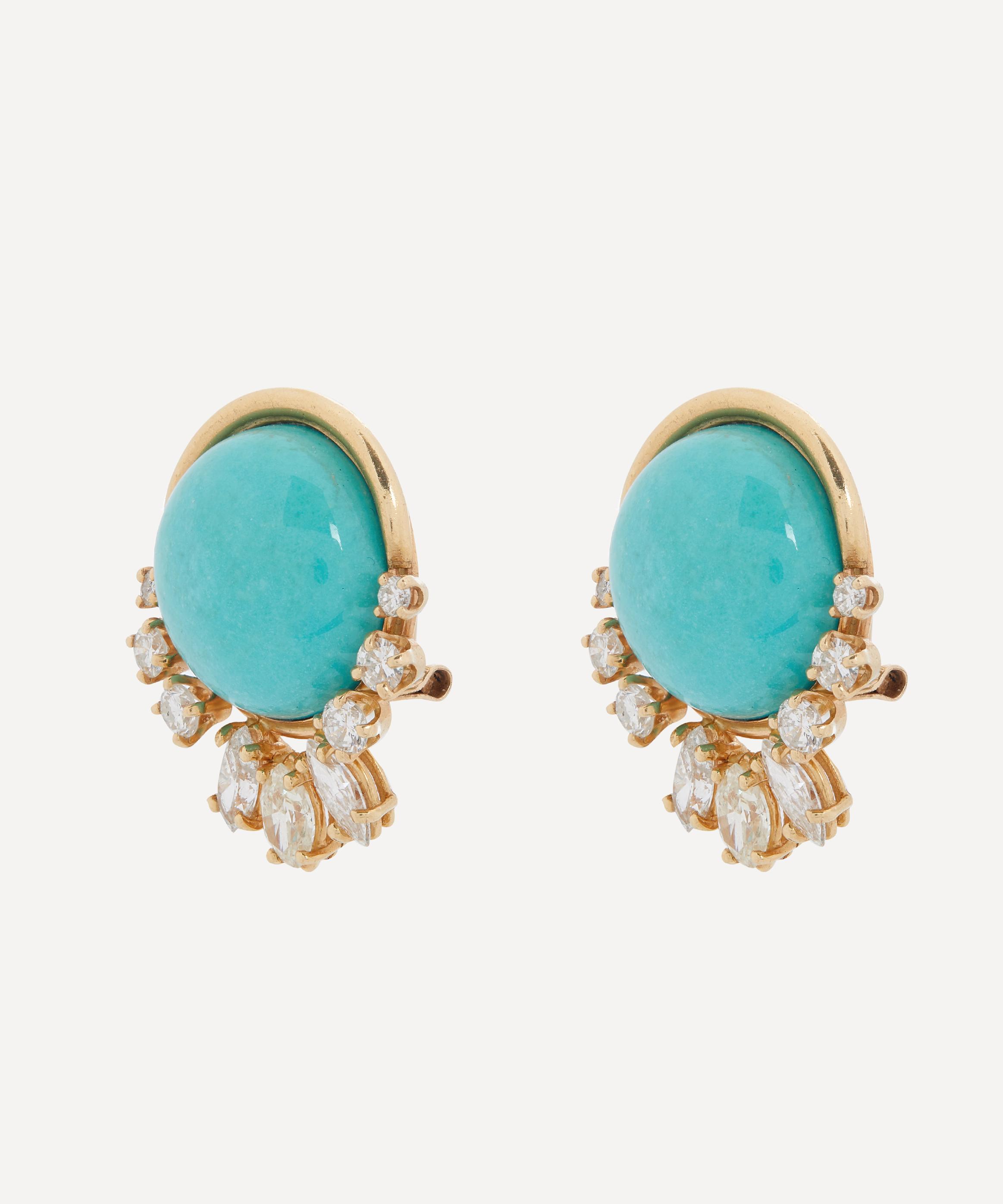 These vintage stud earrings from antique purveyor Kojis exude a luxurious presence, perfect for those special occasion looks. Crafted in 14ct gold, each earring is characterised by a round, cabochon turquoise stone, framed by brilliant-cut and marquise-cut diamonds on top of a high-polished bezel setting.