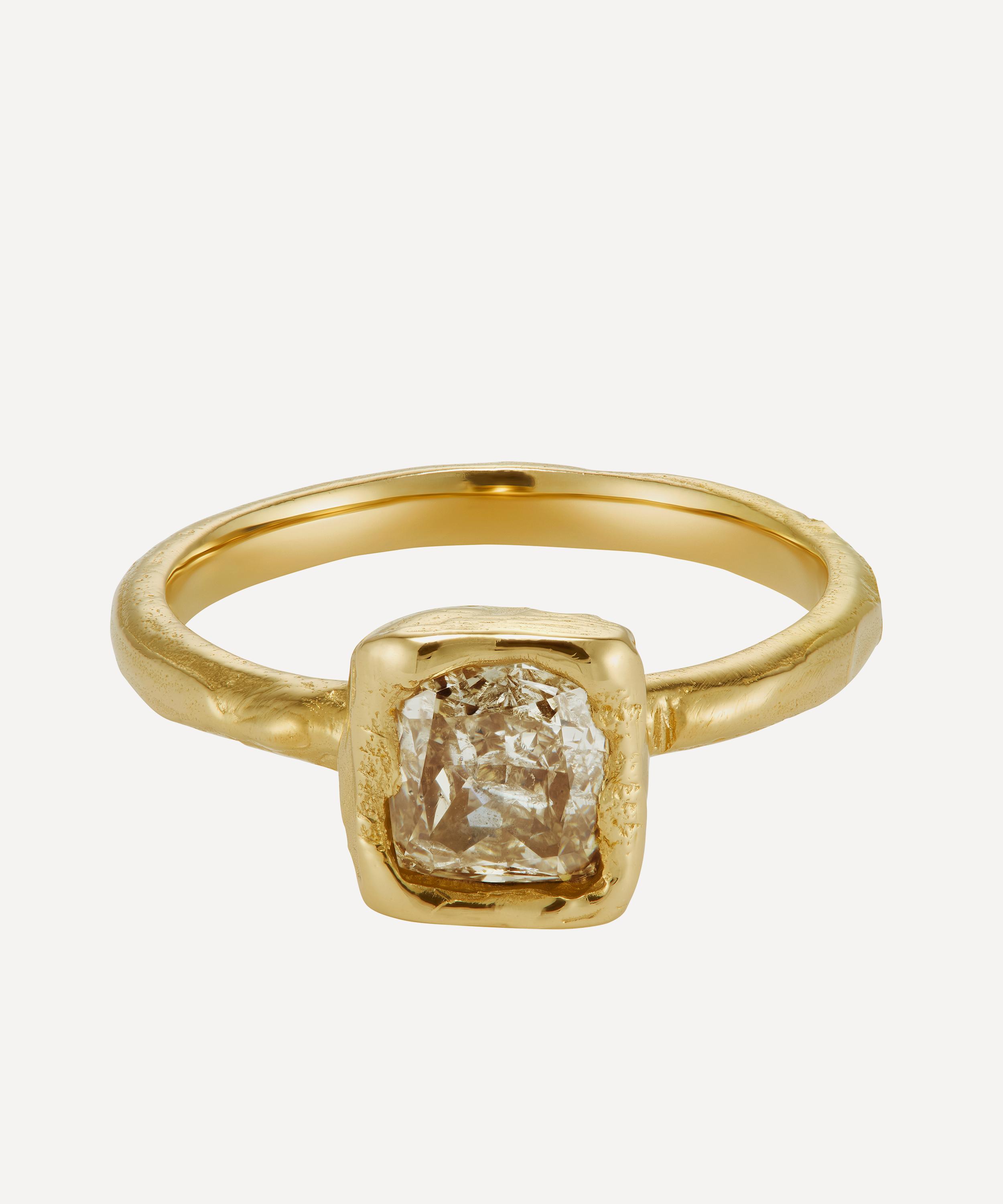 Inspired by medieval jewellery hoards found across Scotland, it features a cushion cut white diamond set in an organic, softly distressed texture, as if it has been uncovered like buried treasure. Ellis Mhairi Cameron pieces are designed to form sculptural stacks – pair with a wedding band from the collection for the full statement look.