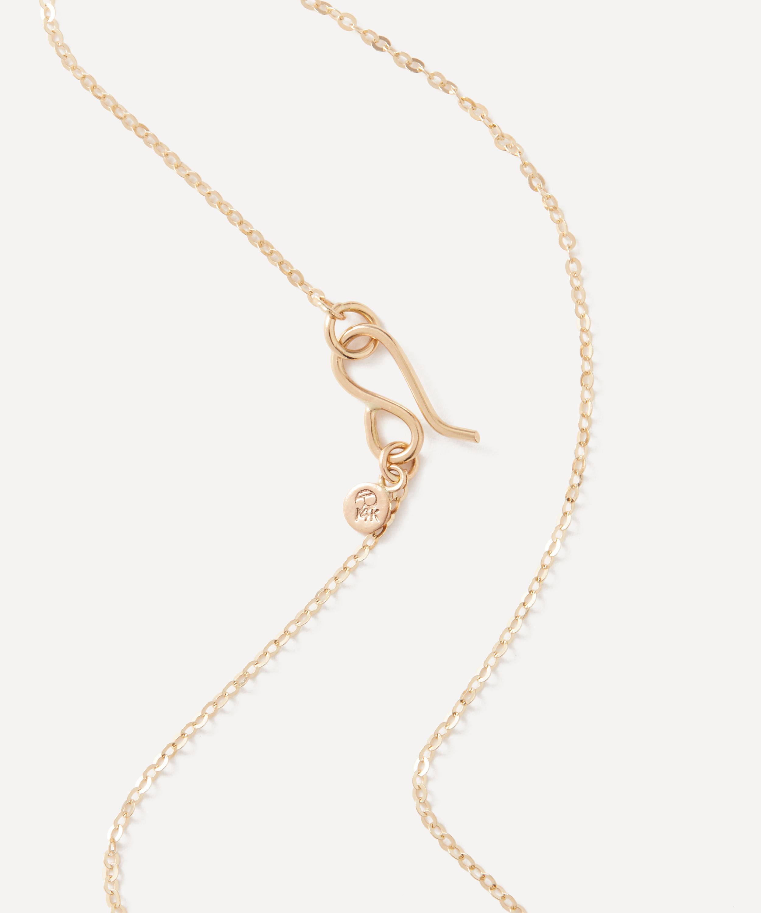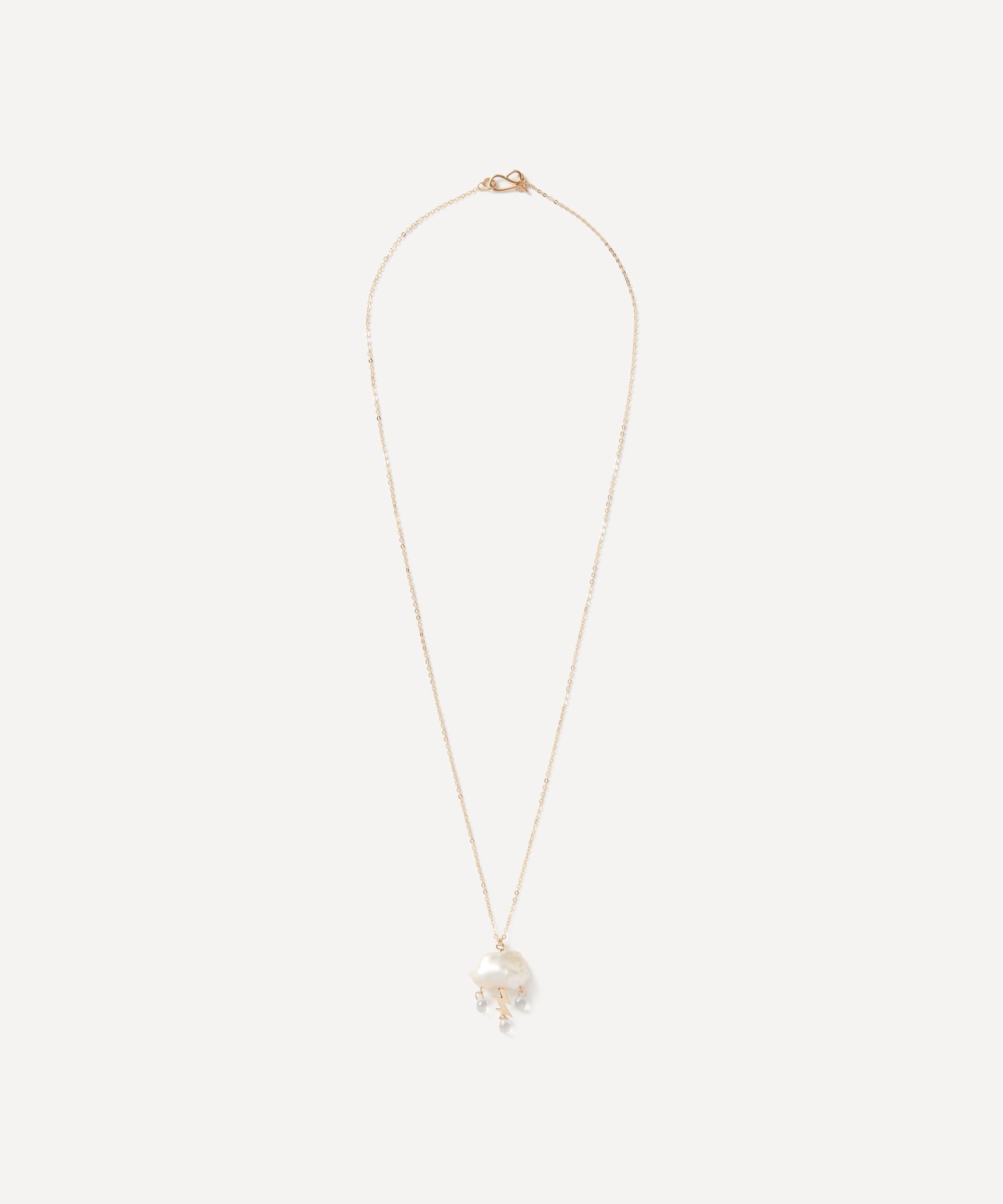 Handmade in the brand’s LA studio, it is strung with a white keshi pearl cloud electrified by 14ct gold lightning bolts. Clear topaz gemstones that mimic falling raindrops add movement to the design. Wear it solo as a conversation starter or pair it with matching earrings from the Clouds collection.