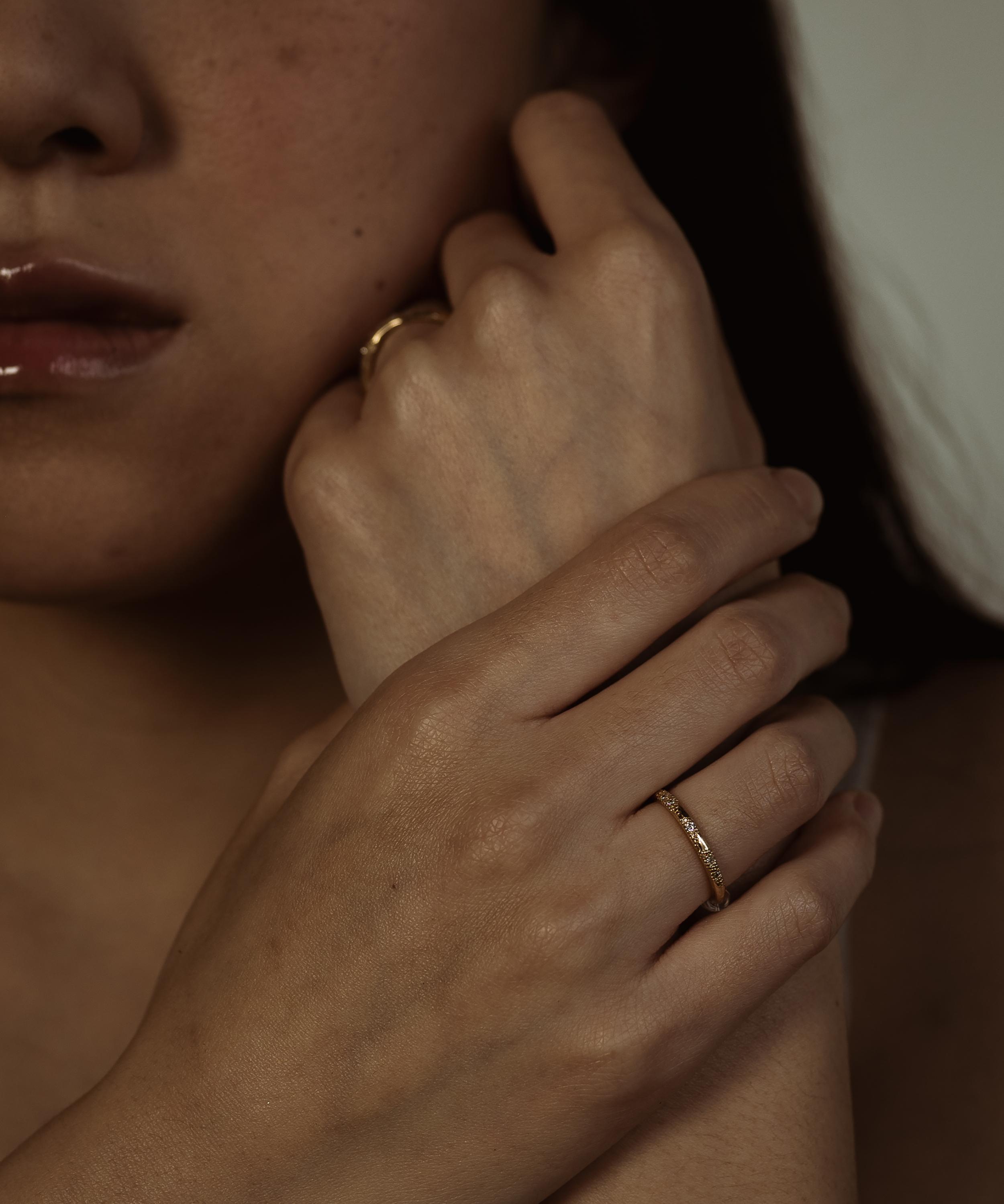 Embodying opulence with an edge, the 14ct Gold X 2mm White Diamond Scatter Ring from fine jewellery brand Ellis Mhairi Cameron is a fresh take on an wedding ring or an elevated addition to your daily edit.