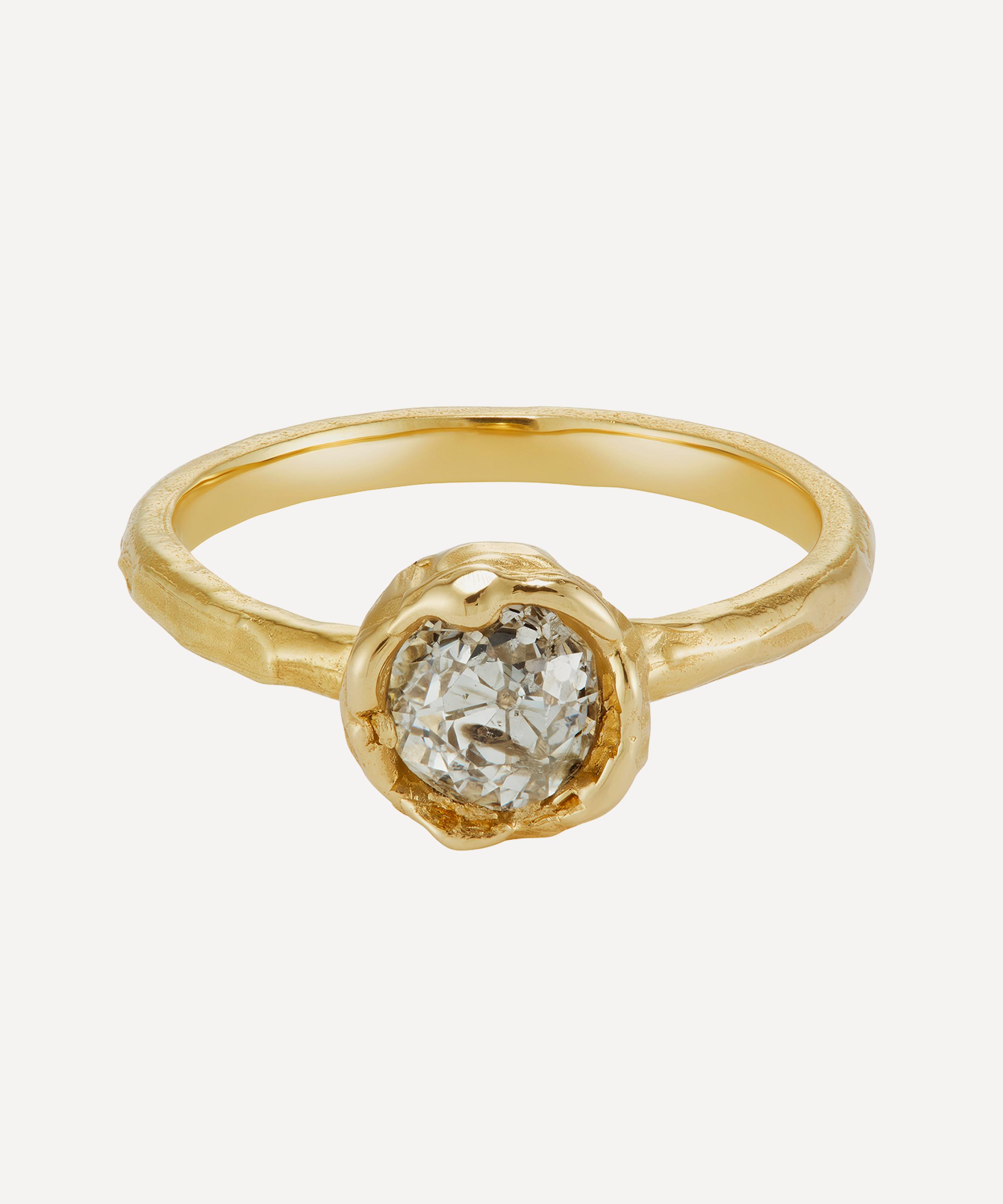 Crafted from softly distressed 14ct gold, this engagement ring is set with a single old cut diamond with a one-of-a-kind faceted finish. Spotlighting an interplay of contrasting textures, it can be styled as a solo piece or as a sculptural stack with other rings.